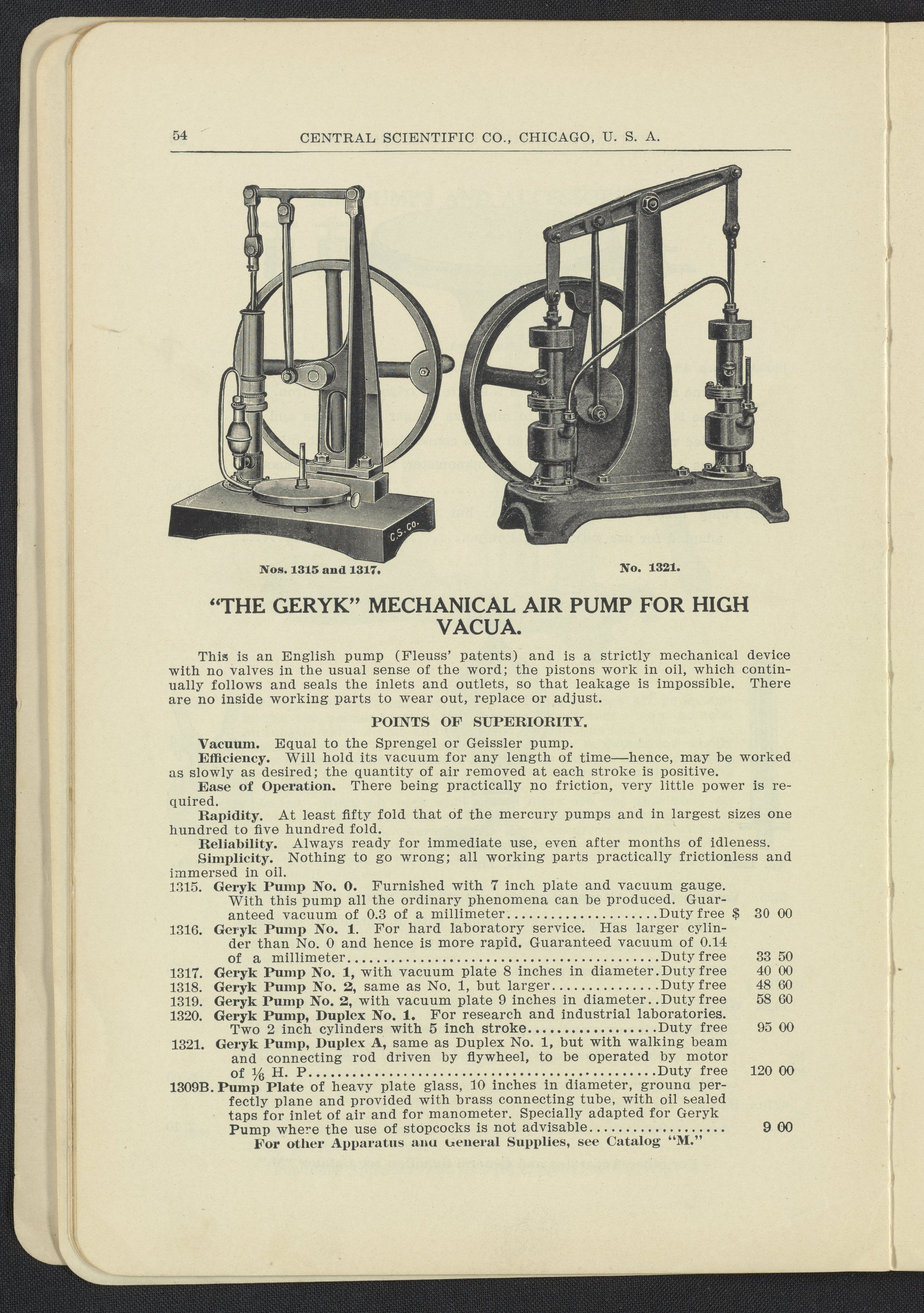 Central Scientific Company. “‘The Geryk’ Mechanical Air Pump for High Vacua.” Physical Apparatus for Universities and Colleges Manufactured and Imported by Central Scientific Co. Chicago, Illinois: Evening Wisconsin Printing Company, 1912. Science History Institute. Philadelphia. https://digital.sciencehistory.org/works/ucu9d1r.