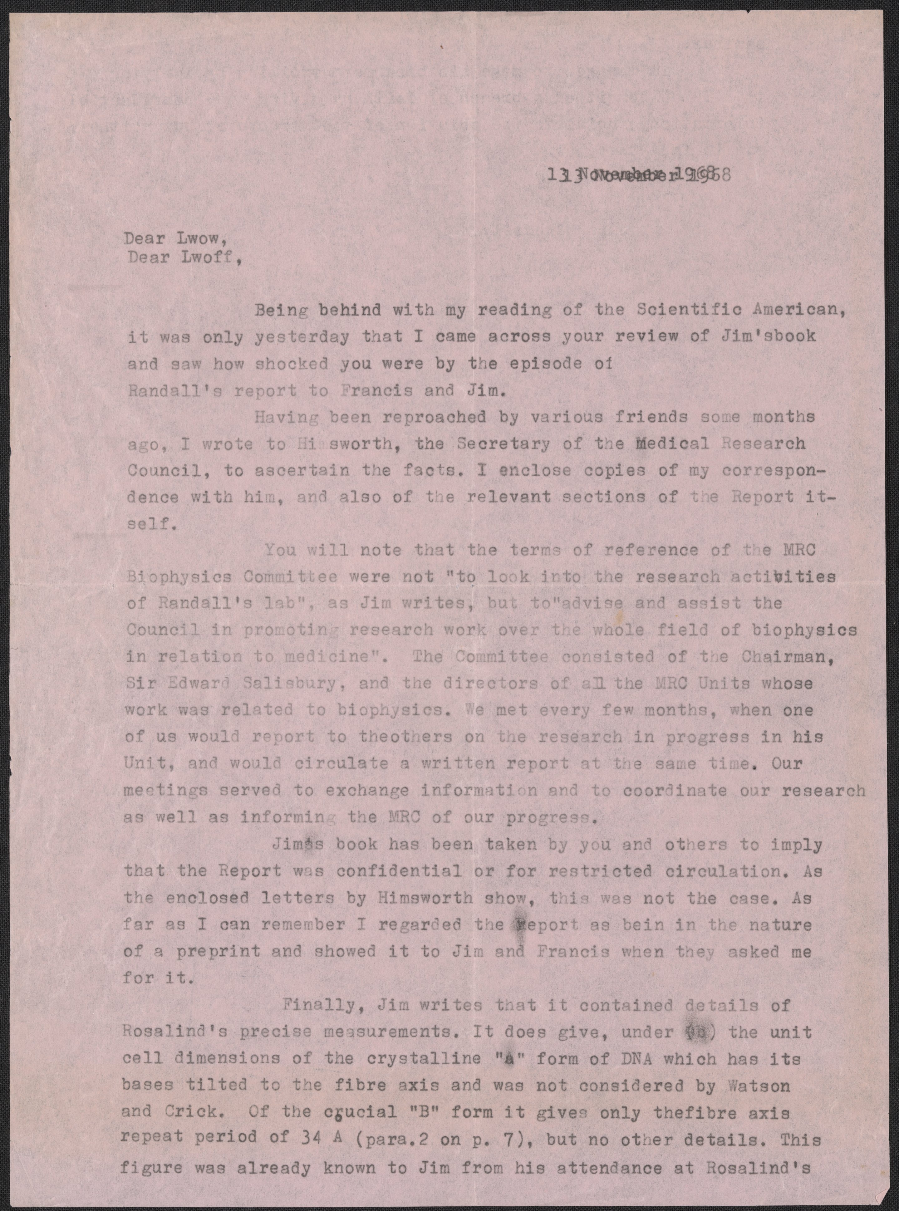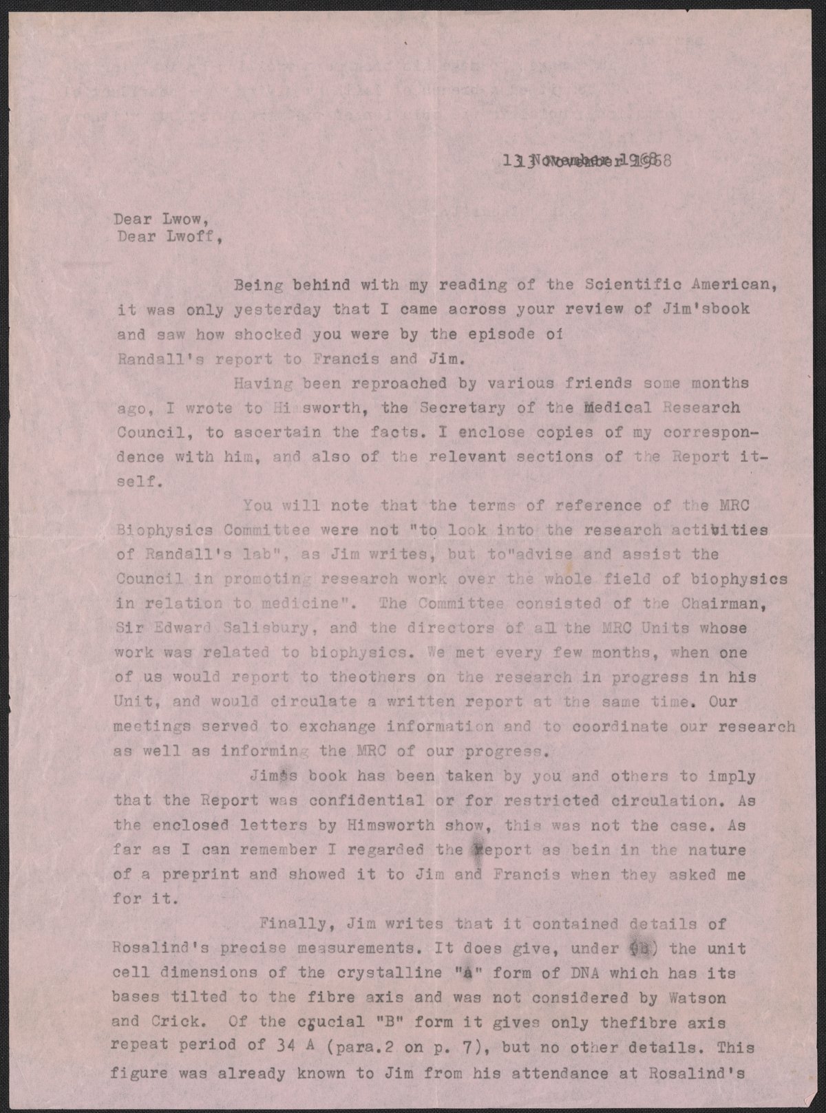 Letter from Max Perutz to André Lwoff , November 13, 1968