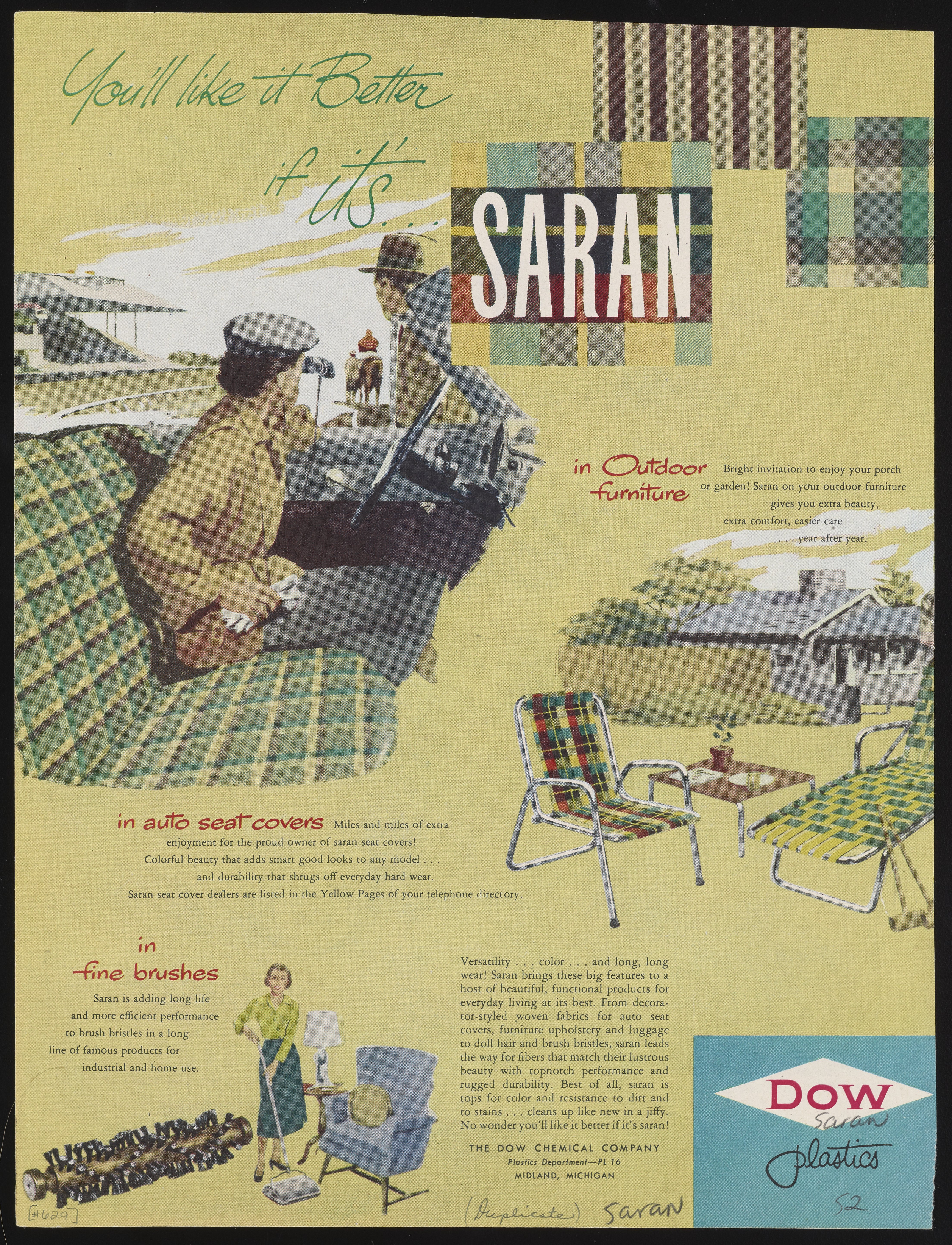Dow Chemical Company. “You'Ll Like It Better If It's Saran,” circa 1952. Advertisements from the Dow Chemical Historical Collection, Box 9. Science History Institute. Philadelphia. https://digital.sciencehistory.org/works/uffufxn.