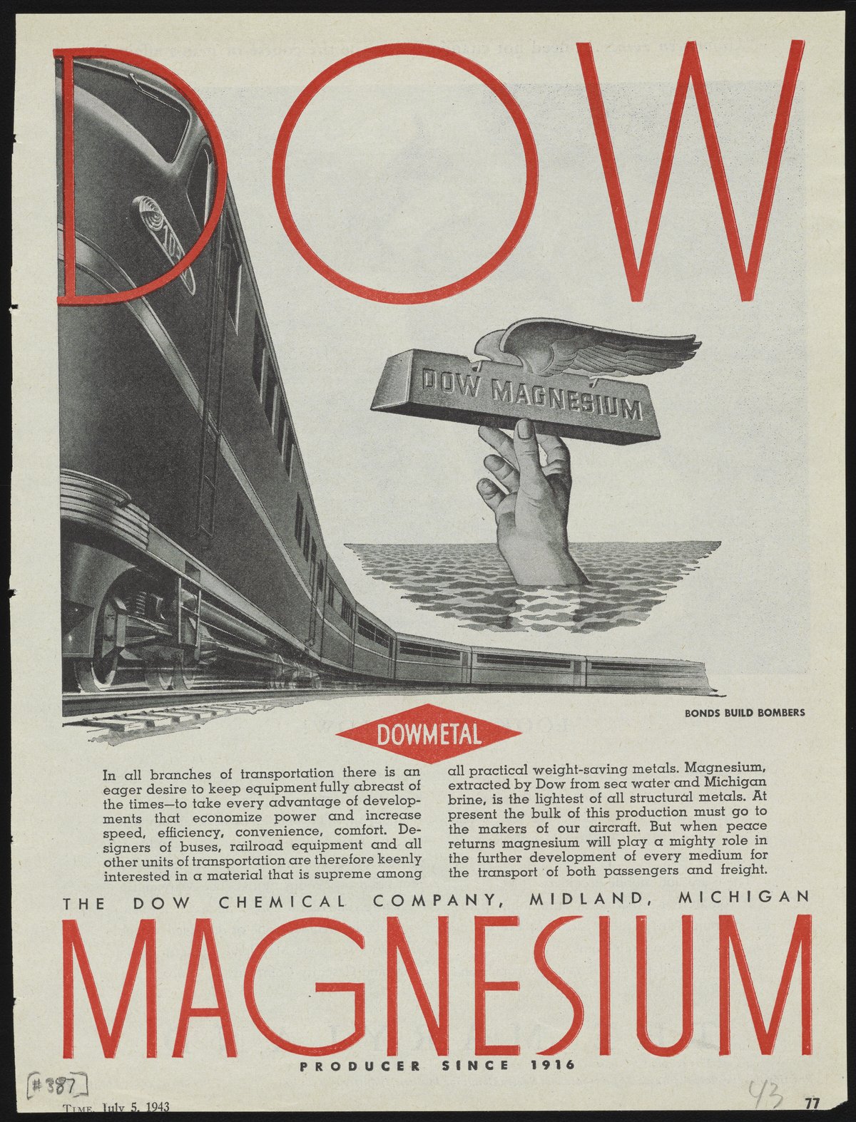 Print advertisement for Dowmetal, a magnesium alloy manufactured and sold by the Dow Chemical Company. The advertisement features an illustrated depiction of a train in motion alongside a hand lifting a winged ingot of magnesium from the sea. The accompanying text details Dow's extraction of magnesium from seawater and the use of Dowmetal in transportation industries, particularly the wartime production of aircraft. This advertisement appeared on page 77 of the July 5, 1943 edition of Time.