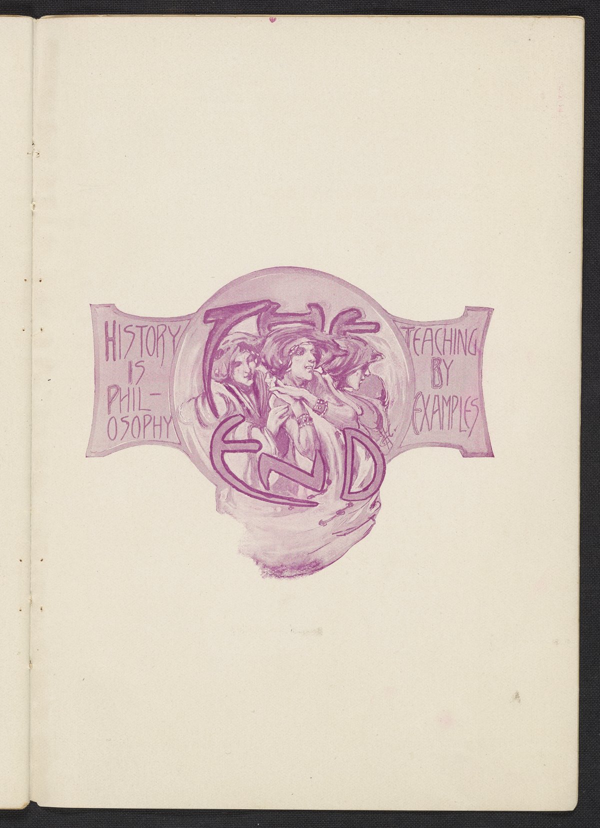 A decorative end mark denoting the end of the book. Depicts three females in a globe-like cartouche flanked with the statements "History is Philosophy" and "Teaching by Examples."