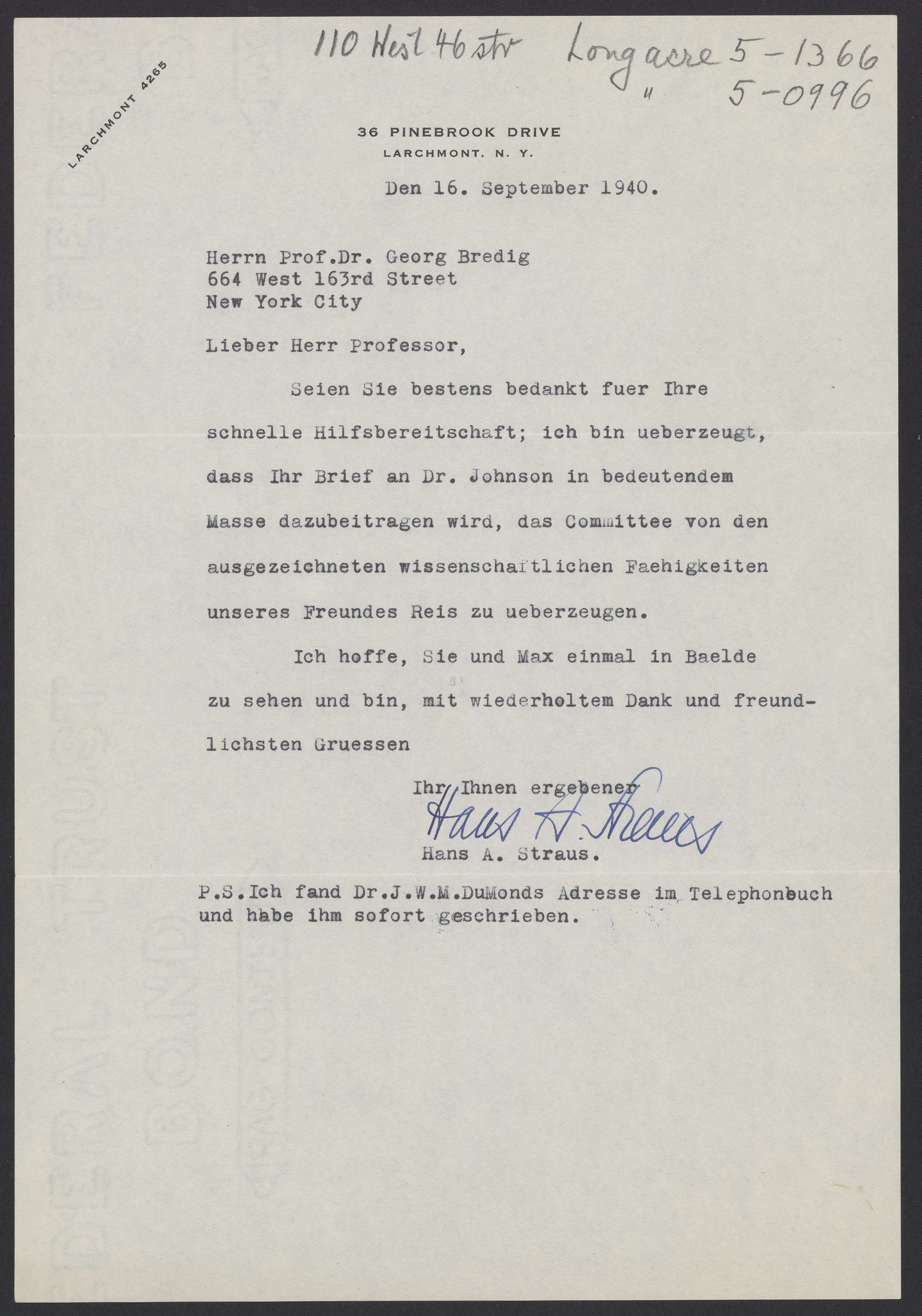 Letter from Hans A. Straus to Georg Bredig, September 16, 1940