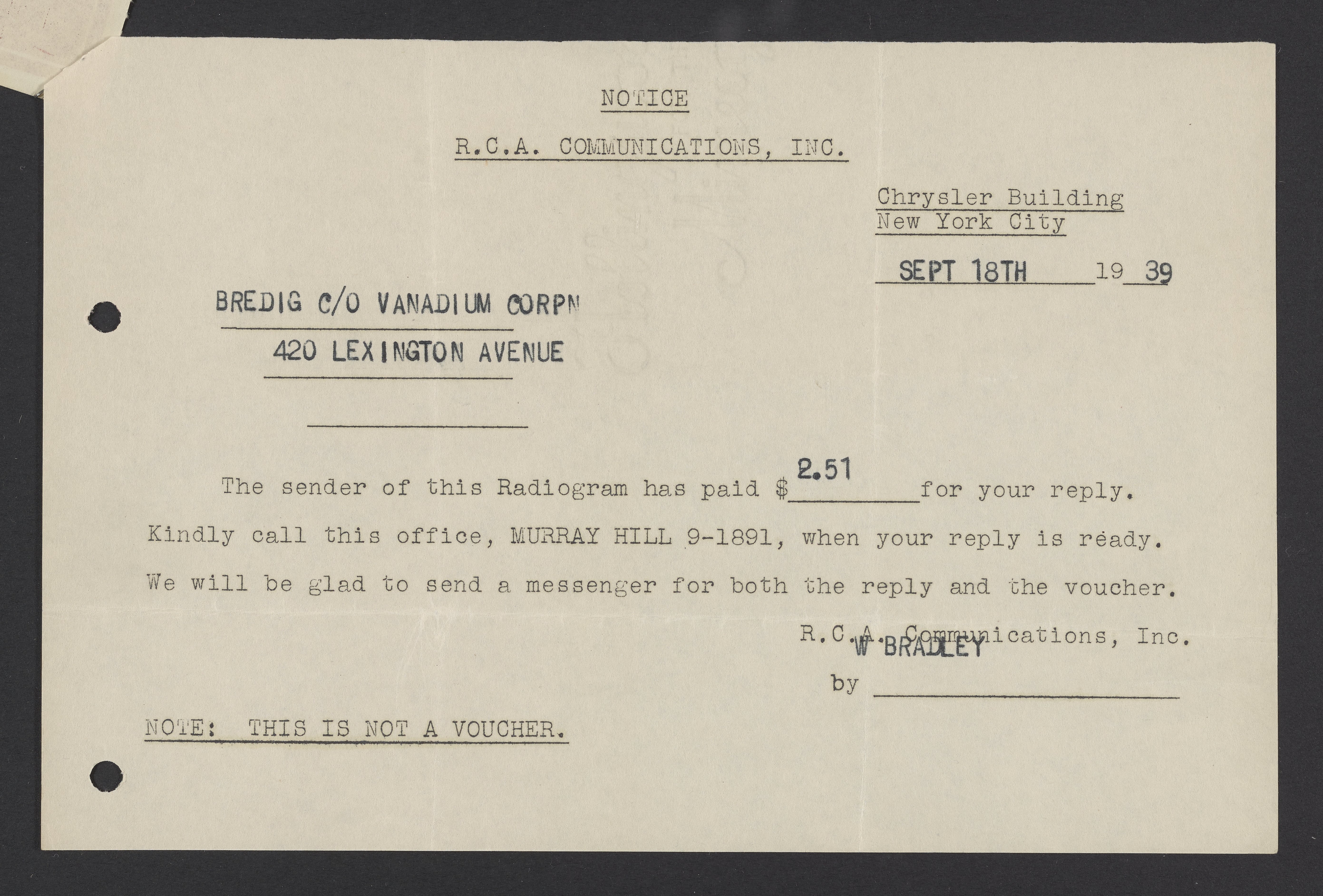 Bredig, Georg. “Radiogram from Georg Bredig to Max Bredig, September 18, 1939,” September 18, 1939. Papers of Georg and Max Bredig, Box 7, Folder 15. Science History Institute. Philadelphia. https://digital.sciencehistory.org/works/uoeae9x.