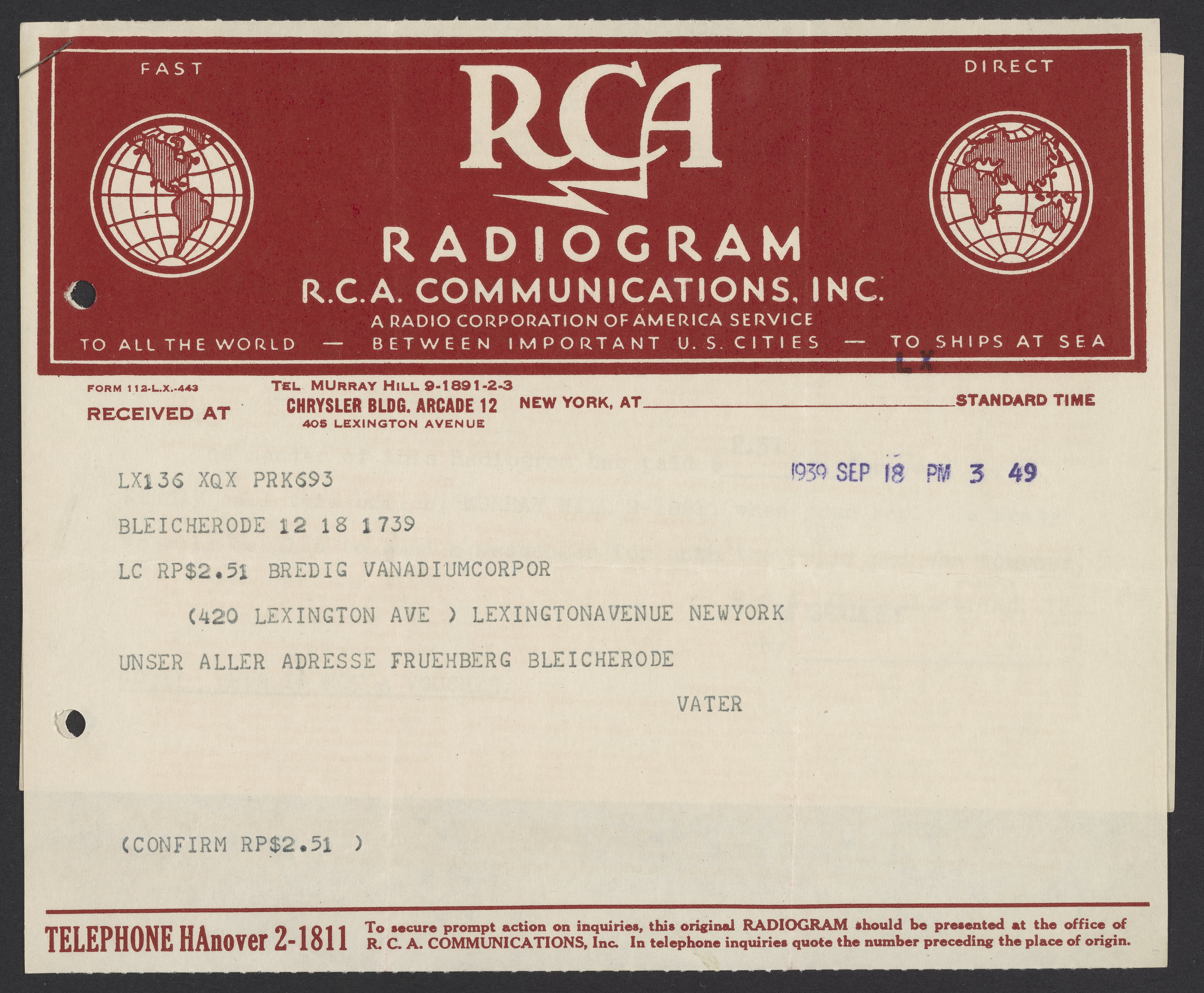 Radiogram from Georg Bredig to Max Bredig, September 18, 1939