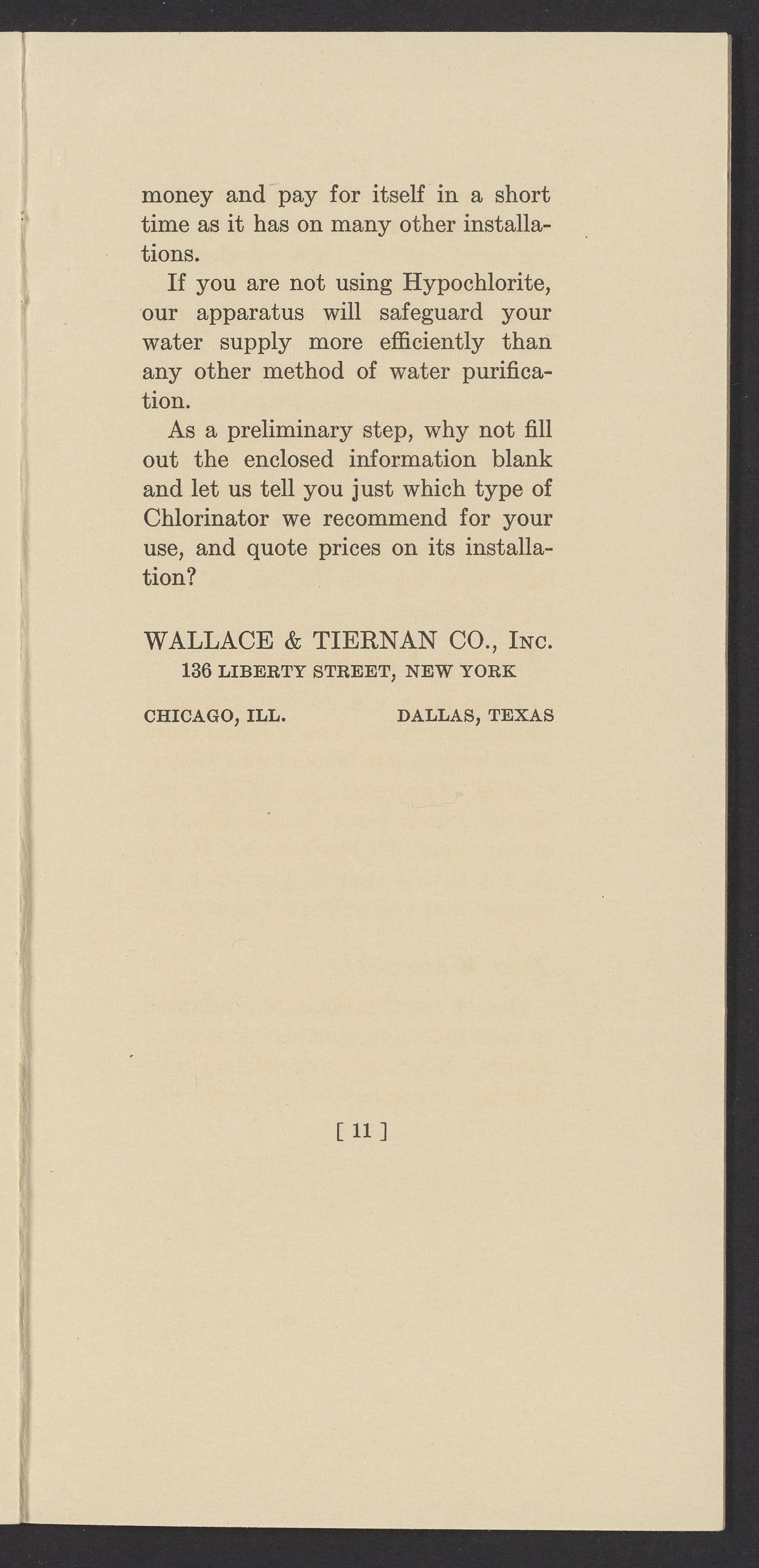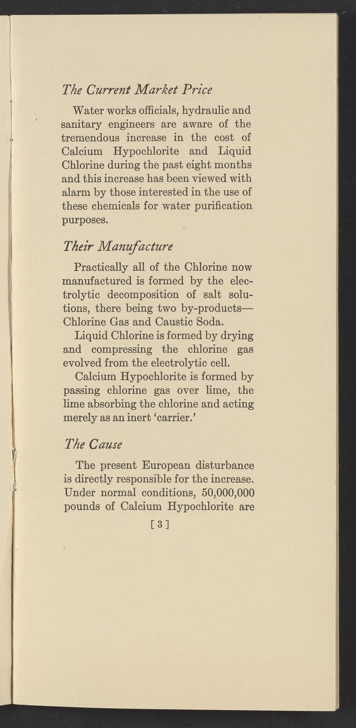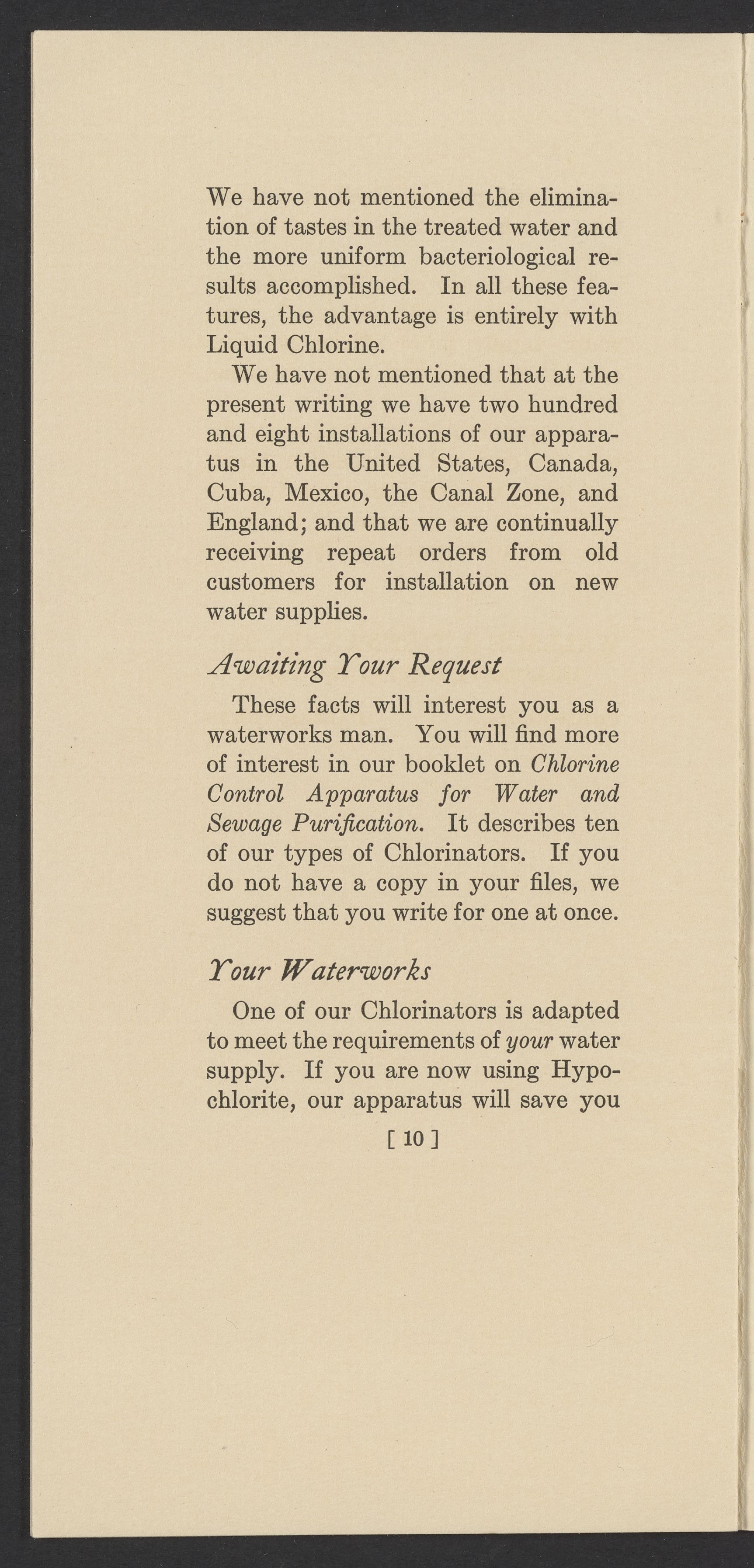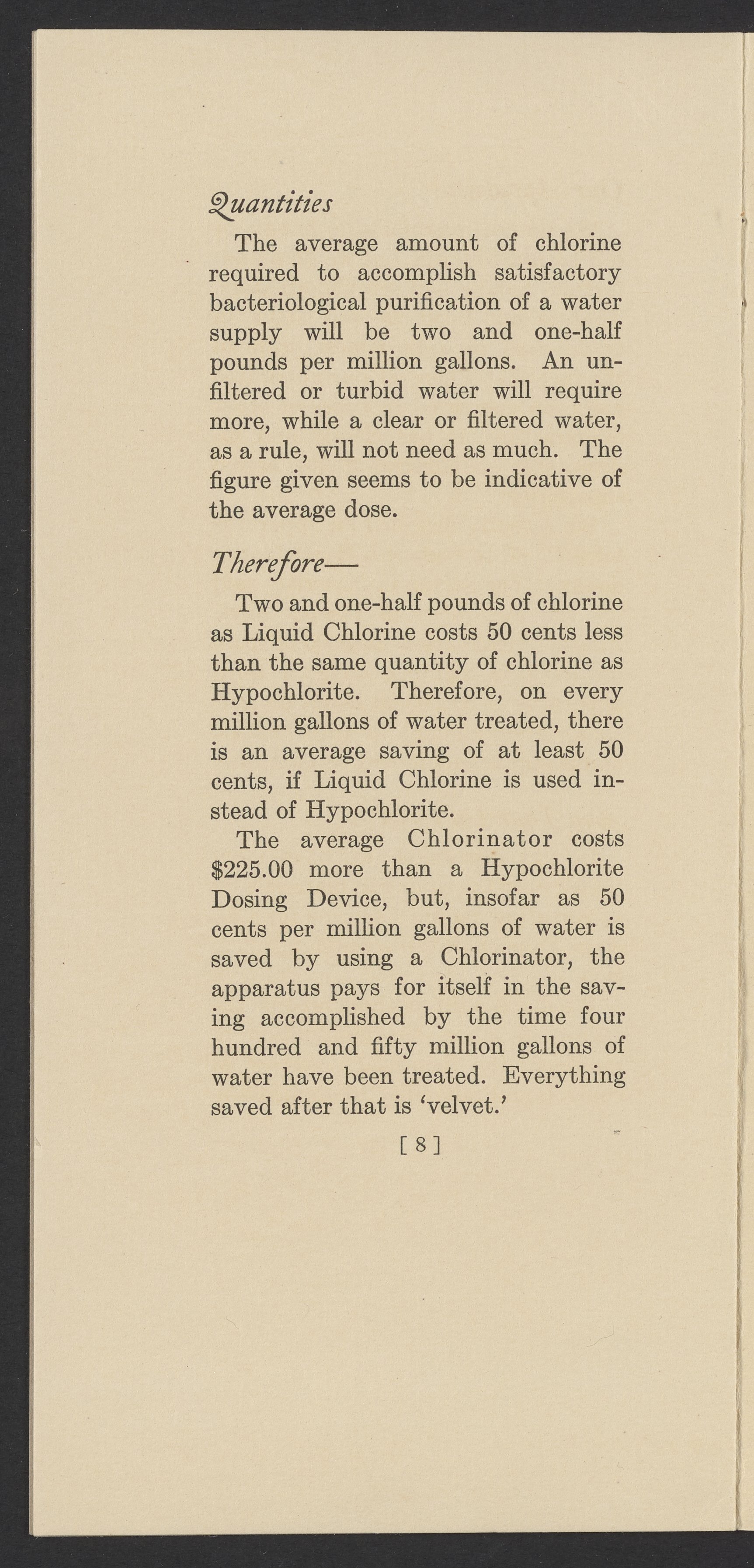 Small JPG1200 x 2437px — 420 KBFull-sized JPG1764 x 3582px — 928 KBOriginal fileTIFF — 1764 x 3582px — 18.1 MBTechnical publication pamphlet providing a cost analysis of liquid chlorine and hypochlorite products. Discusses the increase in chlorine chemical costs, and the price of water purification apparatus. Underscores the financial advantages of liquid chlorine and Wallace & Tiernan chlorinators. The work is digitized in its entirety.