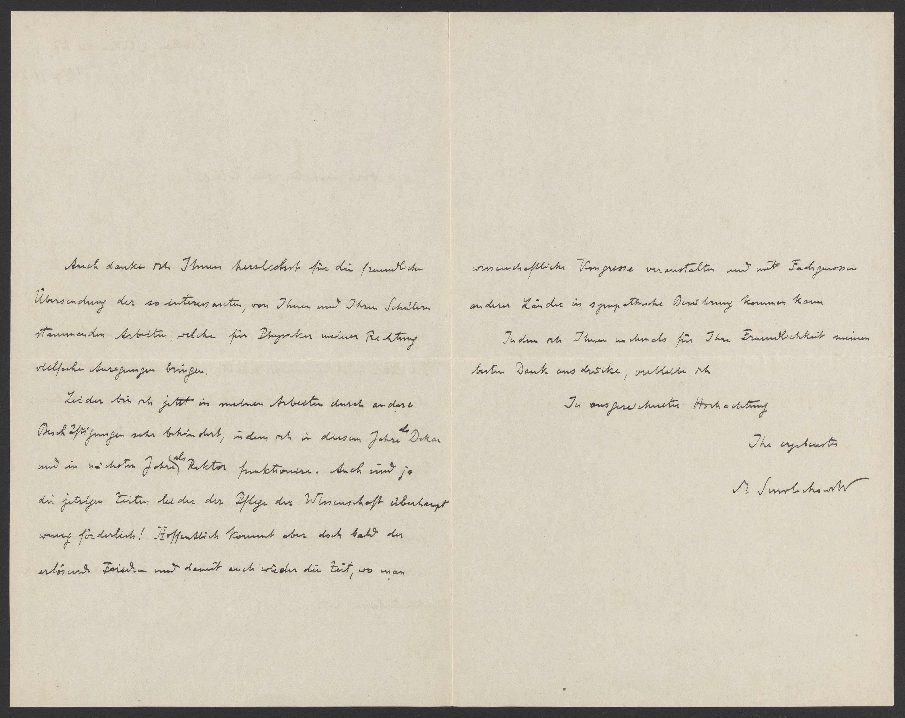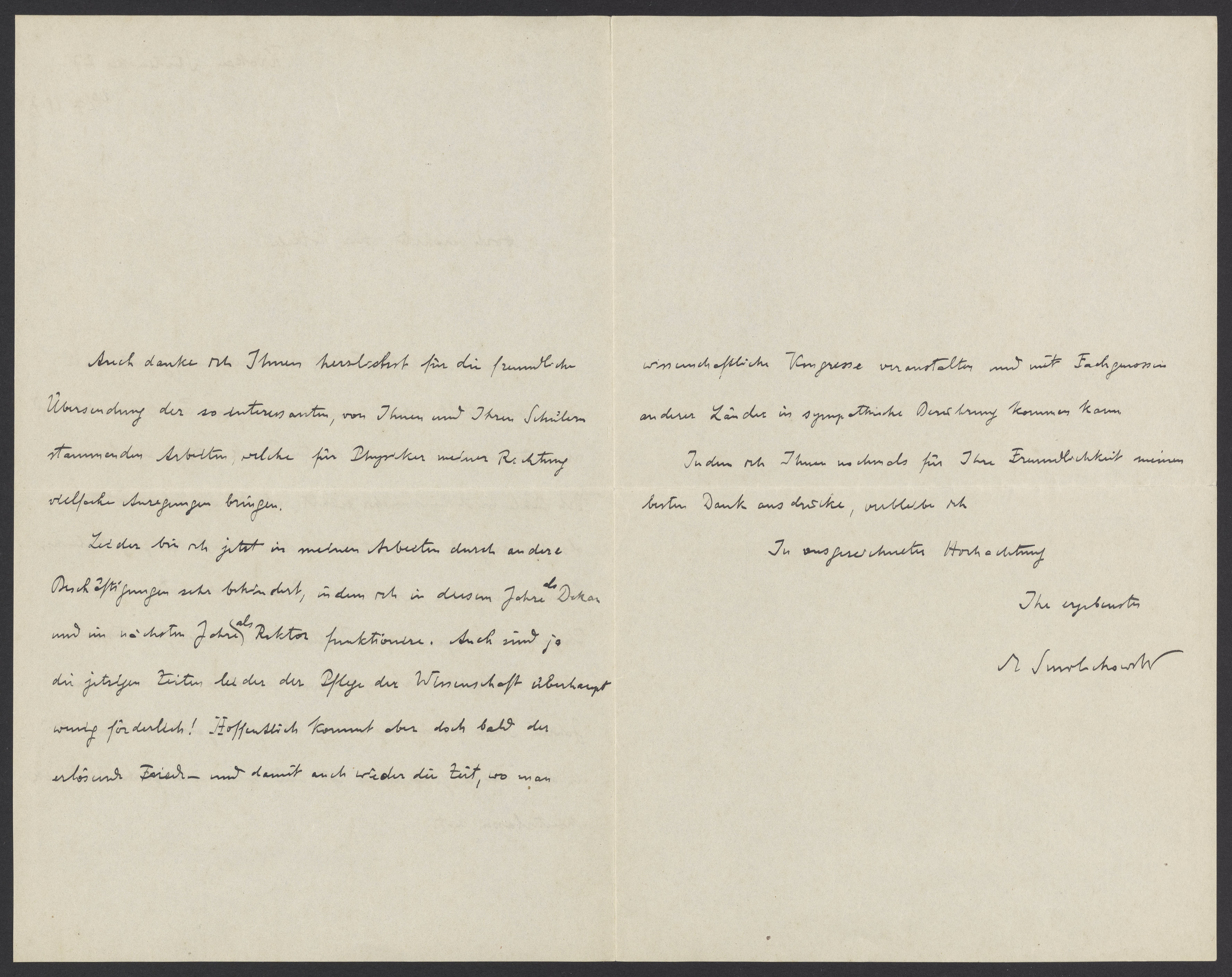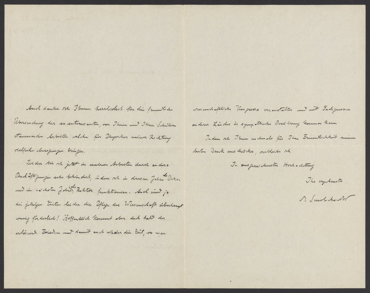 Leider bin ich jetzt in meinen Arbeiten durch andere Beschäftigungen sehr behindert, in dem ich in diesem Jahre als Dekan und im nächsten Jahr als Rektor funktionieren. Auch sind ja die jetzigen Zeiten bei der Pflege der Wissenschaft überhaupt wenig förderlich! Hoffentlich kommt aber doch bald der erlösende Frieden und damit auch wieder die Zeit, wo man