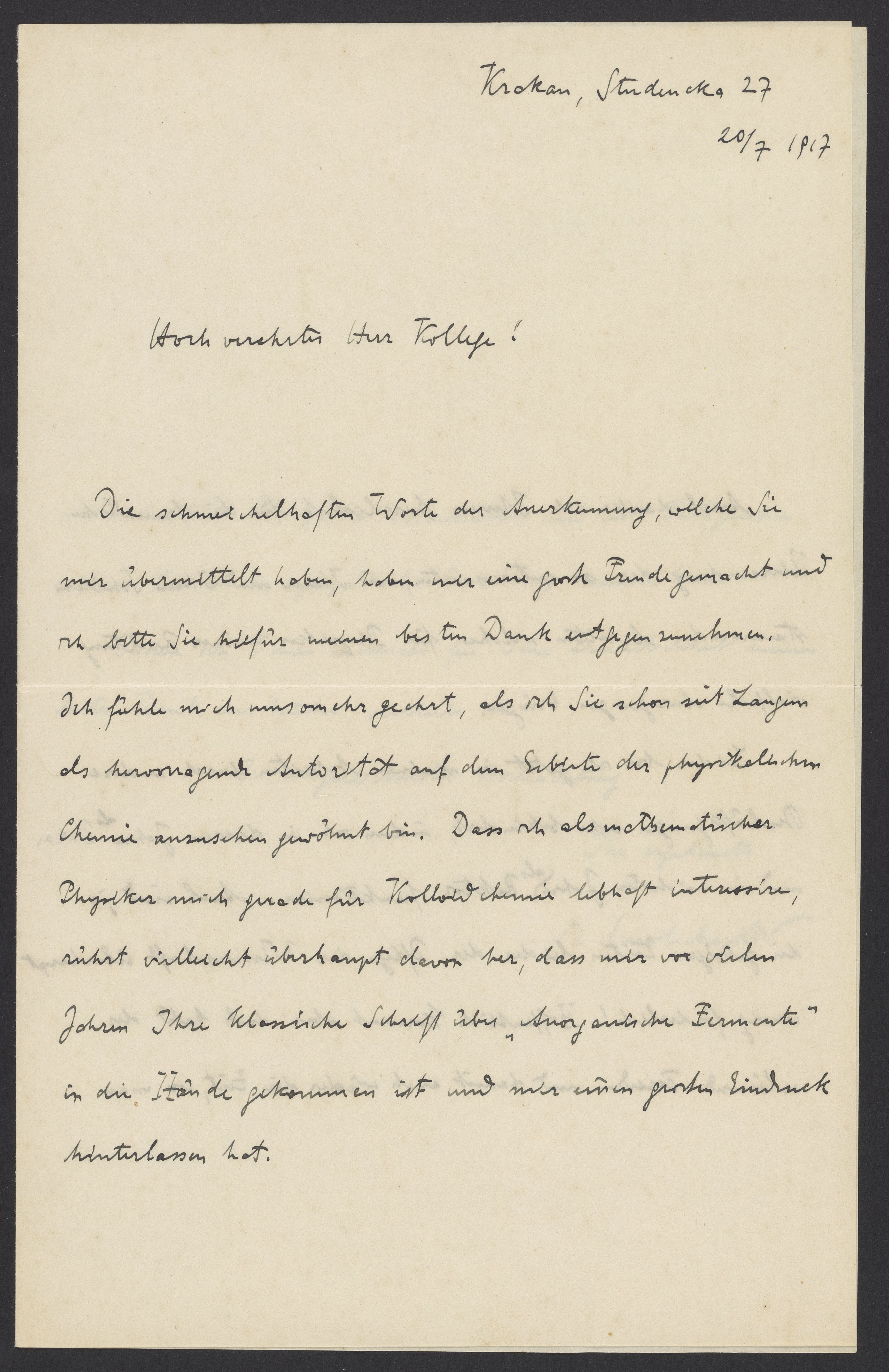 Die schmeichelhaften Worte der Anerkennung, welche Sie mir übermittelt haben, haben mir eine große Freude gemacht und ich bitte Sie dafür meinen besten Dank entgegen zukommen. Ich fühle mich umso mehr geehrt, als ich Sie schon seit Langem als hervorragende Antwort auf dem Gebiete der physikalischen Chemie anzusehen gewöhnt bin. Dass ich als mathematischer Physiker mich gerade für Kolloidchemie lebhaft interessieren, rührt vielleicht überhaupt davon her, dass mir vor vielen Jahren Ihre klassische Schrift über „Anorganische Fermente“ in die Hände gekommen ist und mir einen guten Eindruck hinterlassen hat.