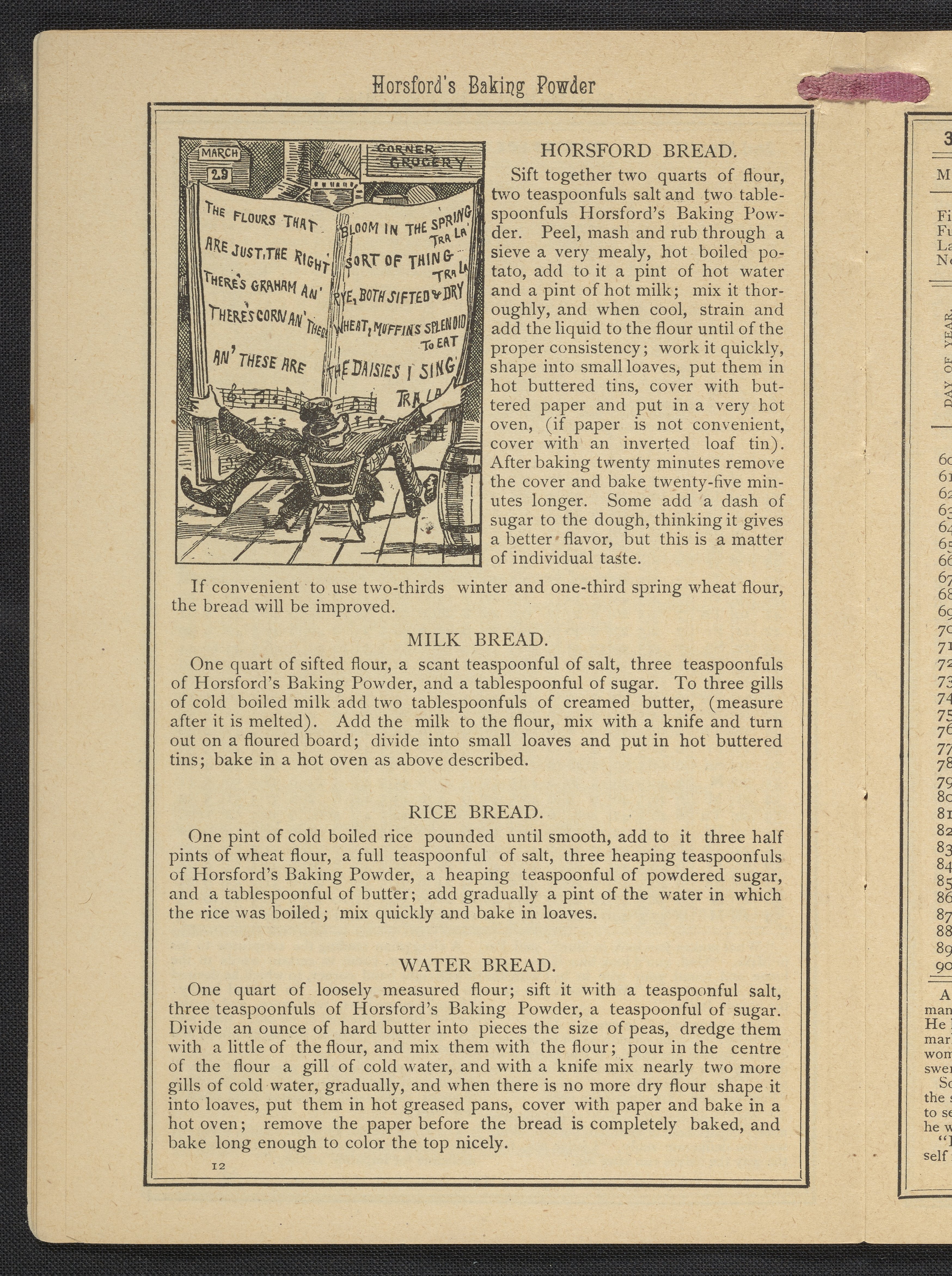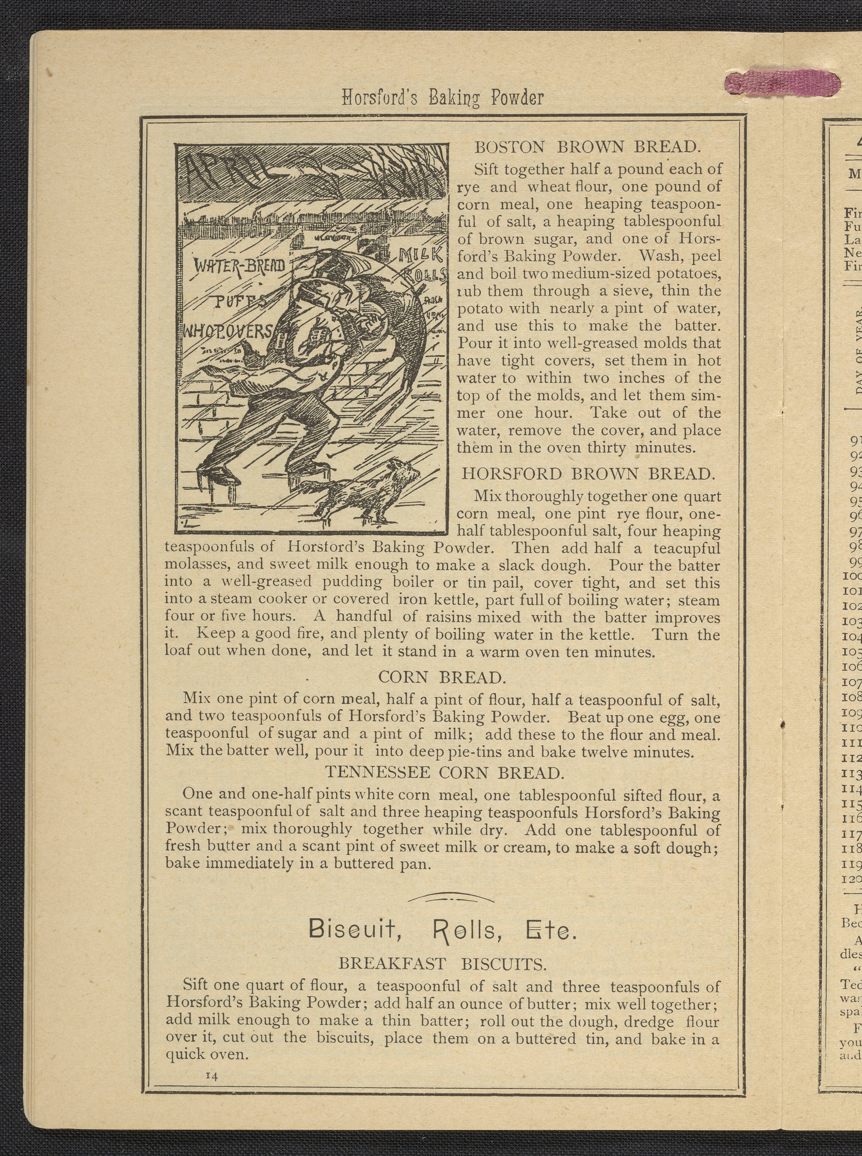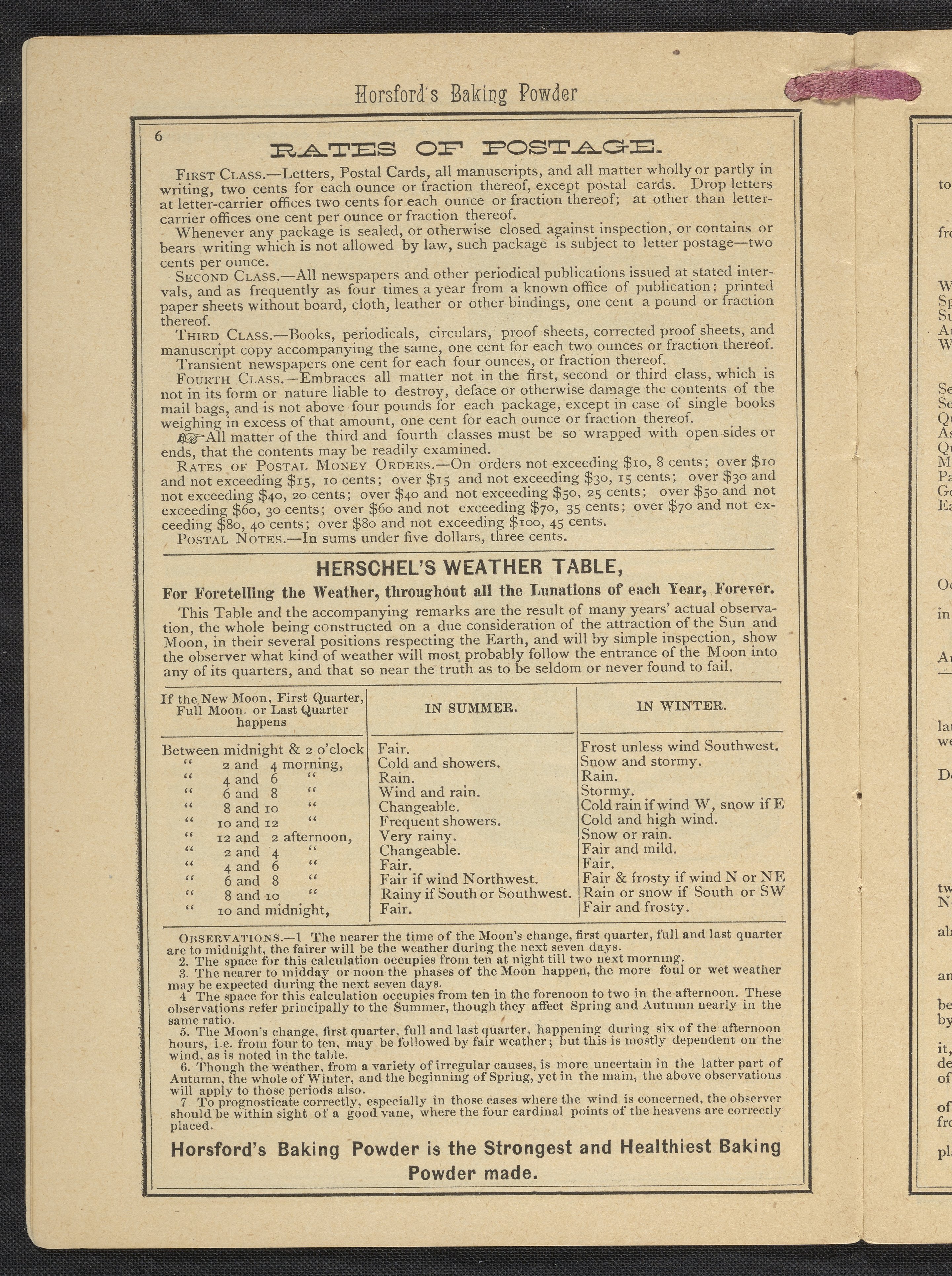 Small JPG1200 x 1669px — 634 KBLarge JPG2880 x 4005px — 3.2 MBFull-sized JPG3483 x 4843px — 4.4 MBOriginal fileTIFF — 3483 x 4843px — 48.3 MBPublished by Rumford Chemical Works, this almanac features advertisements for Professor Horsford's baking powder and acid phosphate along with other products manufactured by Rumford Chemical Works. Also includes "Herschel's Weather Table" for predicting the weather. Each month features recipes and/or household hints along with seasonal illustrations focusing on farming, baking, gathering fruit and baked goods.
