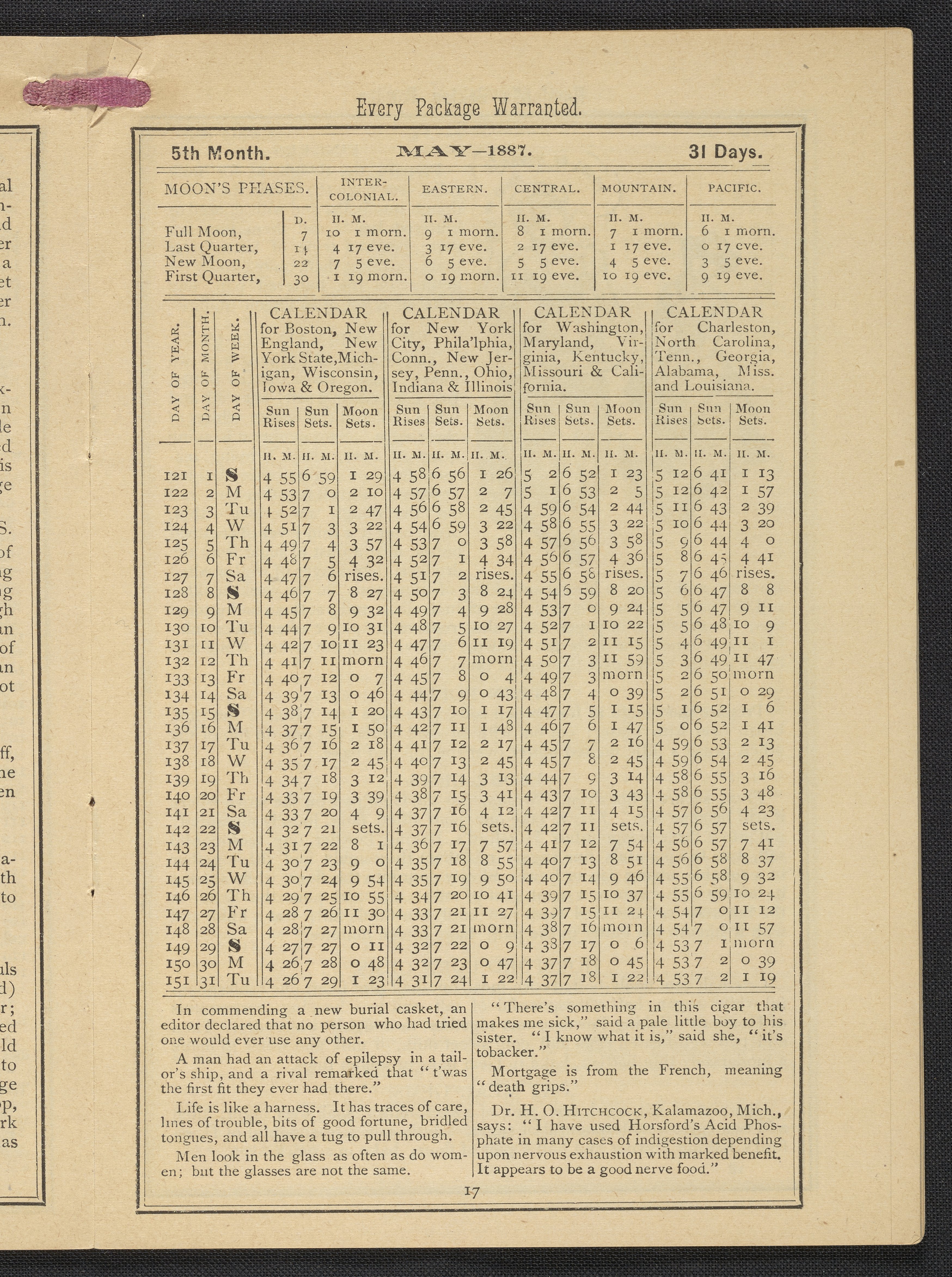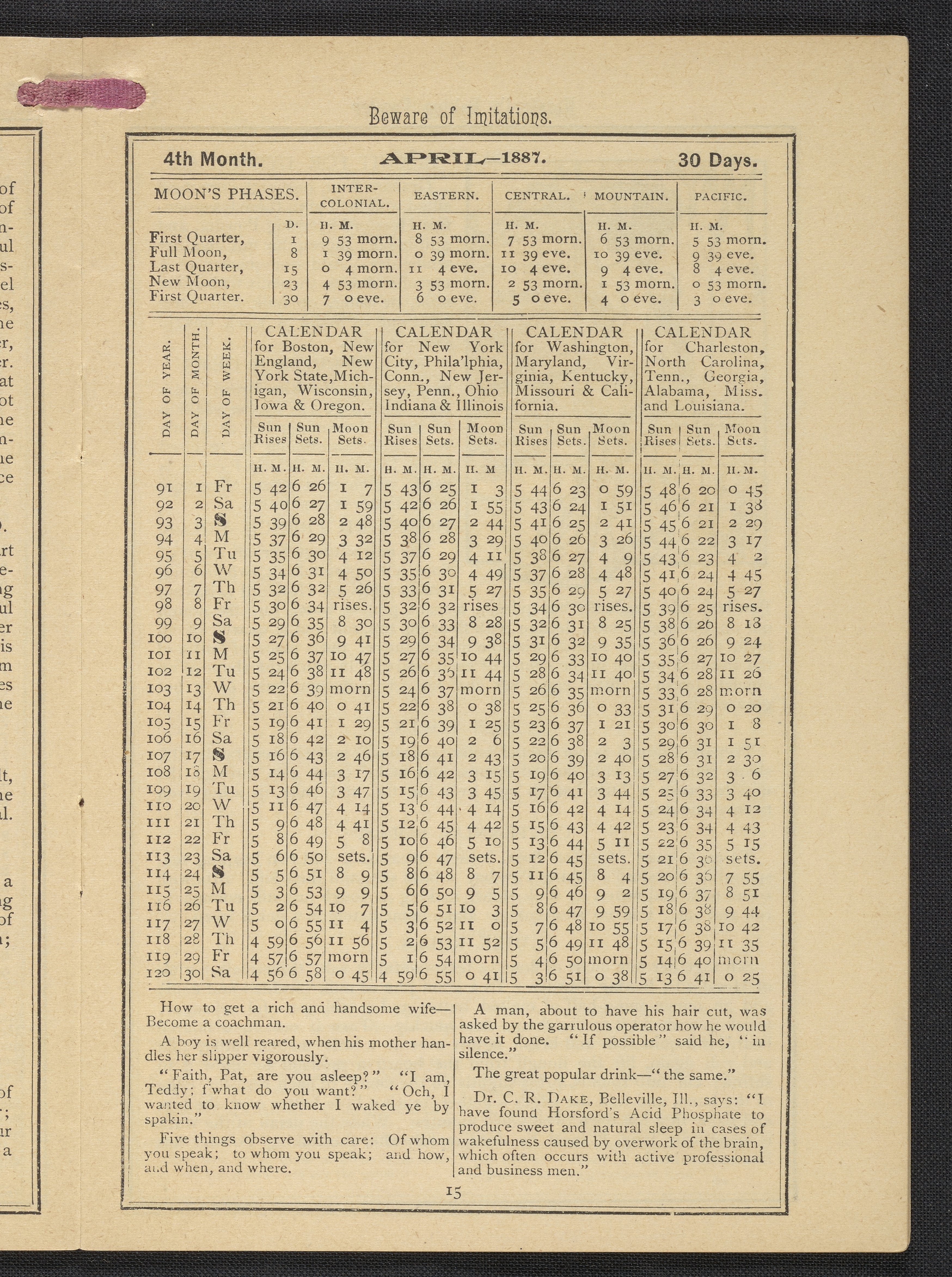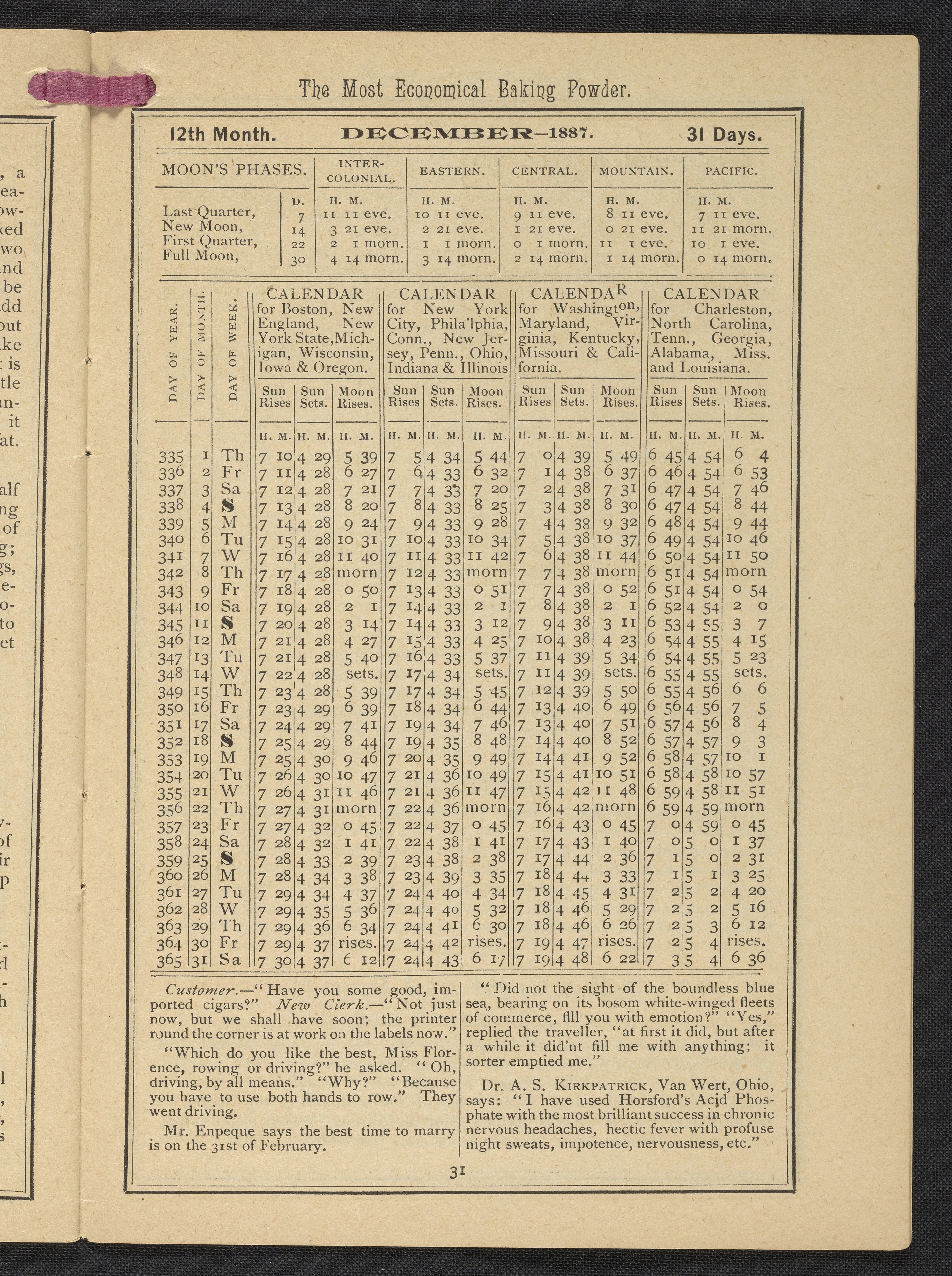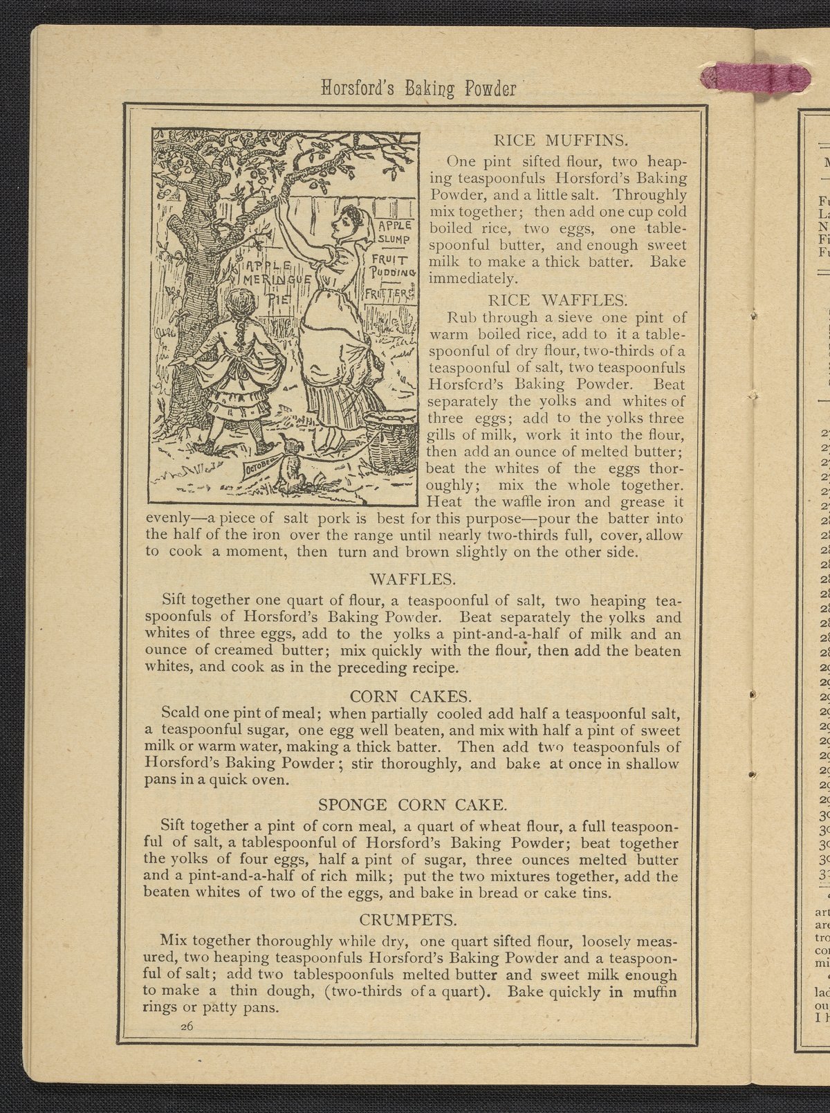 Small JPG1200 x 1669px — 634 KBLarge JPG2880 x 4005px — 3.2 MBFull-sized JPG3483 x 4843px — 4.4 MBOriginal fileTIFF — 3483 x 4843px — 48.3 MBPublished by Rumford Chemical Works, this almanac features advertisements for Professor Horsford's baking powder and acid phosphate along with other products manufactured by Rumford Chemical Works. Also includes "Herschel's Weather Table" for predicting the weather. Each month features recipes and/or household hints along with seasonal illustrations focusing on farming, baking, gathering fruit and baked goods.