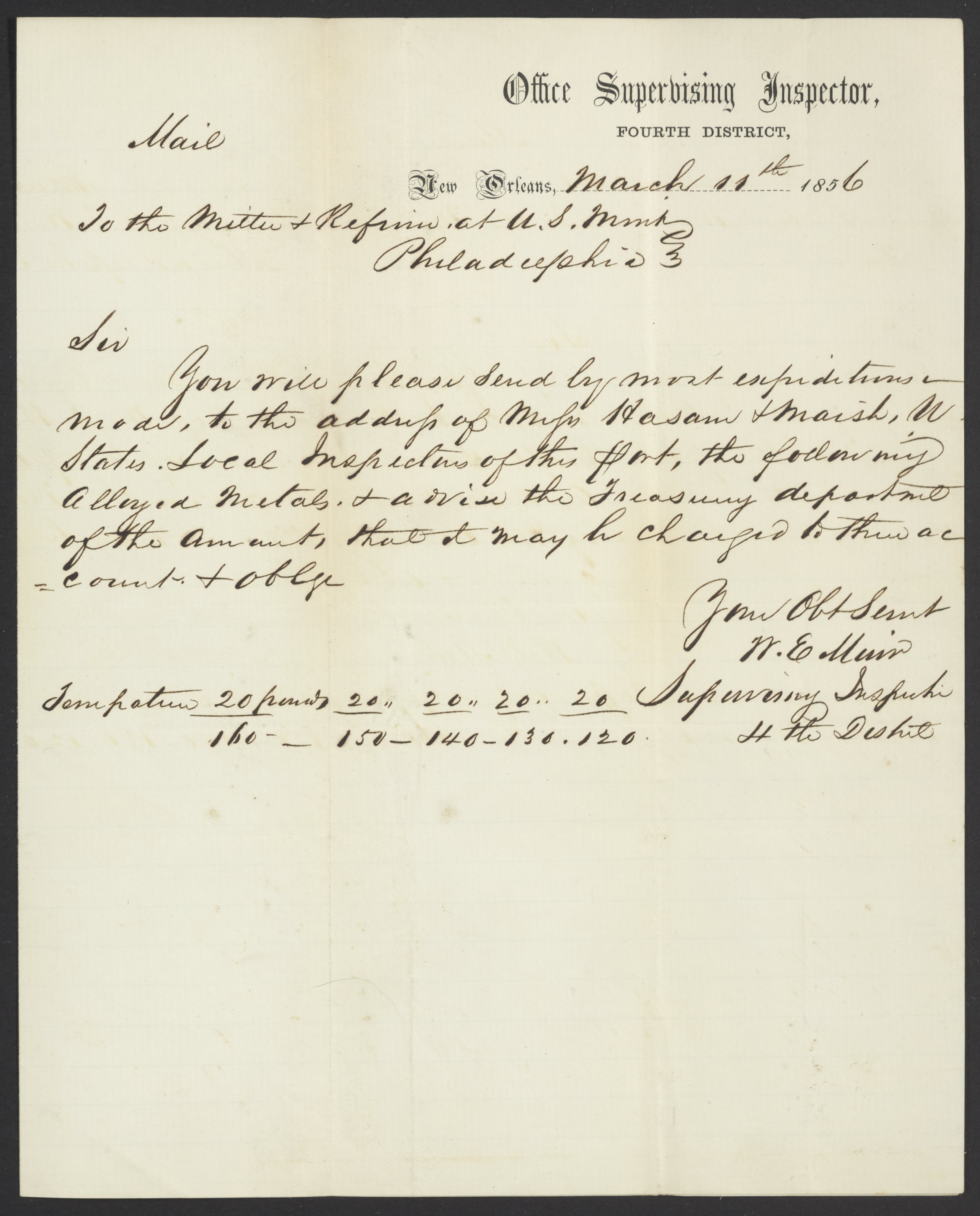 Small JPG1200 x 1488px — 192 KBLarge JPG2880 x 3572px — 785 KBFull-sized JPG3246 x 4026px — 955 KBOriginal fileTIFF — 3246 x 4026px — 37.5 MBRequisition for a shipment of alloyed metals from the Office of Supervising Inspector, Fourth District, New Orleans.