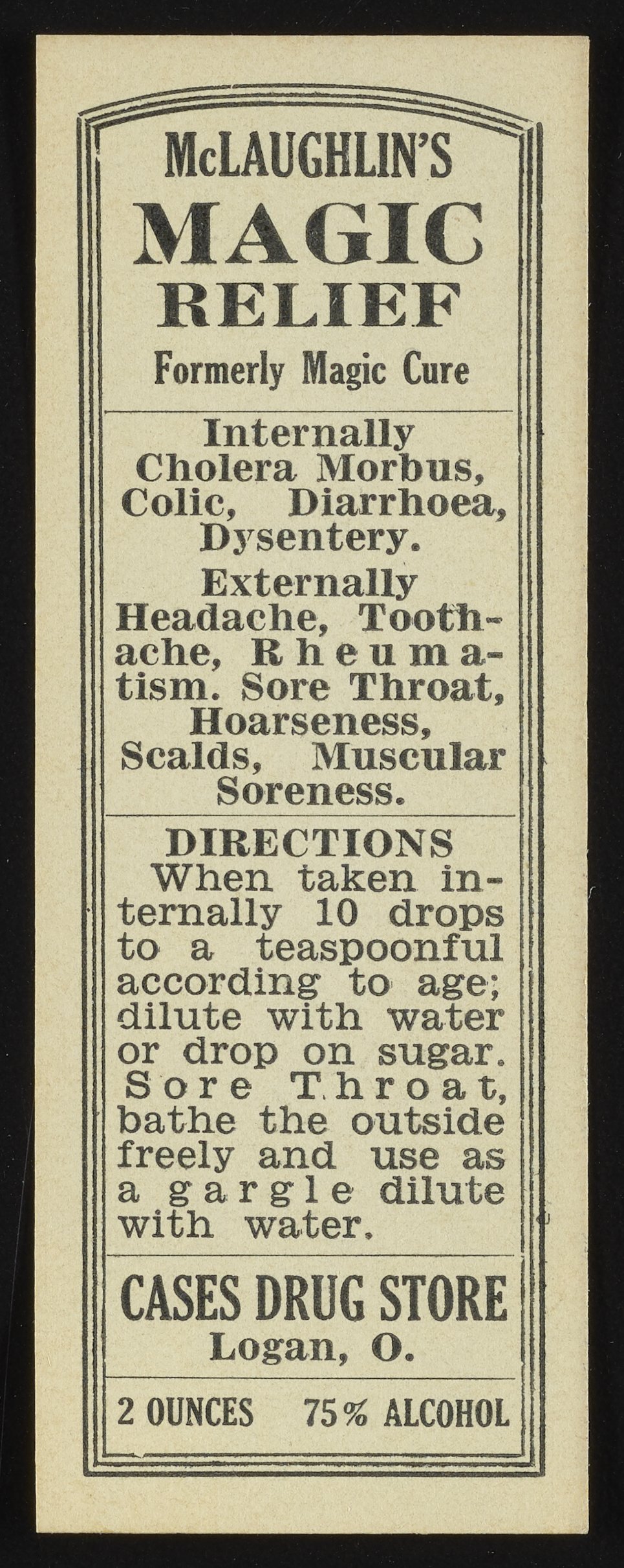 PDFFull-sized JPG965 x 2420px — 498 KBOriginal fileTIFF — 965 x 2420px — 6.7 MBThe label for McLaughlin’s Magic Relief from Cases Drug Store of Logan, Ohio advertises this patent medicine as a cure for gastrointestinal ailments and as a pain reliever. According to the label, the primary ingredient was alcohol and it could be used internally and externally.