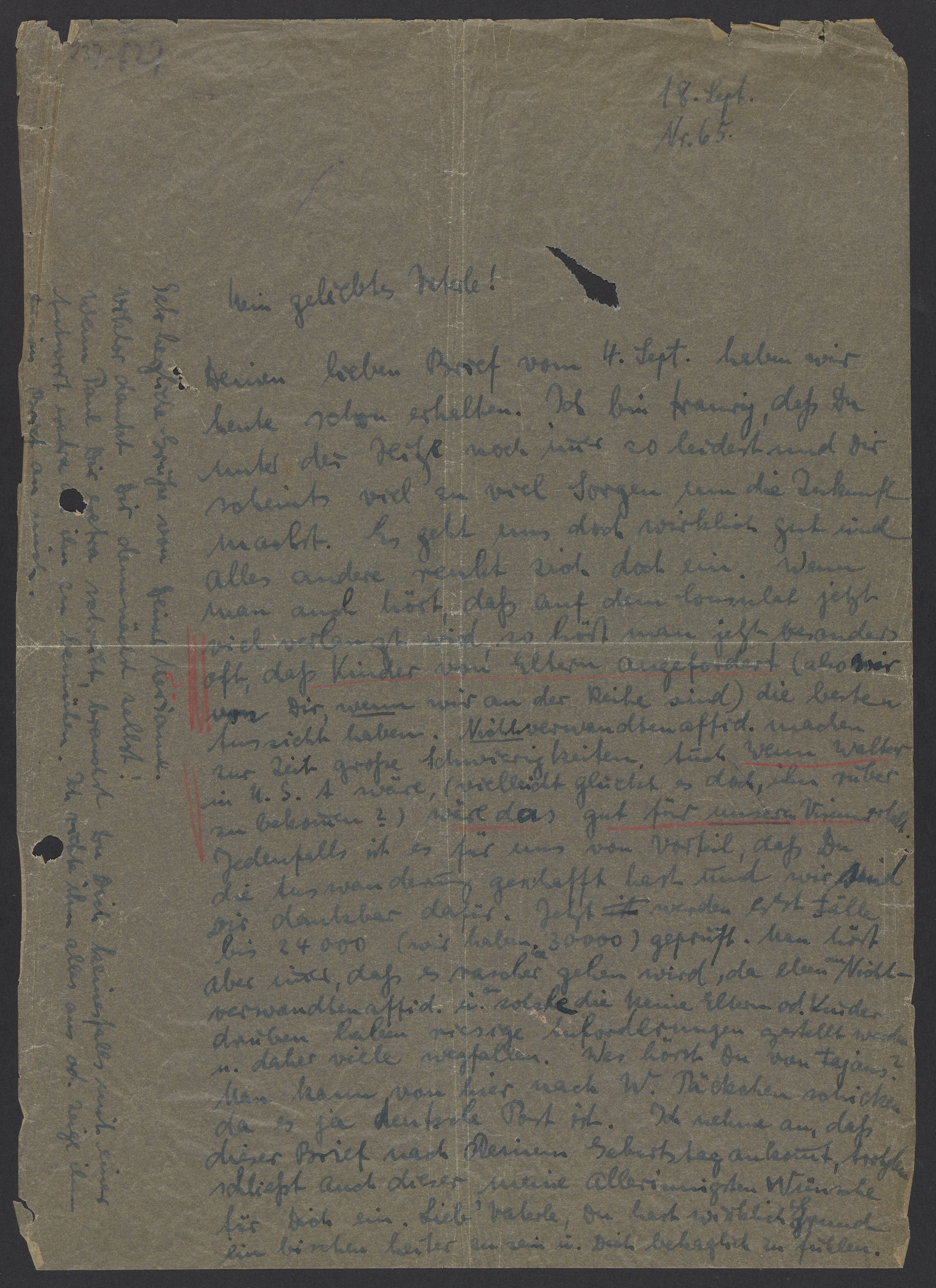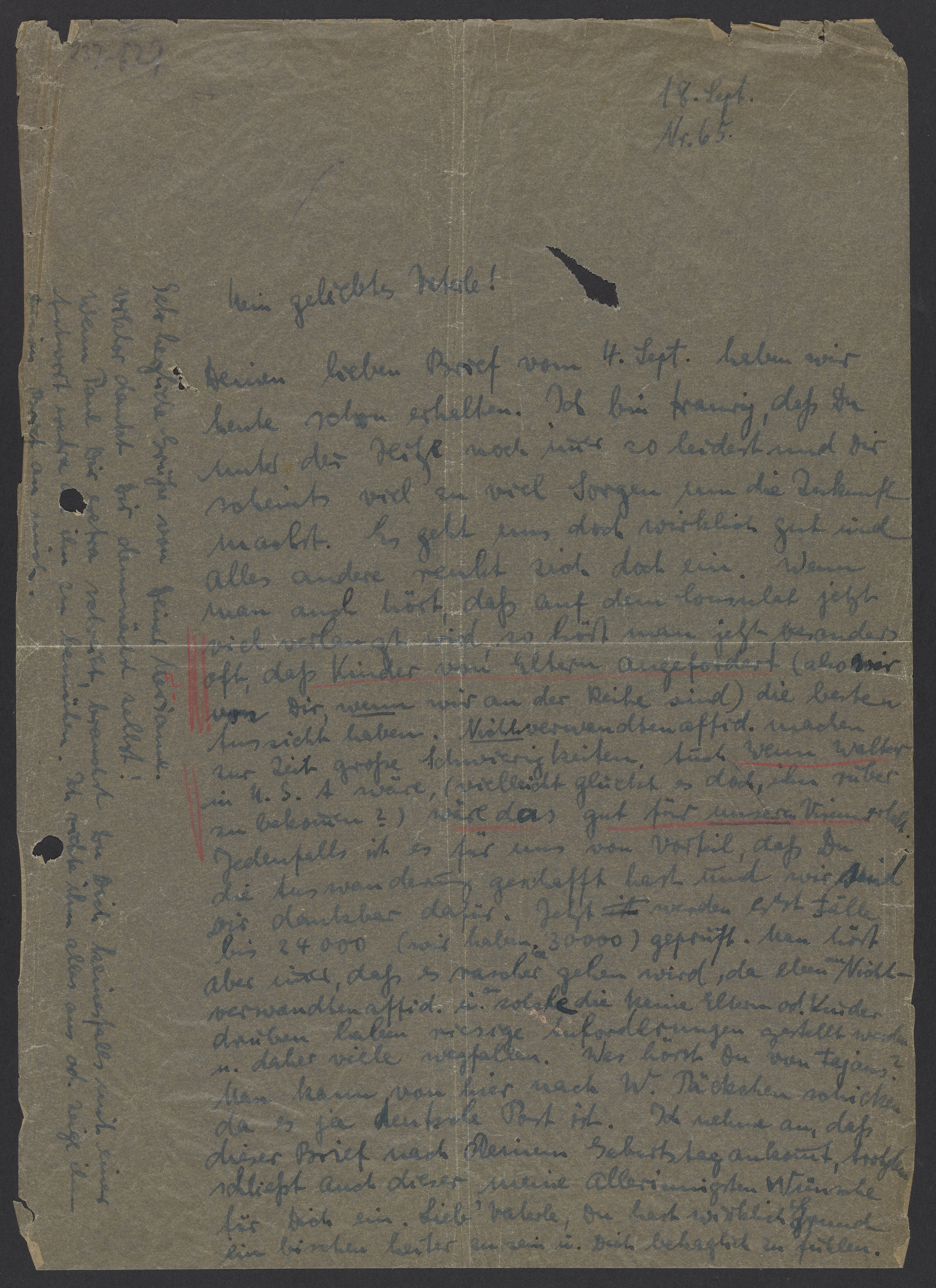 We received your nice letter from September 4th today. I’m sad that you're still suffering so much from the heat. You also seem to worry too much about the future. We are doing well and everything else is fine. I hear that a lot is required at the consulate now. Apparently, children receiving assistance from their parents (i.e., when you help us) have the best prospects. Affidavits from non-relatives are currently causing great difficulties. If Walter were in the U.S.A., that would be beneficial for the success of our visa application (maybe it would make sense to bring him there?) In any case, it is to our advantage that you have managed to emigrate successfully, and we are grateful to you for that. Only cases up to approximately #24,000 are being processed (we have #30,000). I hear that while some people receive visas, those with non-relative affidavits and who do not have parents or children in the U.S.A have more requirements and may cancel their application. What have you heard from Fajans? You can send from packages to W. because it is the German postal service. I assume that this letter will arrive after your birthday. Nevertheless, I wish you the best. My dear father, you have reason to be little happier and feel at ease.