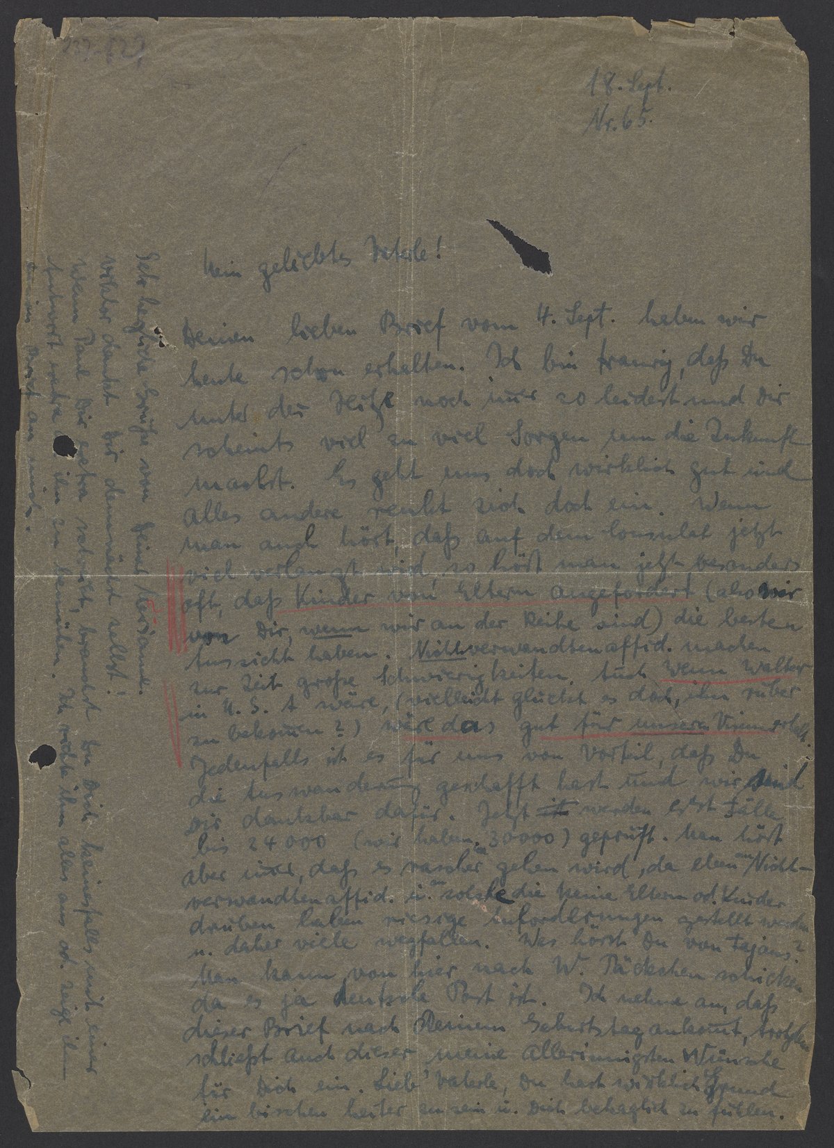 Deinen lieben Brief vom 4. Sept. haben wir heute schon erhalten. Ich bin traurig, daß Du unter der Hitze noch immer so leidest und Dir scheints viel zu viel Sorgen um die Zukunft machst. Es geht uns doch wirklich gut und alles andere reiht sich doch ein. Wenn man auch hört, dass auf dem Consulat jetzt viel verlangt wird, so hört man jetzt besonders oft, dass Kinder von Eltern angefordert (also mir von Dir, wenn wir an Reihe sind) die besten Aussicht haben. Nichtverwandtenaffid. machen zur Zeit große Schwierigkeiten. Auch wenn Welter in U.S.A wäre, (vielleicht gleicht es doch, ihn rüber zu bekommen?) wäre das gut für unseren Visumerhalt. Jedenfalls ist es für uns vom Vorteil, dass Du die Auswanderung geschafft hast und wir sind Dir dankbar dafür. Jetzt wenden erst Fälle bis 24000 geprüft (wir haben 30000) geprüft. Man hört aber nur, daß es mancher geben wird, da eben Nichtverwandtenaffid. u. solche die keine Eltern od. Kinder drüben haben riesige Aufforderungen gestellt werden und daher viele wegfallen. Was hörst Du von Fajans? Man kann von hier nach W. Päckchen schicken da es ja deutsche Post ist. Ich nehme an, daß dieser Brief nach Deinem Geburtstag ankommt, trotzdem schließt auch dieser meine allerinnigsten Wünsche für Dich ein. Lieb‘ Vaterle, Du hast wirklich Grund ein bischen heiter zu sein u. Dich behaglich zu fühlen.