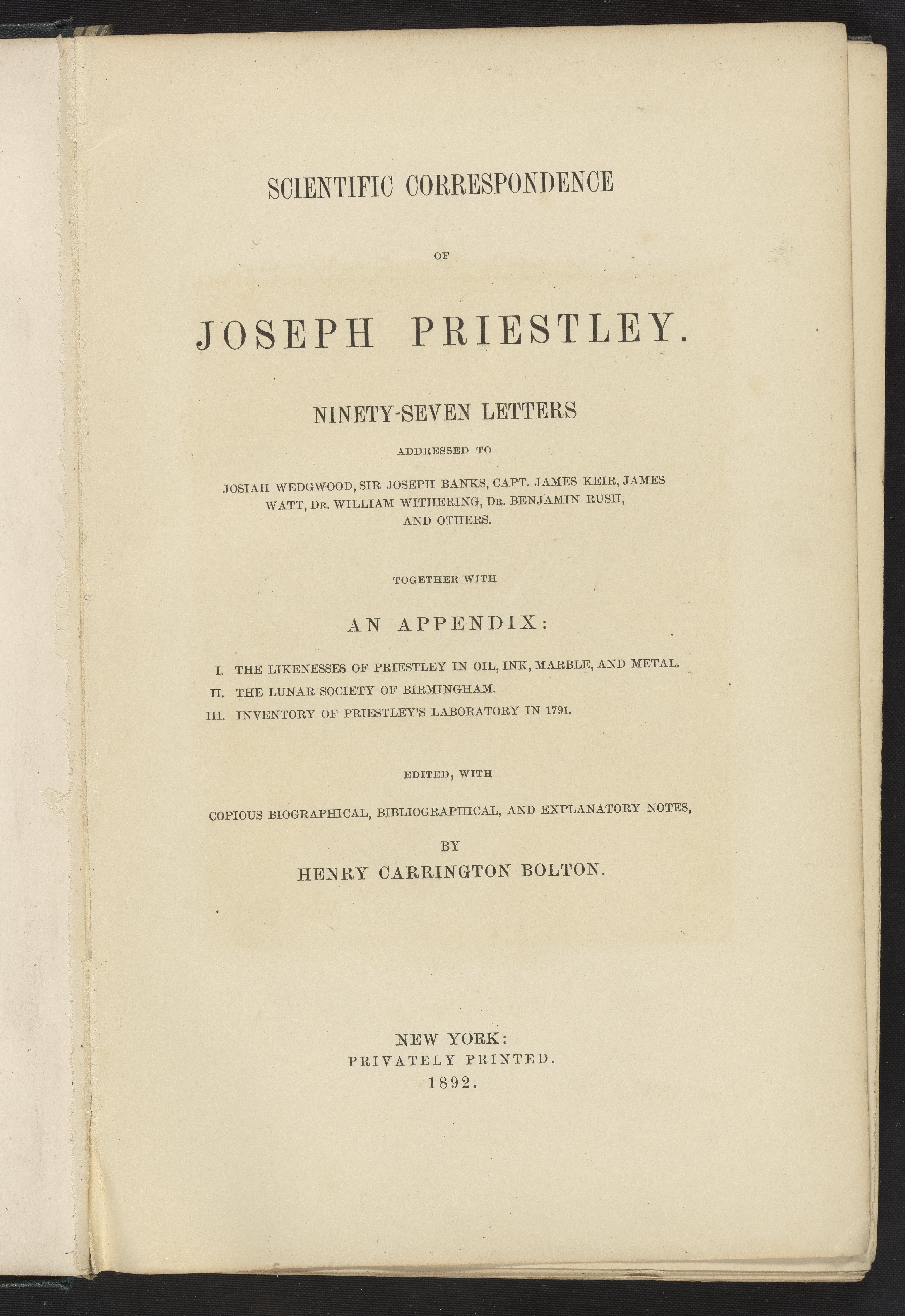 Priestley, Joseph. “Scientific Correspondence of Joseph Priestley.” New York, New York: Collins Printing House, 1892. https://digital.sciencehistory.org/works/uupyzq5.