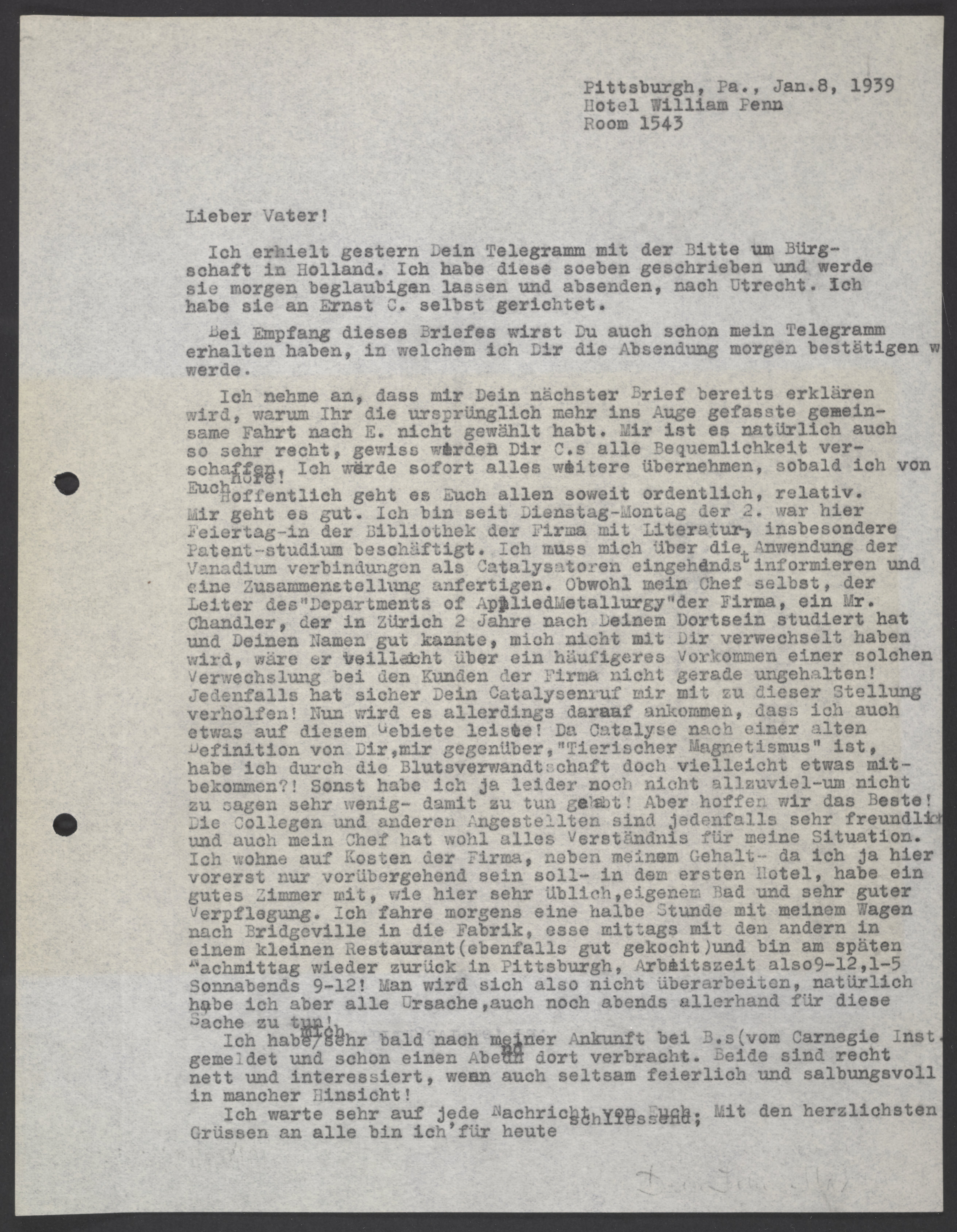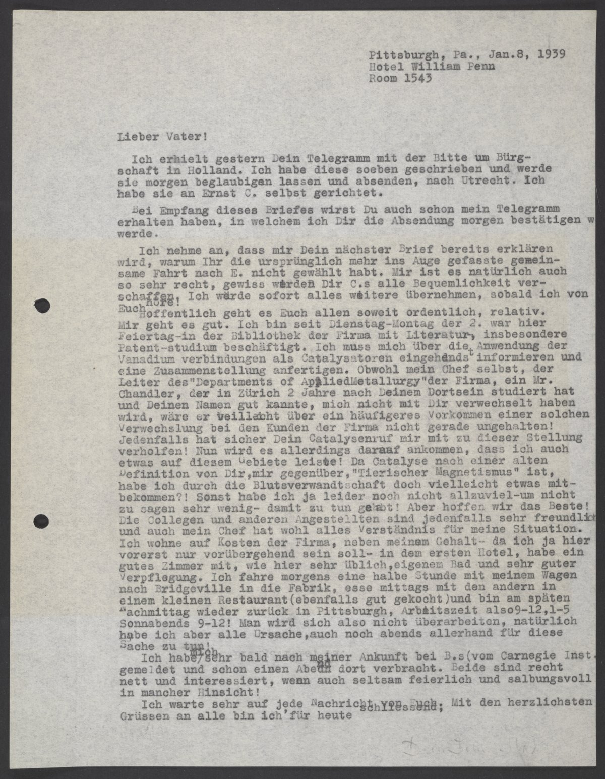 Hoffentlich geht es Euch allen soweit ordentlich, relativ. Mir geht es gut. Ich bin seit Dienstag-Montag der 2. war hier Feiertag – in der Bibliothek der Firma mit Literatur, insbesondere Patent-studium beschäftigt. Ich muss mich über die Anwendung der Vanadium verbindungen als Catalsatoren eingehendst informieren und eine Zusammenstellung anfertigen. Obwohl mein Chef selbst, der Leiter des „Departments of Applied Metallurgy“ der Firma, ein Mr.Chandler, der in Zürich 2 Jahre nach Deinem Dortsein studiert hat und Deinen Namen gut kannte, mich nicht mir Dir verwechselt haben wird, wäre er vielleicht ueber ein häufigeres Vorkommen einer solchen Verwechselung bei den Kunden der Firma nicht gerade ungehalten! Jedenfalls hat sicher dein Catalysenruf mir mit zu dieser Stellung verholfen! Nun wird es allerdings darauf ankommen, dass ich auch etwas auf diesem Gebiete leiste! Da Catalyse nach einer alten Definition von Dir, mir gengenüber, „Tierischer Magnetismus“ ist, habe ich durch die Blutverwandtschaft doch vielleicht etwas mitbekommen?! Sonst habe ich ja leider noch nicht allzuviel-um nicht zu sagen sehr wenig – damit zu tun gehabt! Aber hoffen wir das Beste. Die Collegen und anderen Angestellten sind jedenfalls sehr freundlich und auch mein Chef hat wohl alles Verständnis für meine Situation. Ich wohne auf Kosten der Firma, neben meinem Gehalt – da ich ja hier vorerst nur vorübergehend sein soll – in dem ersten Hotel, habe ein gutes Zimmer mit, wie hier sehr üblich, eigenem Bad und sehr guter Verpflegung. Ich fahre morgens eine halbe Stunde mit meinem Wagen nach Bridgeville in die Fabrik, esse mittags mit den andern in einem kleinen Restaurant (ebenfalls gut gekocht) und bin am späten Nachmittag wieder zurück in Pittsburgh, Arbeitszeit also 9-12, 1-5 Sonnabends 9-12! Mird wird sich also nicht überarbeiten, natürlich habe ich aber alle Ursache, auch noch abends allerhand für diese Sache zu tun!