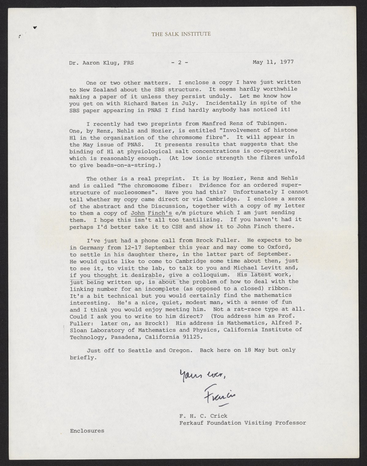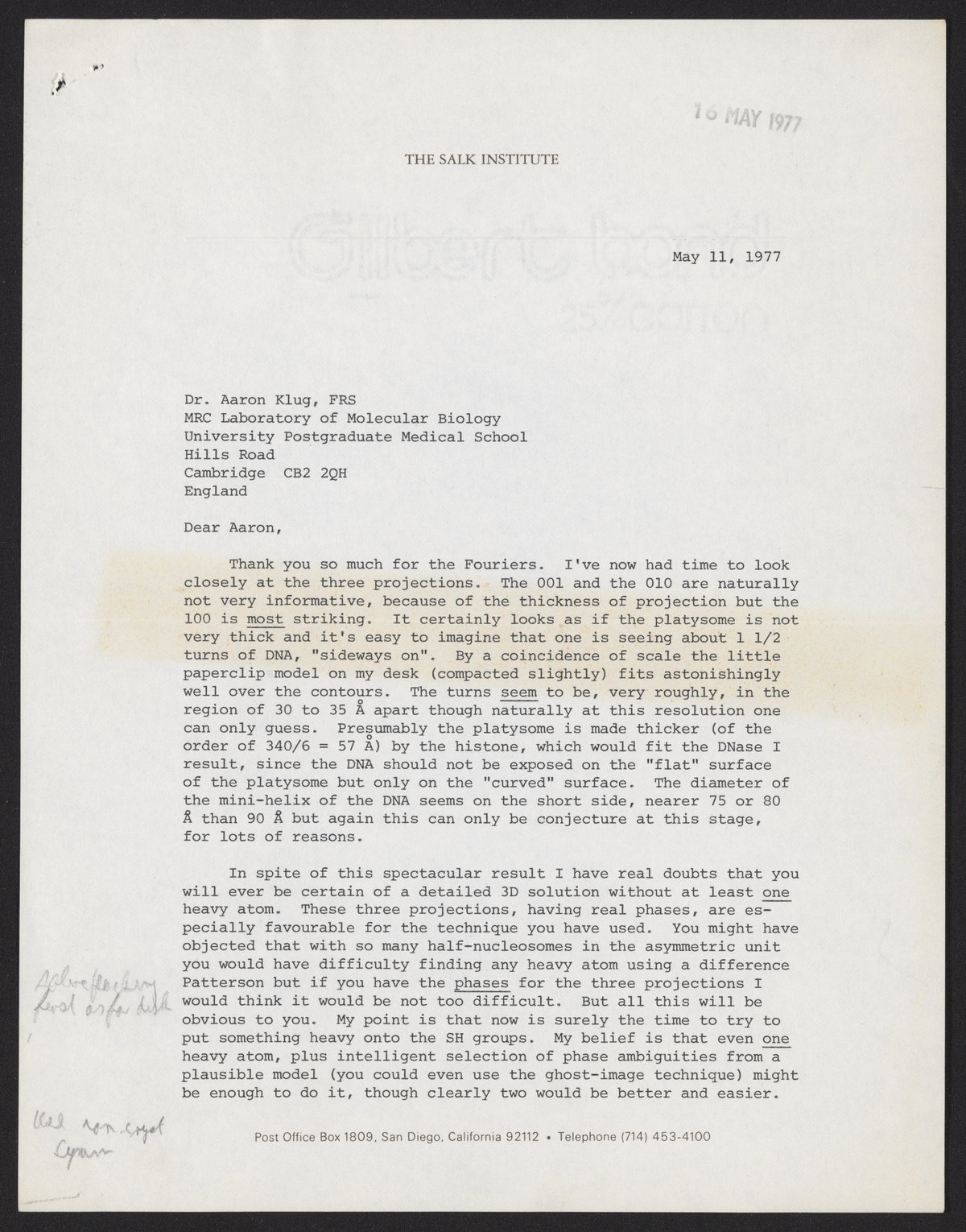 Crick, Francis. “Letter from Francis Crick to Aaron Klug, May 11, 1977,” May 11, 1977. History of Molecular Biology Collection, Box 20, Folder 1. Science History Institute. Philadelphia. https://digital.sciencehistory.org/works/uwv64fh.