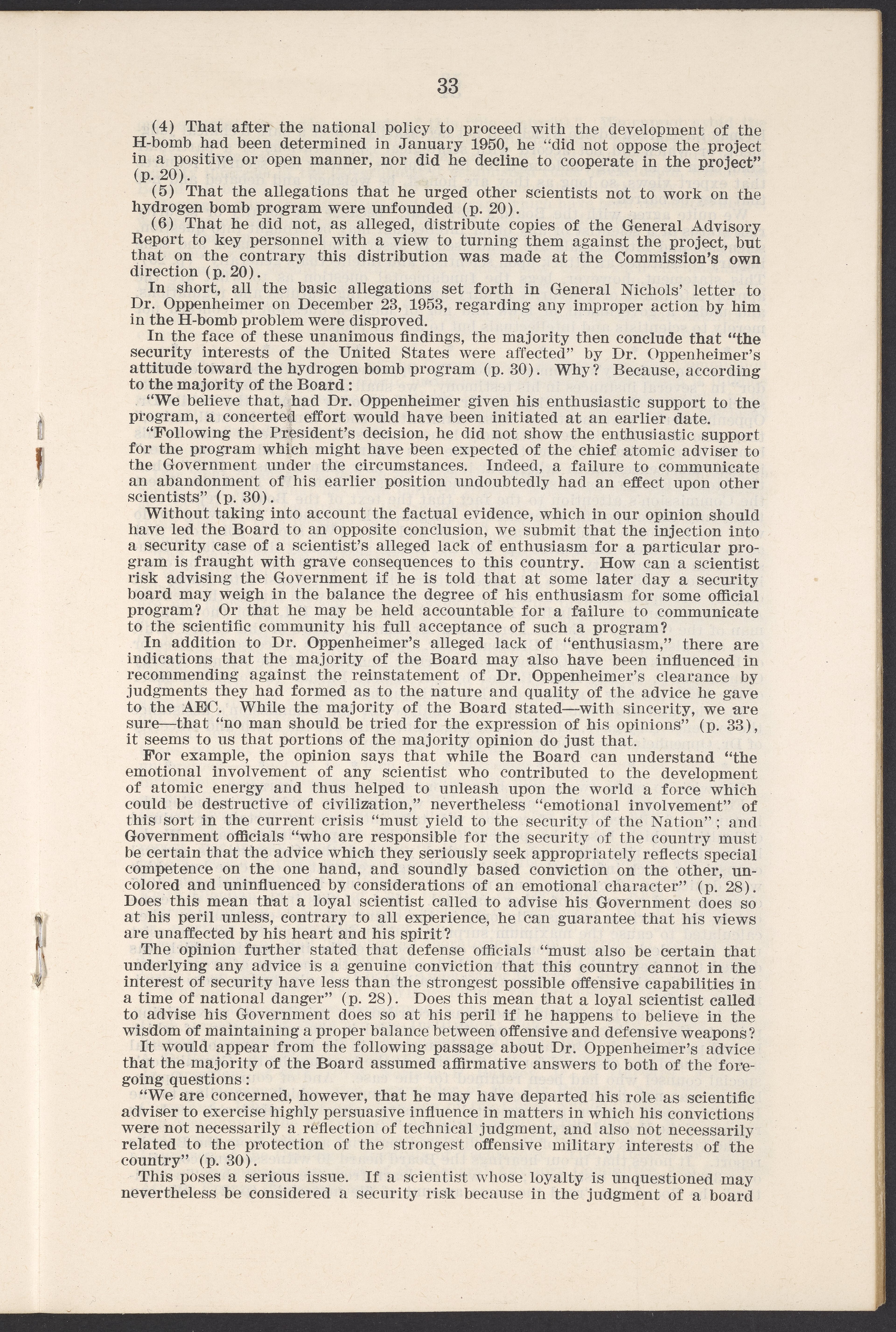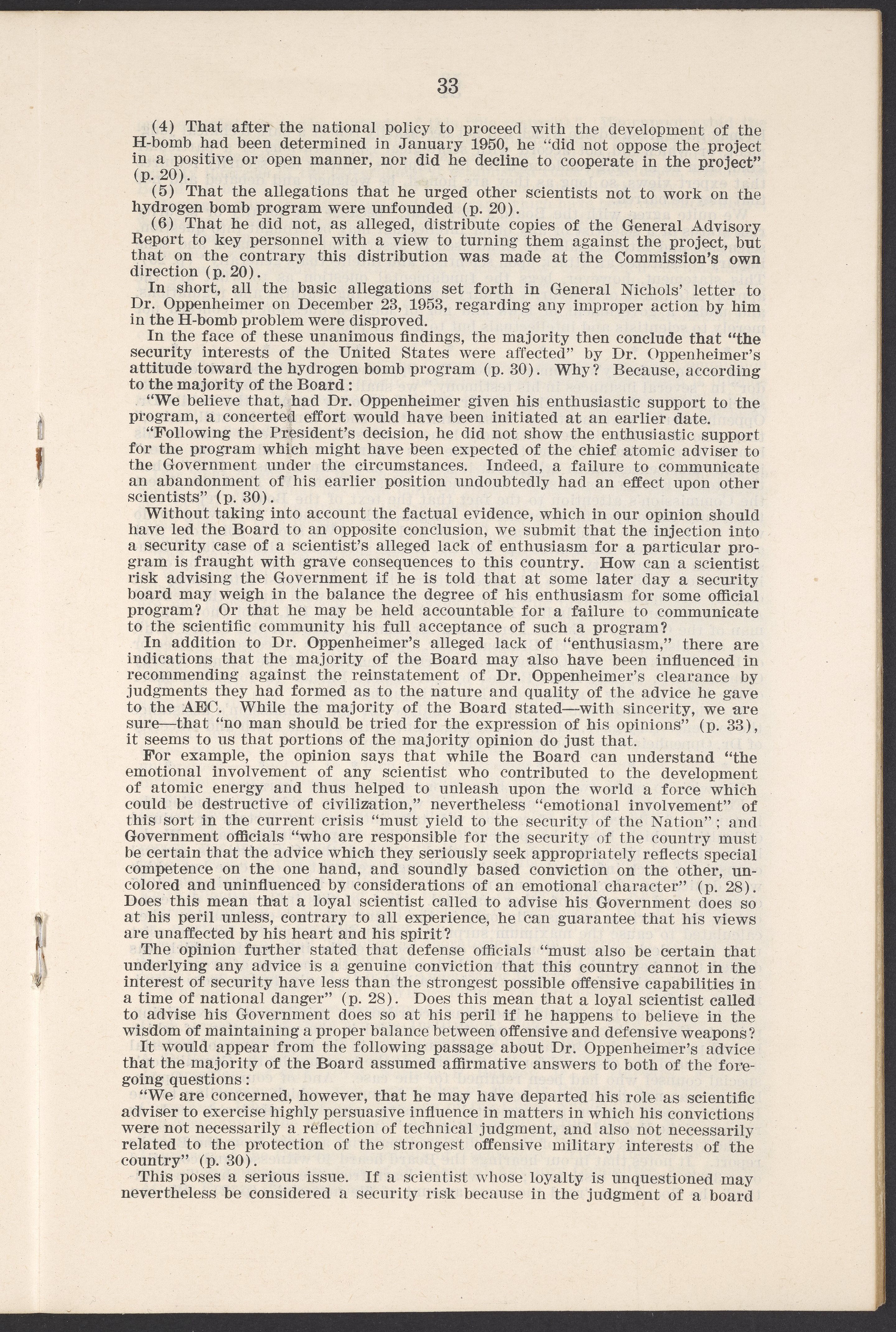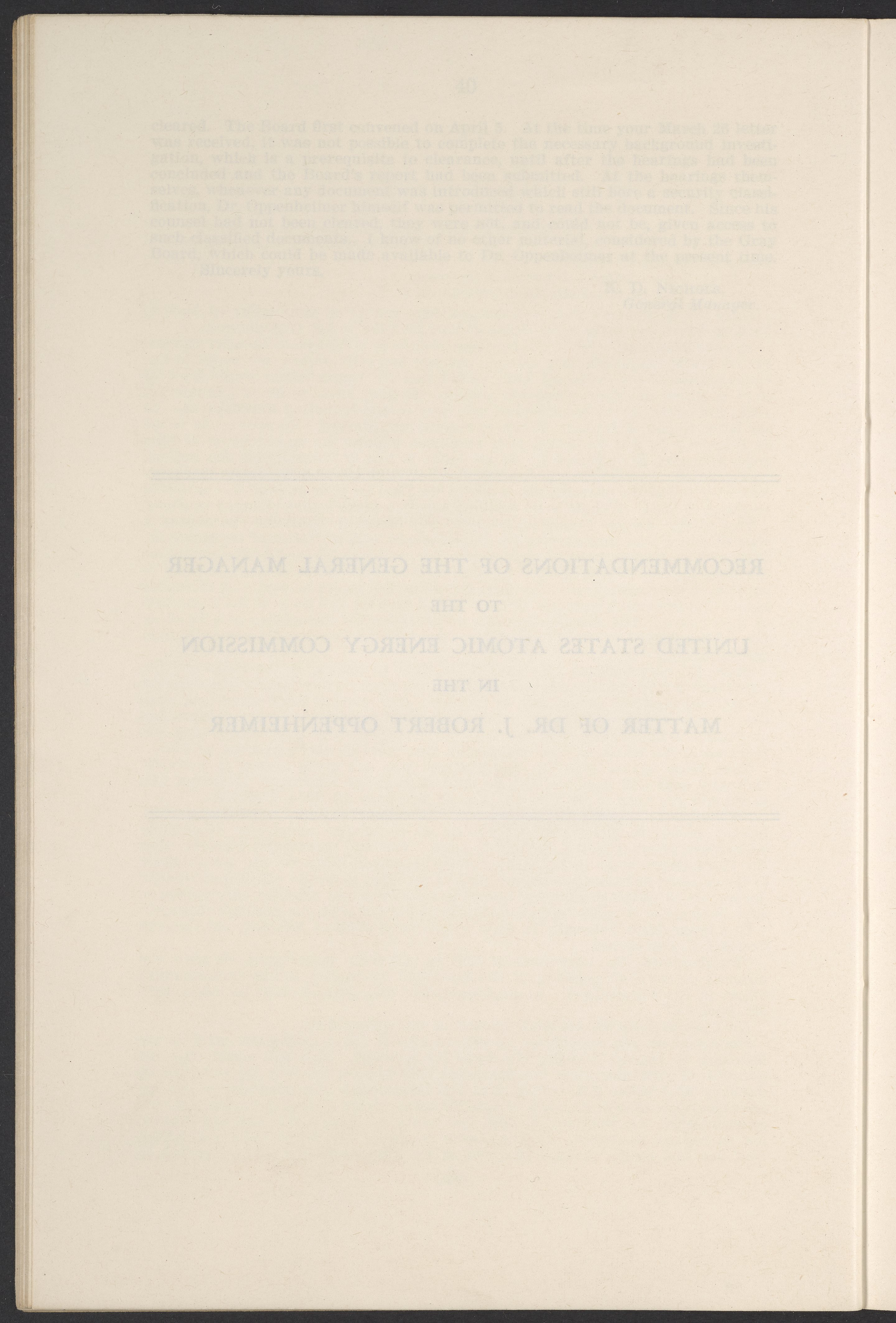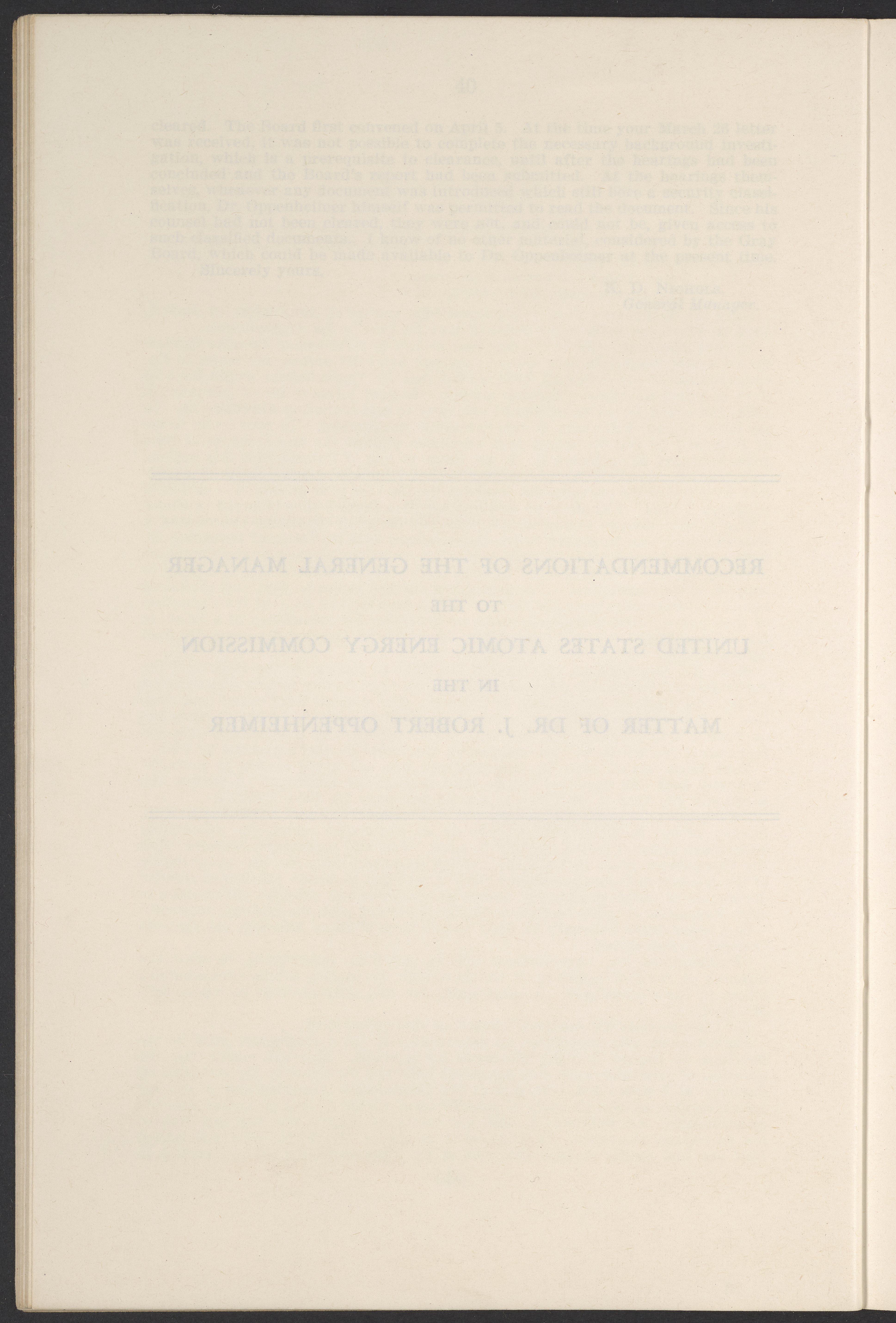 Small JPG1200 x 1811px — 385 KBLarge JPG2880 x 4347px — 2.6 MBFull-sized JPG3770 x 5690px — 4.4 MBOriginal fileTIFF — 3770 x 5690px — 61.4 MBThis booklet details the security clearance hearing of J. Robert Oppenheimer (1904-1967), a pivotal figure in the development of nuclear physics and the atomic bomb, conducted between April and May 1954. The documentation provides an overview of the hearing, including key letters, recommendations, and findings that led to the revocation of Oppenheimer's security clearance before its expiration. This decision stemmed from worries about his past affiliations and doubts over his trustworthiness despite his acknowledgement of his loyalty to the U.S.