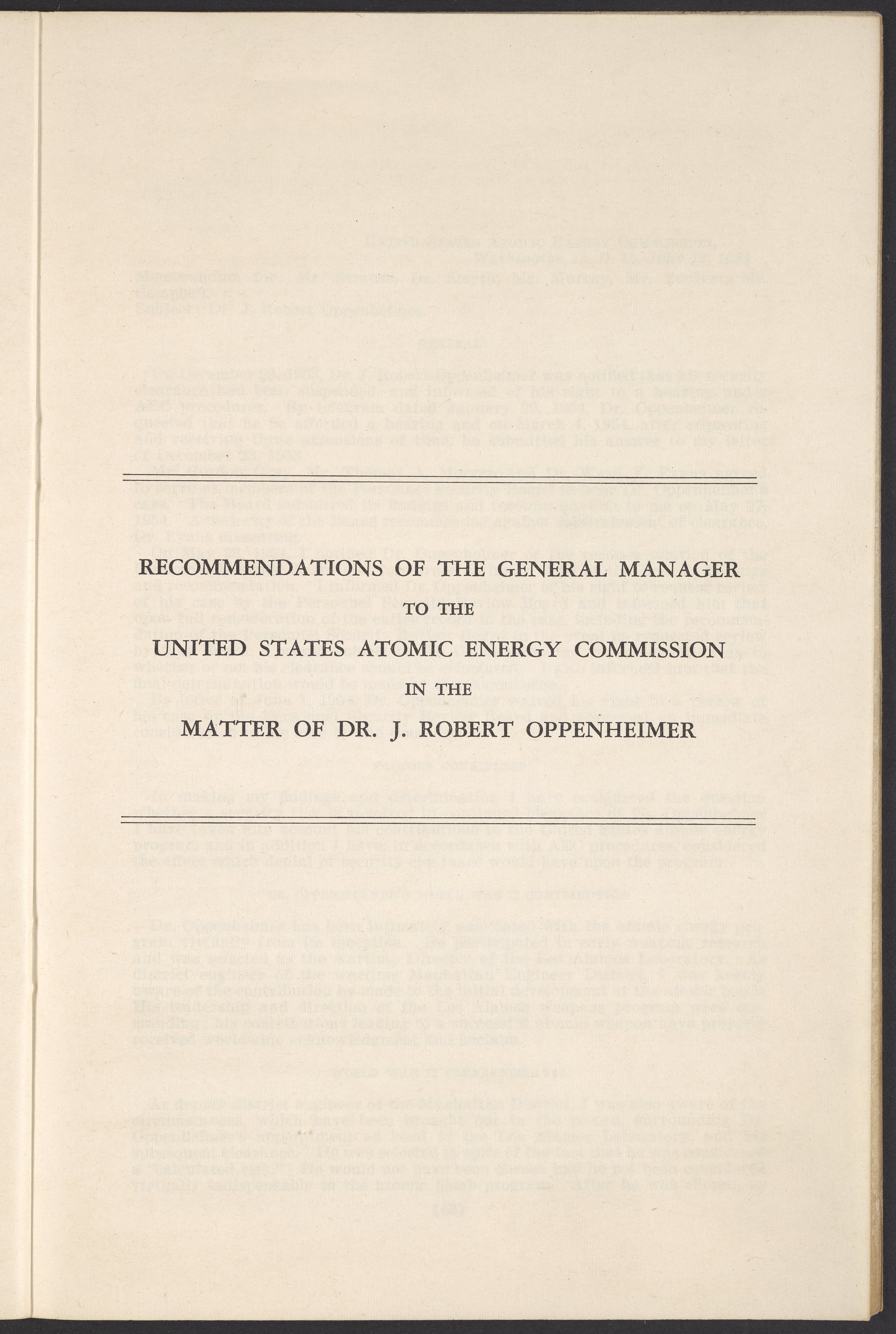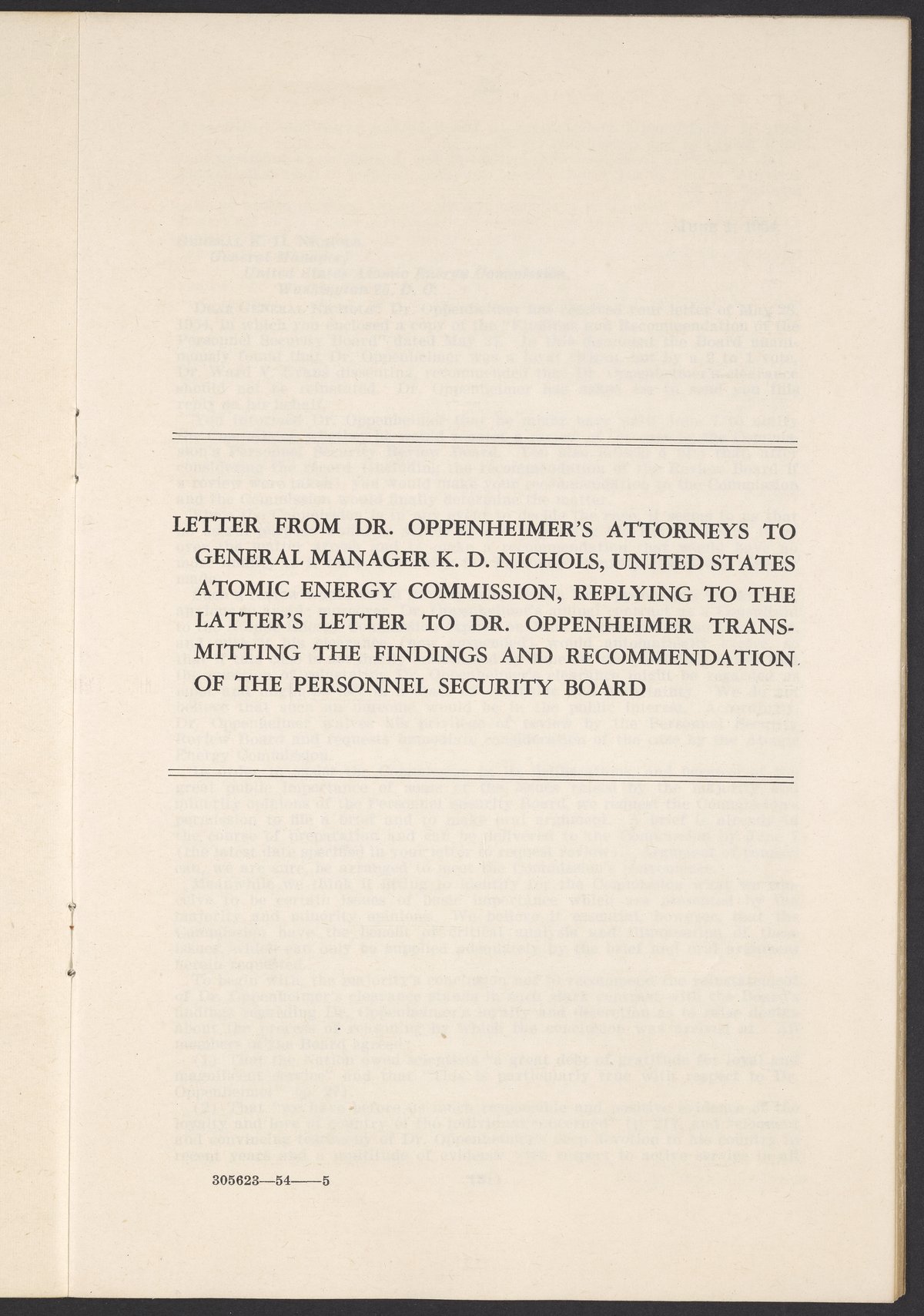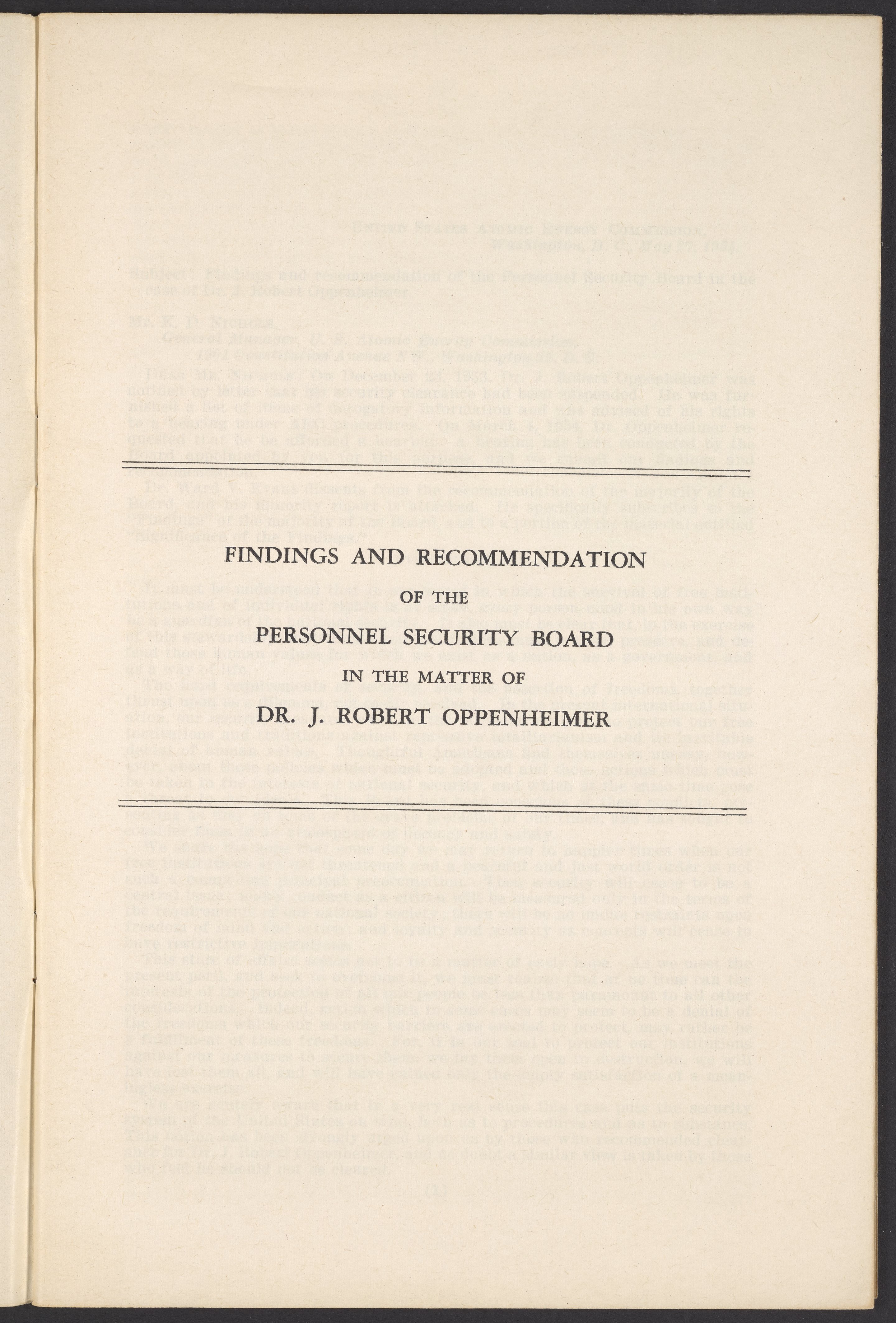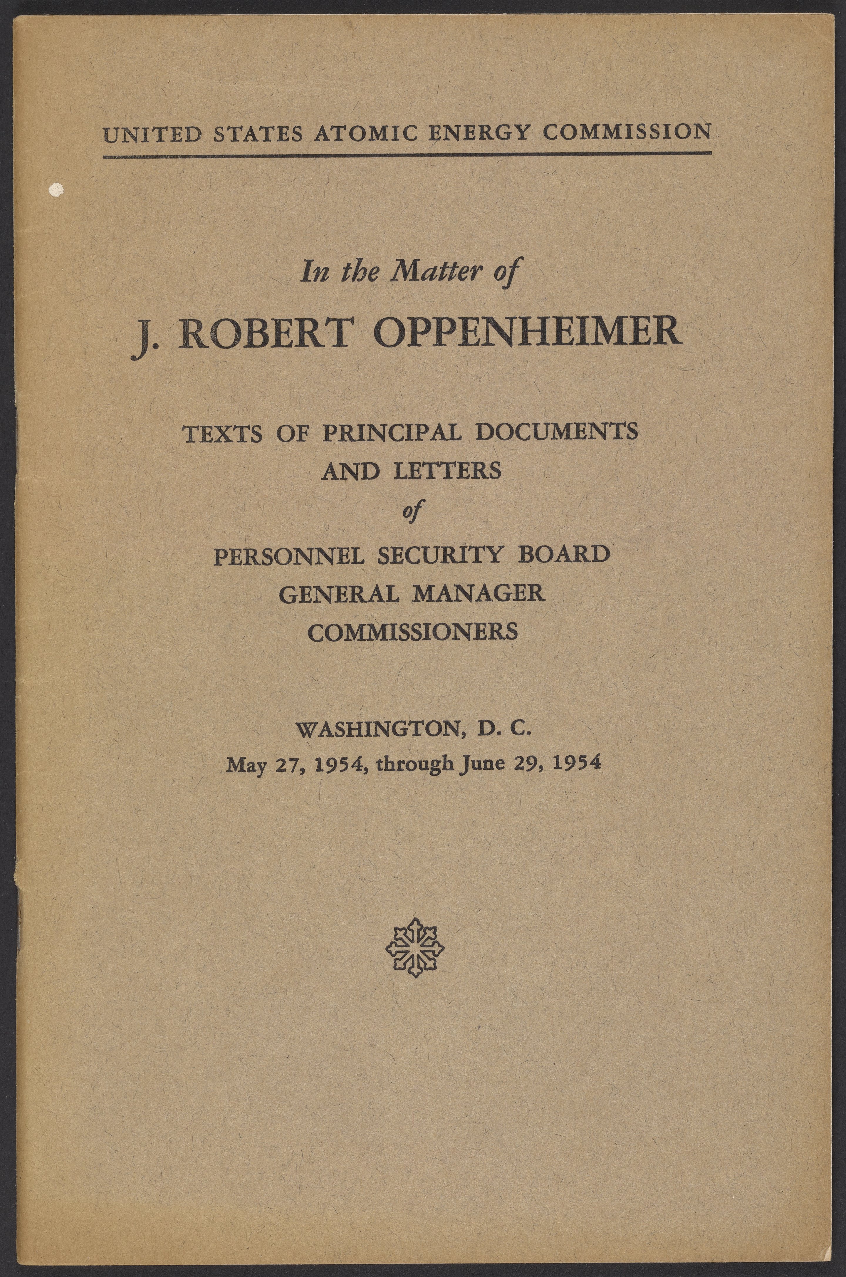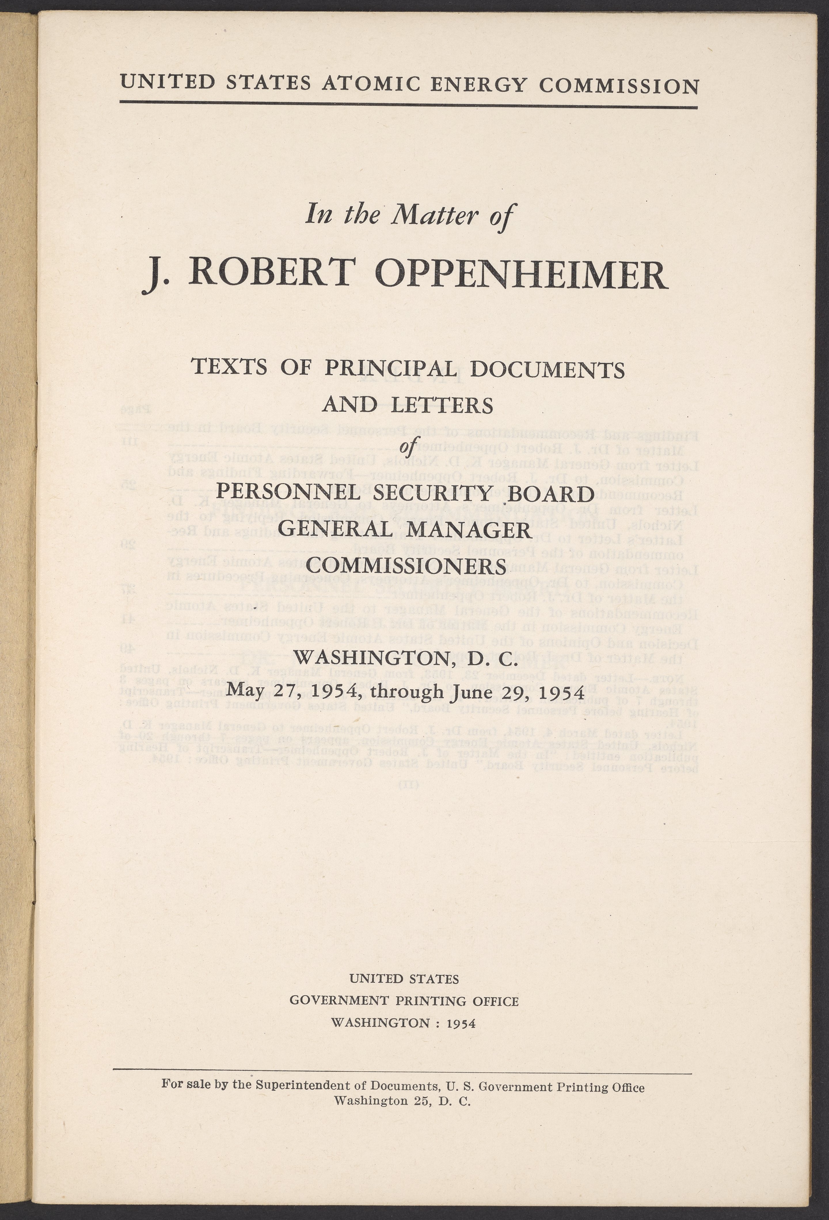 U.S. Atomic Energy Commission. “In the Matter of J. Robert Oppenheimer: Texts of Principal Documents and Letters of Personnel Security Board General Manager Commissioners.” Washington (D.C.): United States. Government Printing Office, 1954. Papers of Max Bredig, Box 8, Folder 42. Science History Institute. Philadelphia. https://digital.sciencehistory.org/works/uxuymyg.