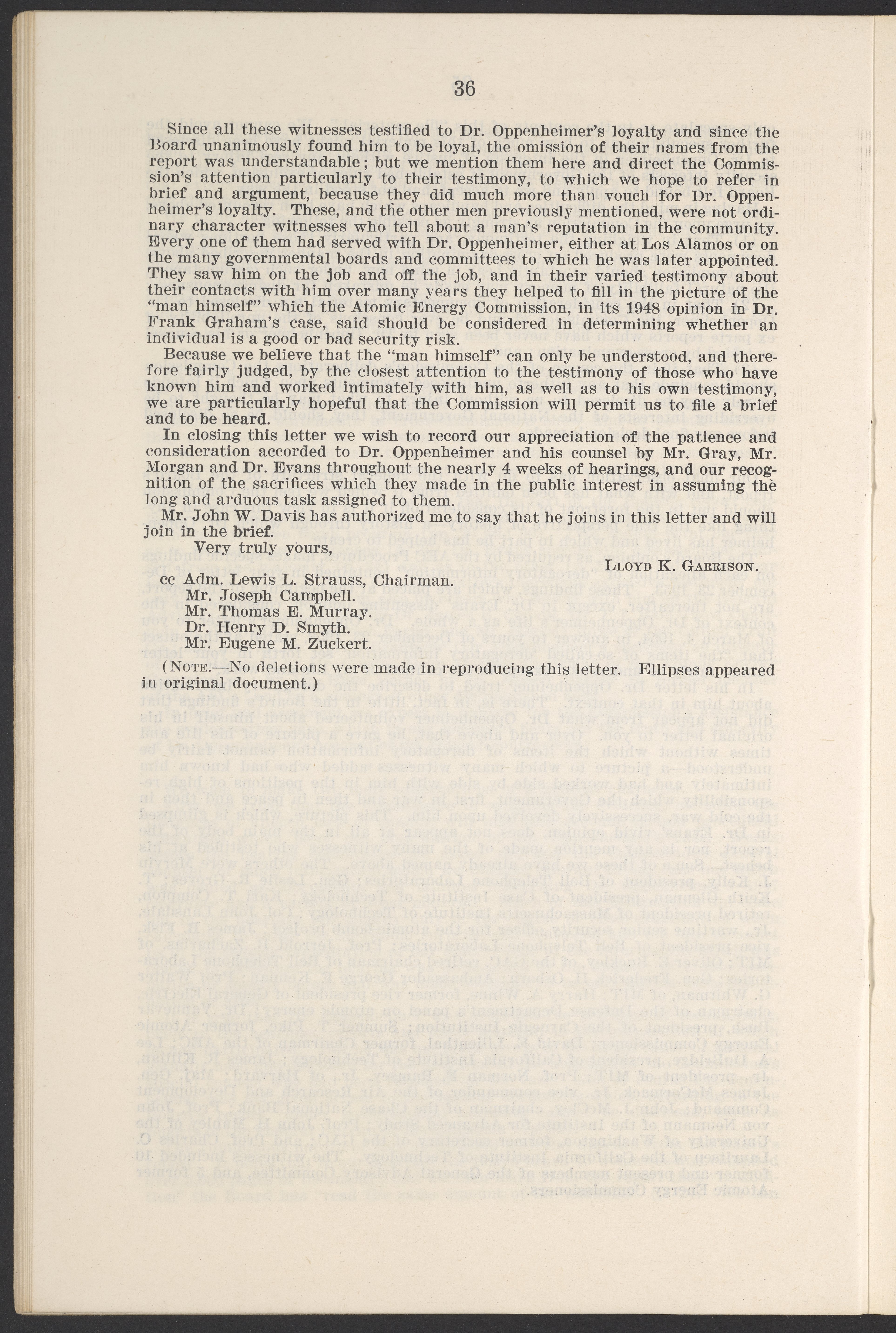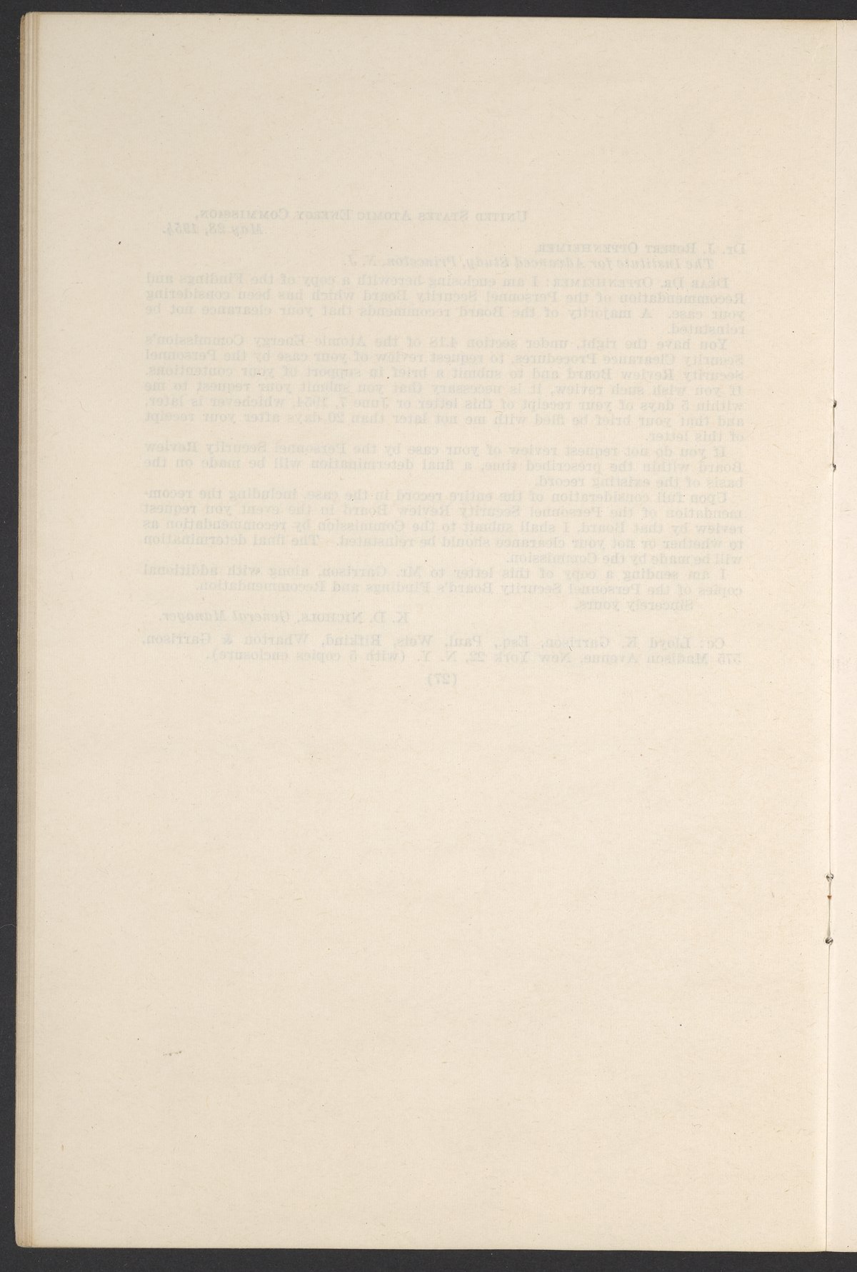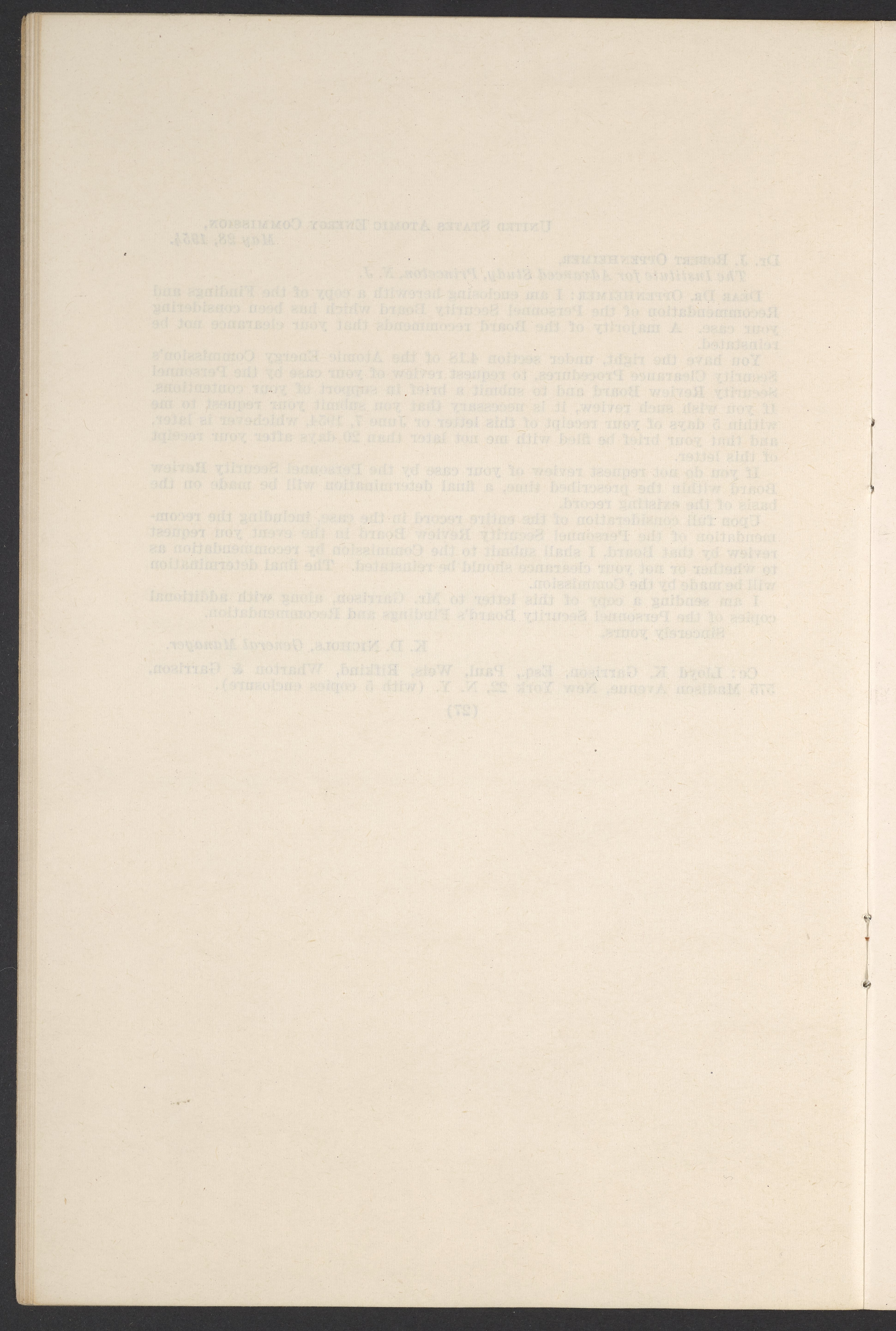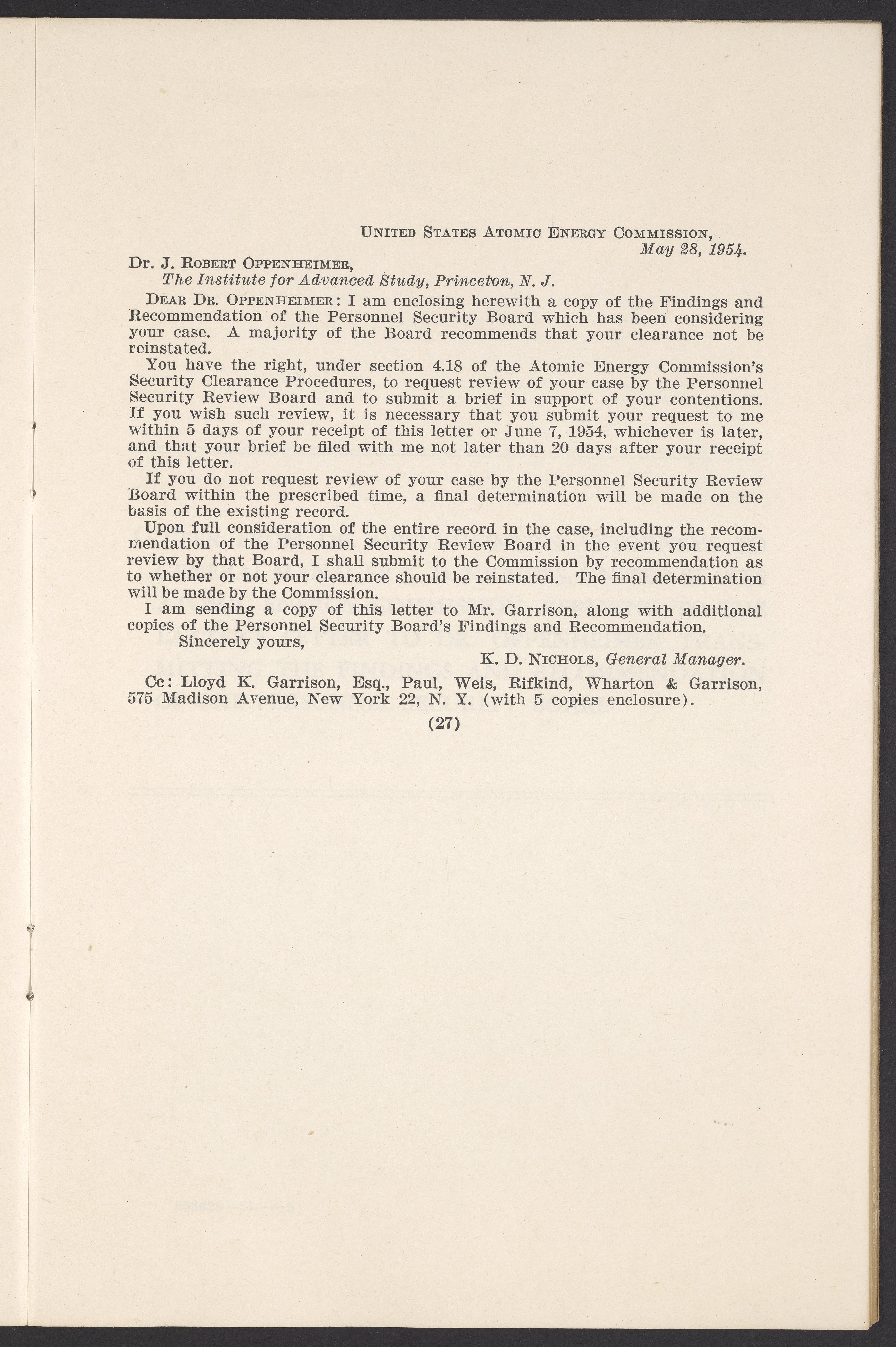In the Matter of J. Robert Oppenheimer: Texts of Principal Documents and Letters of Personnel Security Board General Manager Commissioners