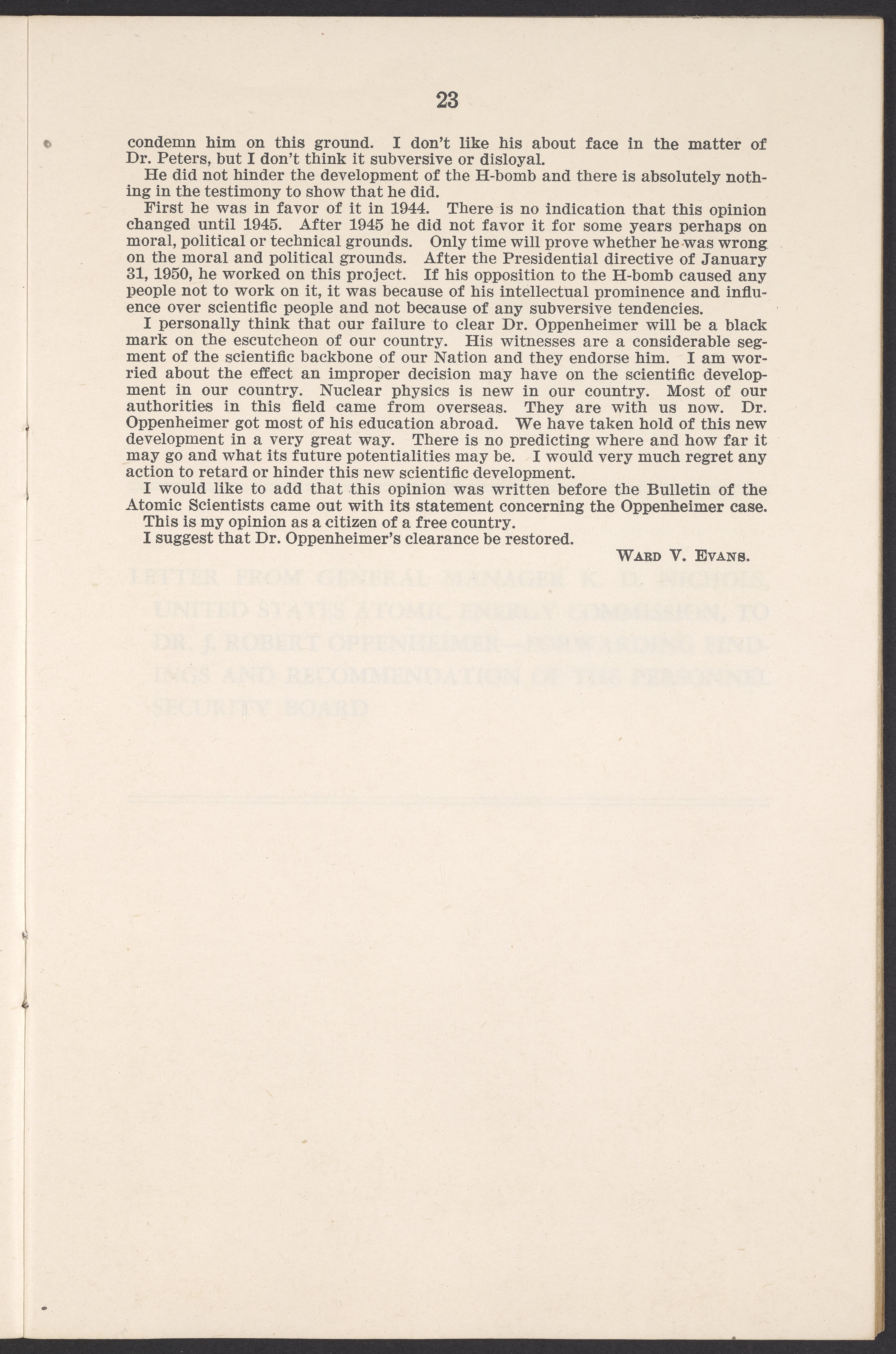 U.S. Atomic Energy Commission. “In the Matter of J. Robert Oppenheimer: Texts of Principal Documents and Letters of Personnel Security Board General Manager Commissioners.” Washington (D.C.): United States. Government Printing Office, 1954. Papers of Max Bredig, Box 8, Folder 42. Science History Institute. Philadelphia. https://digital.sciencehistory.org/works/uxuymyg.