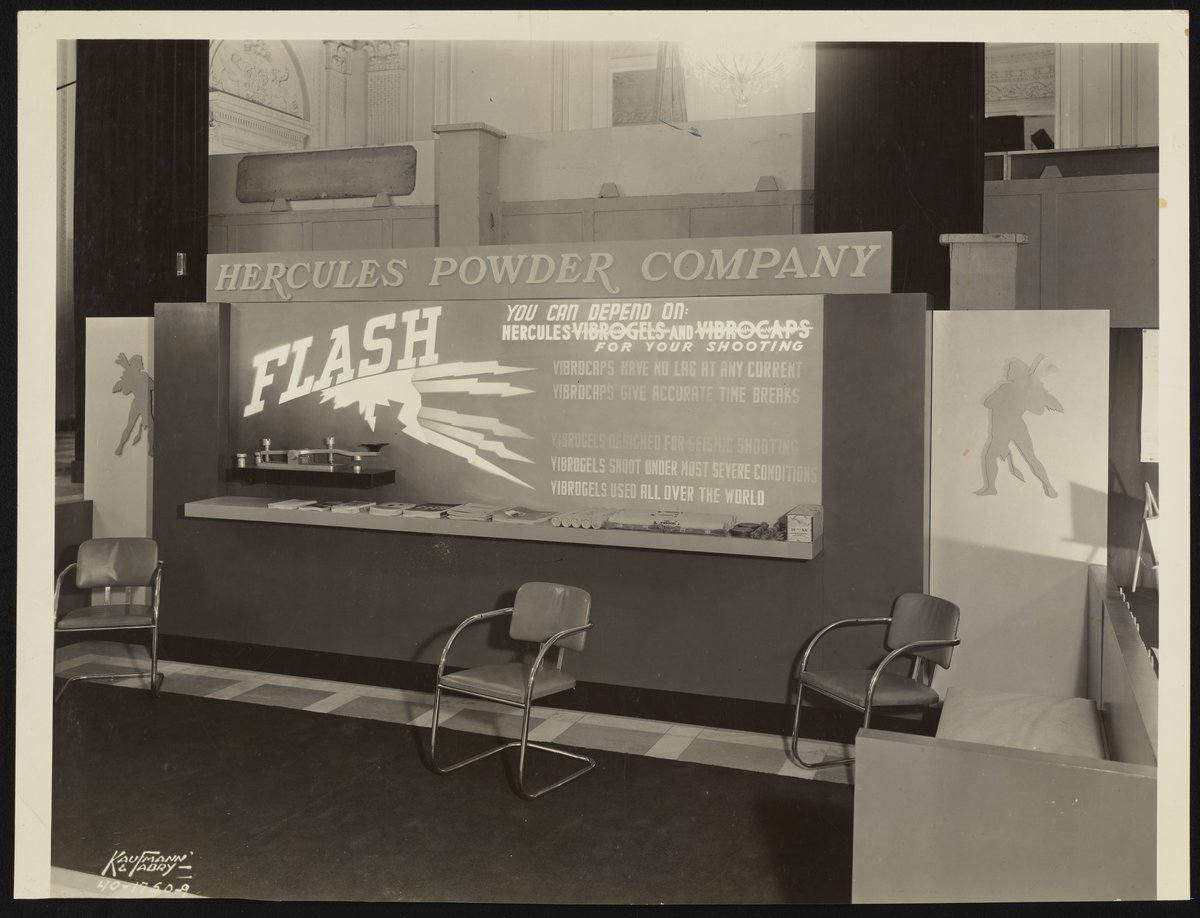 General view of an exhibition display promoting Vibrogel explosives and Vibrocap blasting caps manufactured and sold by the Hercules Powder Company.