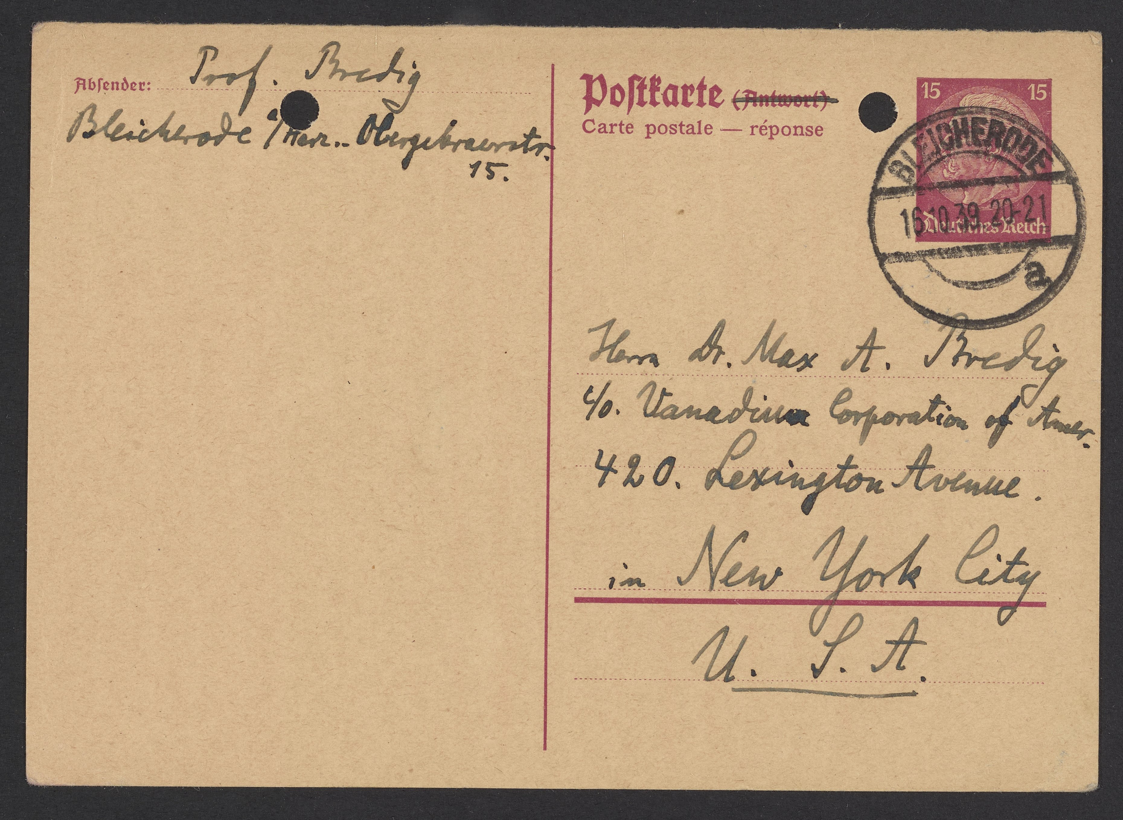 Postcard from Georg Bredig to Max Bredig, October 16, 1939