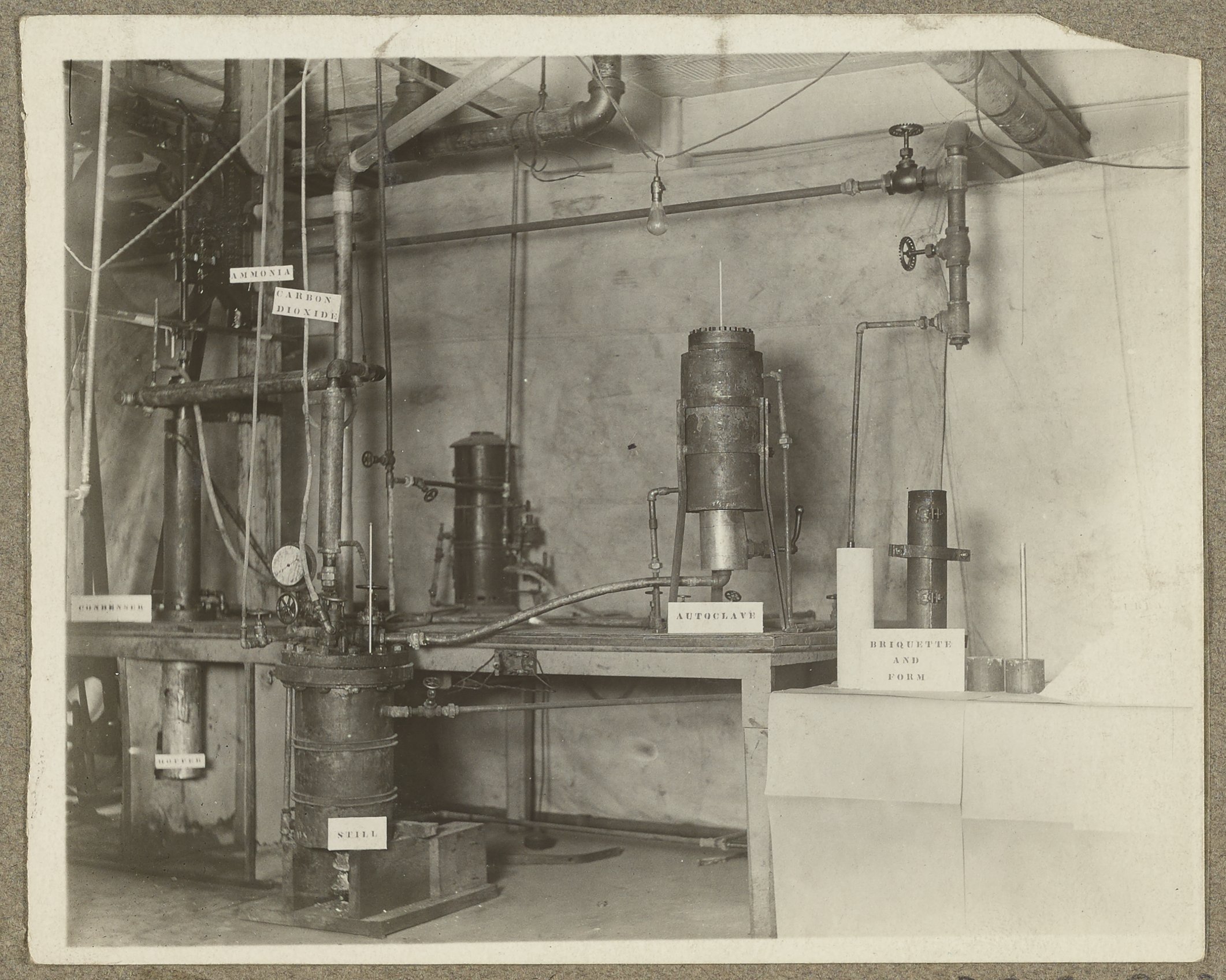 General view of an apparatus used to make urea from ammonium carbamate briquettes at the U.S. Department of Agriculture's Fixed Nitrogen Research Laboratory located in Washington, D.C. Urea is a water-soluble powder form of carbonic acid frequently used as a fertilizer and feed supplement. Various components of the apparatus are labelled, including an autoclave and still, as well as lines containing ammonia and carbon dioxide.