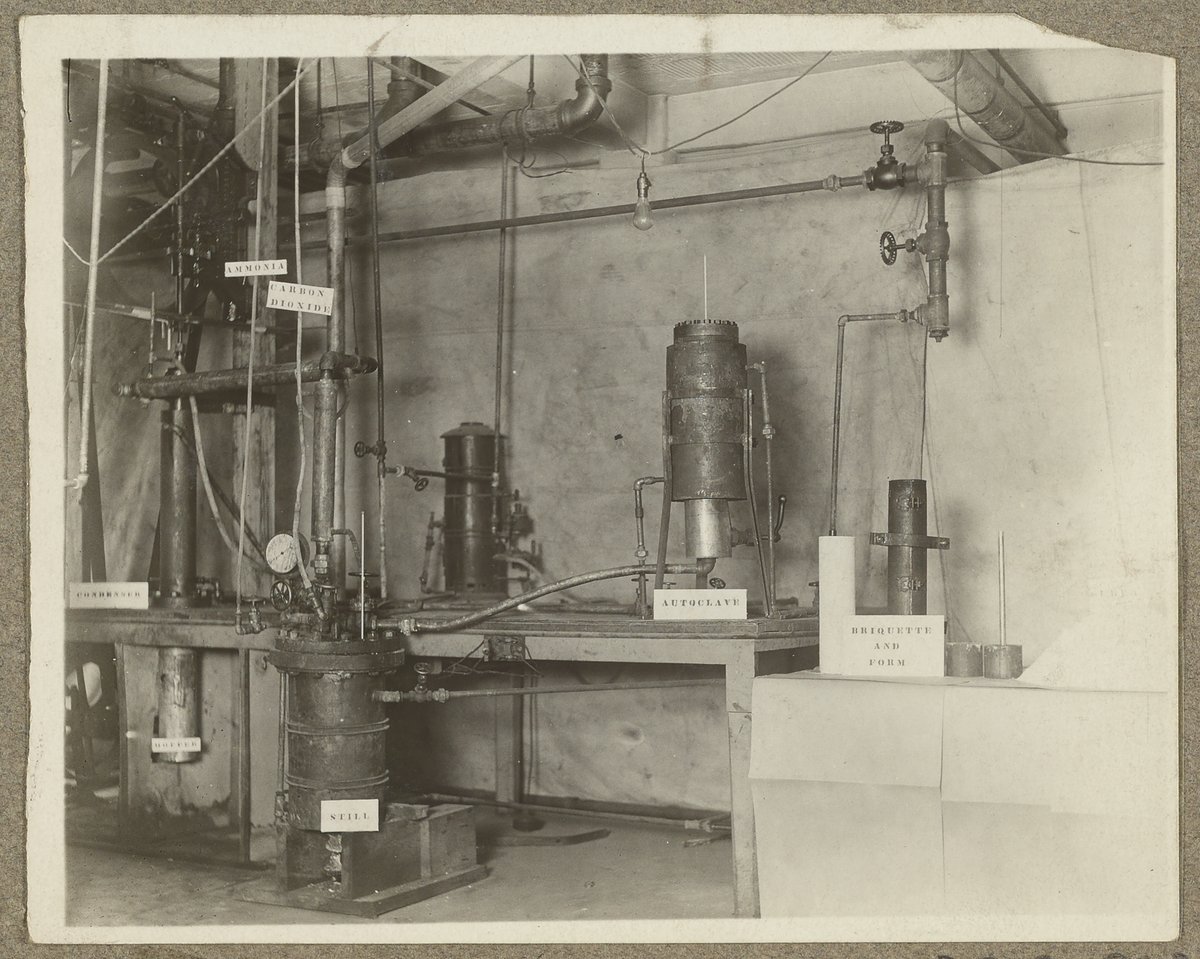 “Apparatus for Making Urea from Ammonium Carbamate Briquettes,” circa 1928. Travis P. Hignett Collection of Fixed Nitrogen Research Laboratory Photographs, Box 1. Science History Institute. Philadelphia. https://digital.sciencehistory.org/works/v118rd63p.