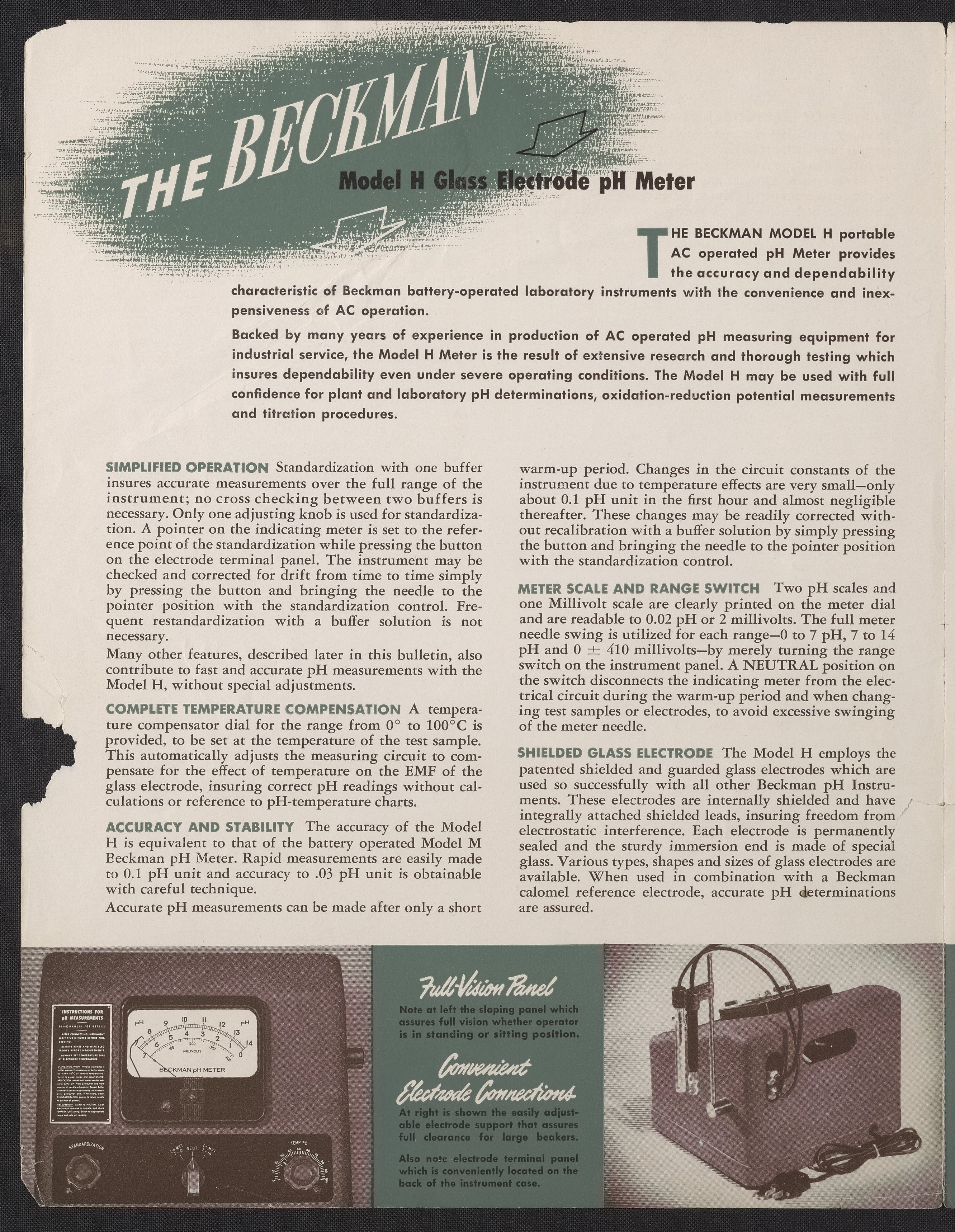 Promotional, color pamphlet for the Model H pH Meter.