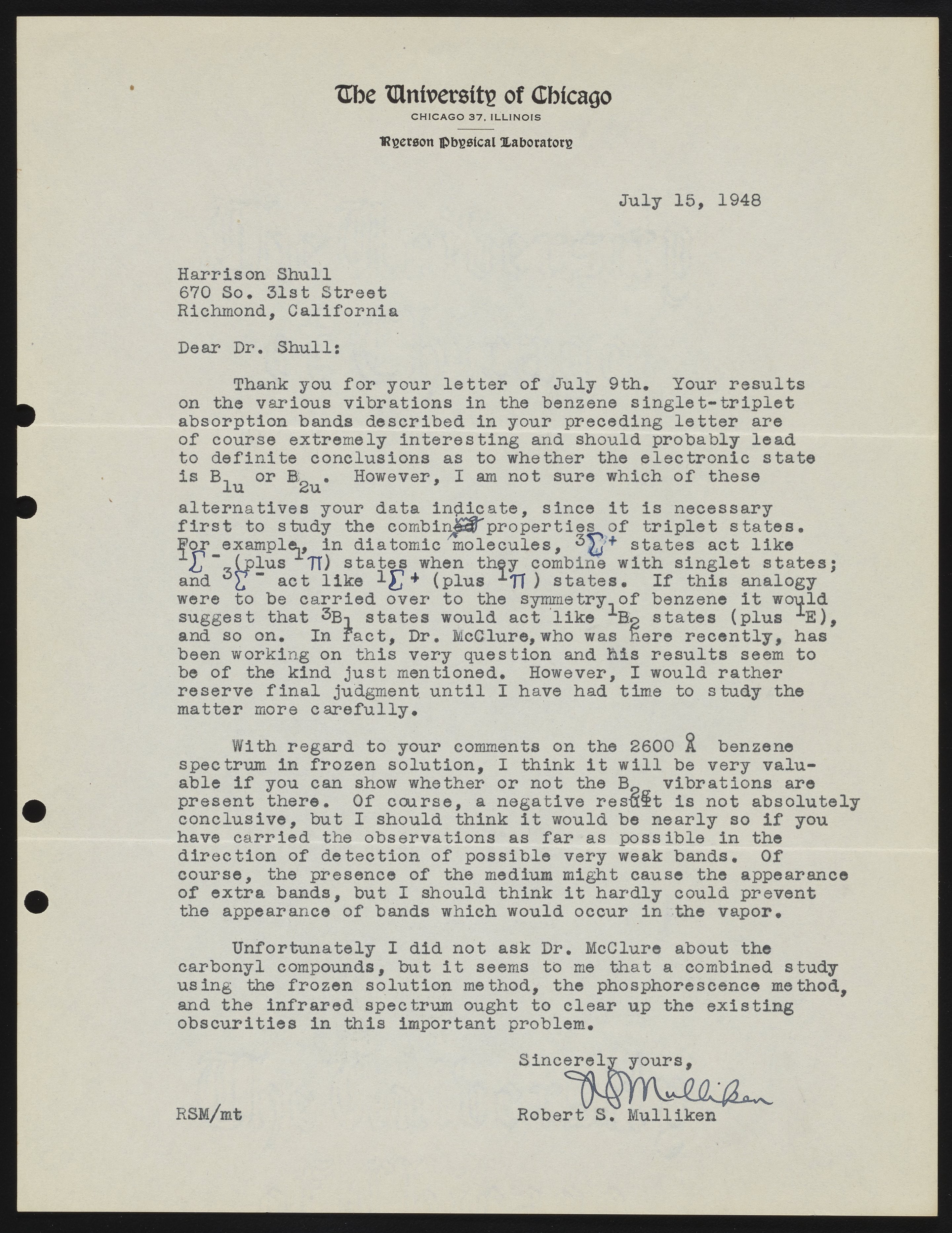 Letter between Robert S. Mulliken and Harrison Shull, American quantum chemists, discussing recent results on the study of benzene spectra by Shull.