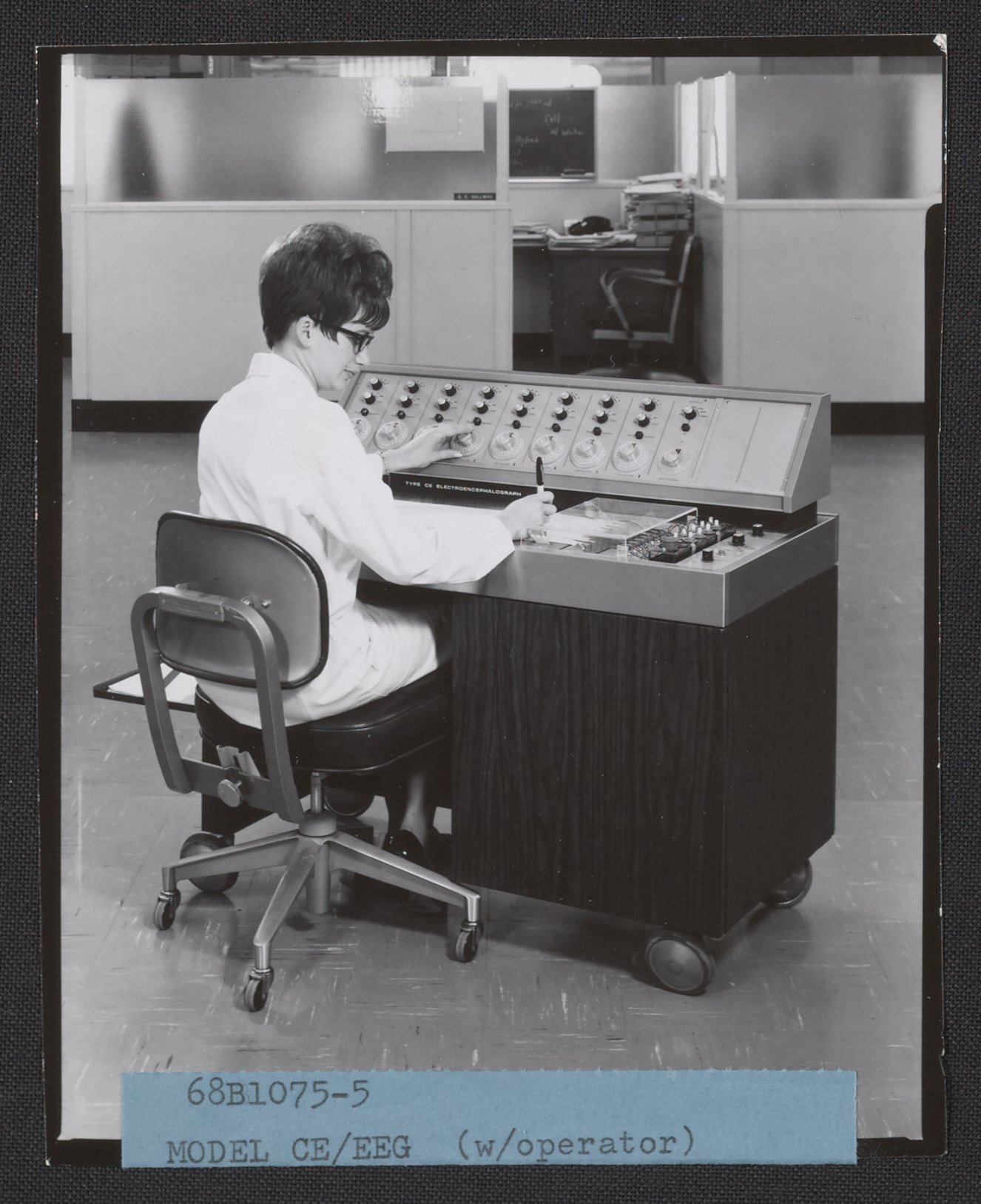 Beckman Instruments Photographic Services Section. “Woman Operating a Beckman Type CE EEG,” 1968. Beckman Historical Collection, Box 86. Science History Institute. Philadelphia. https://digital.sciencehistory.org/works/v405s988s.