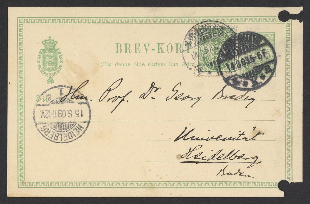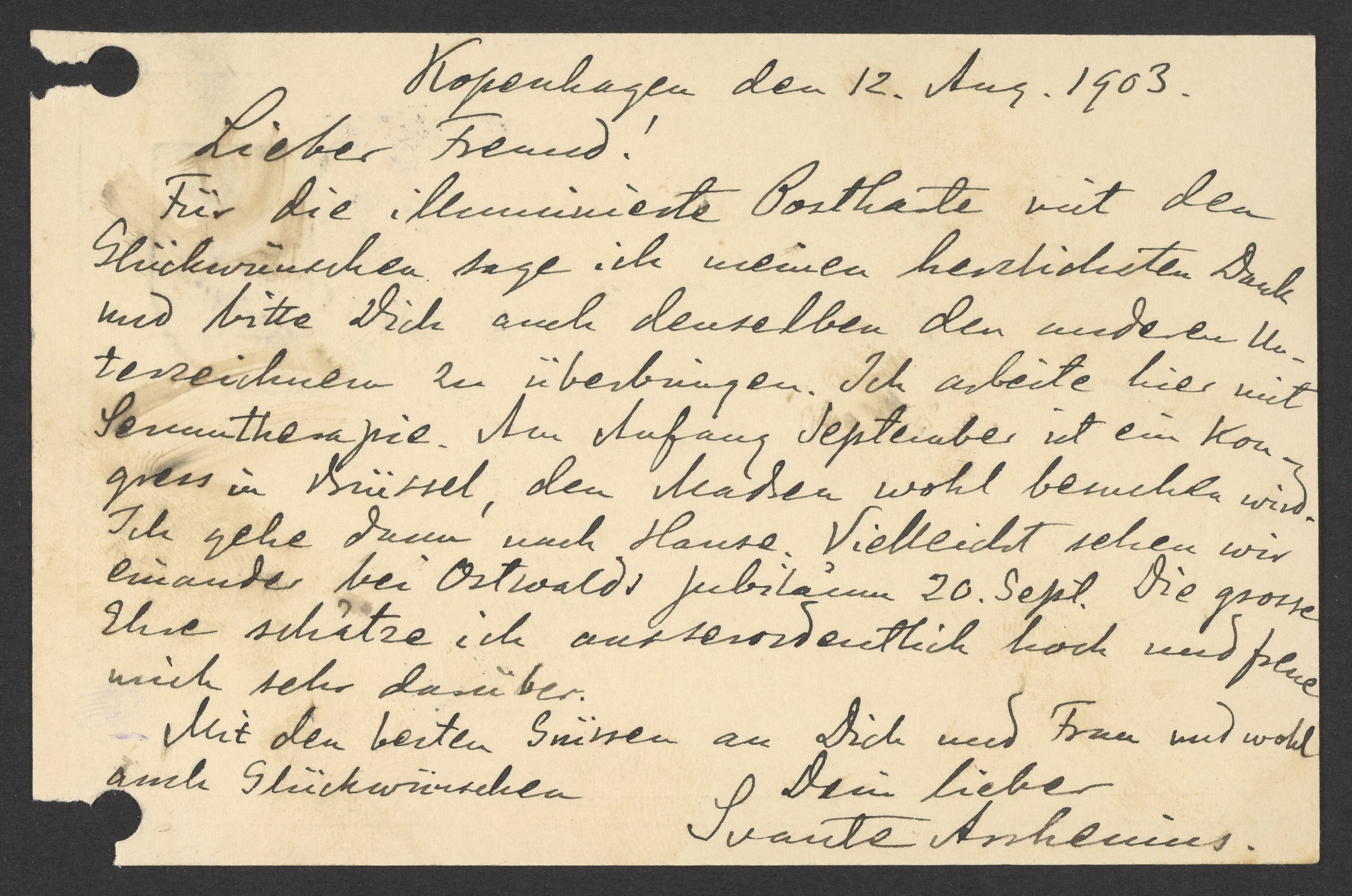 Postcard from Svante Arrhenius to Georg Bredig, August 1903