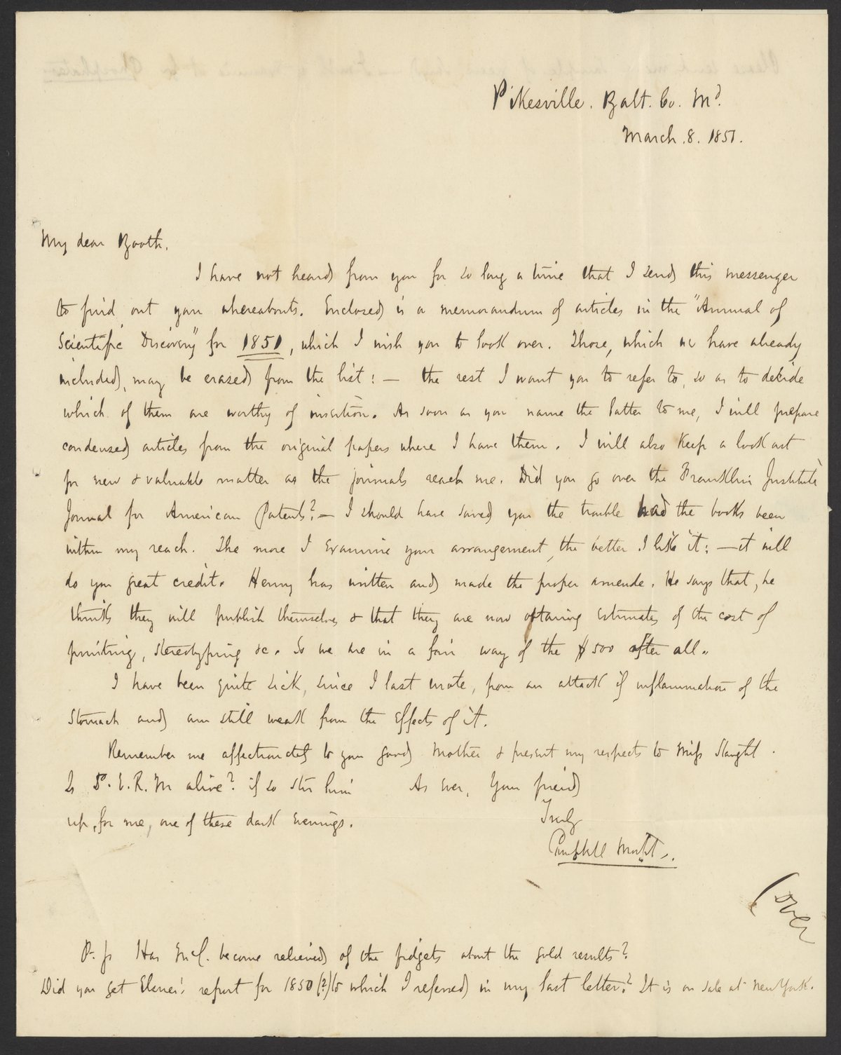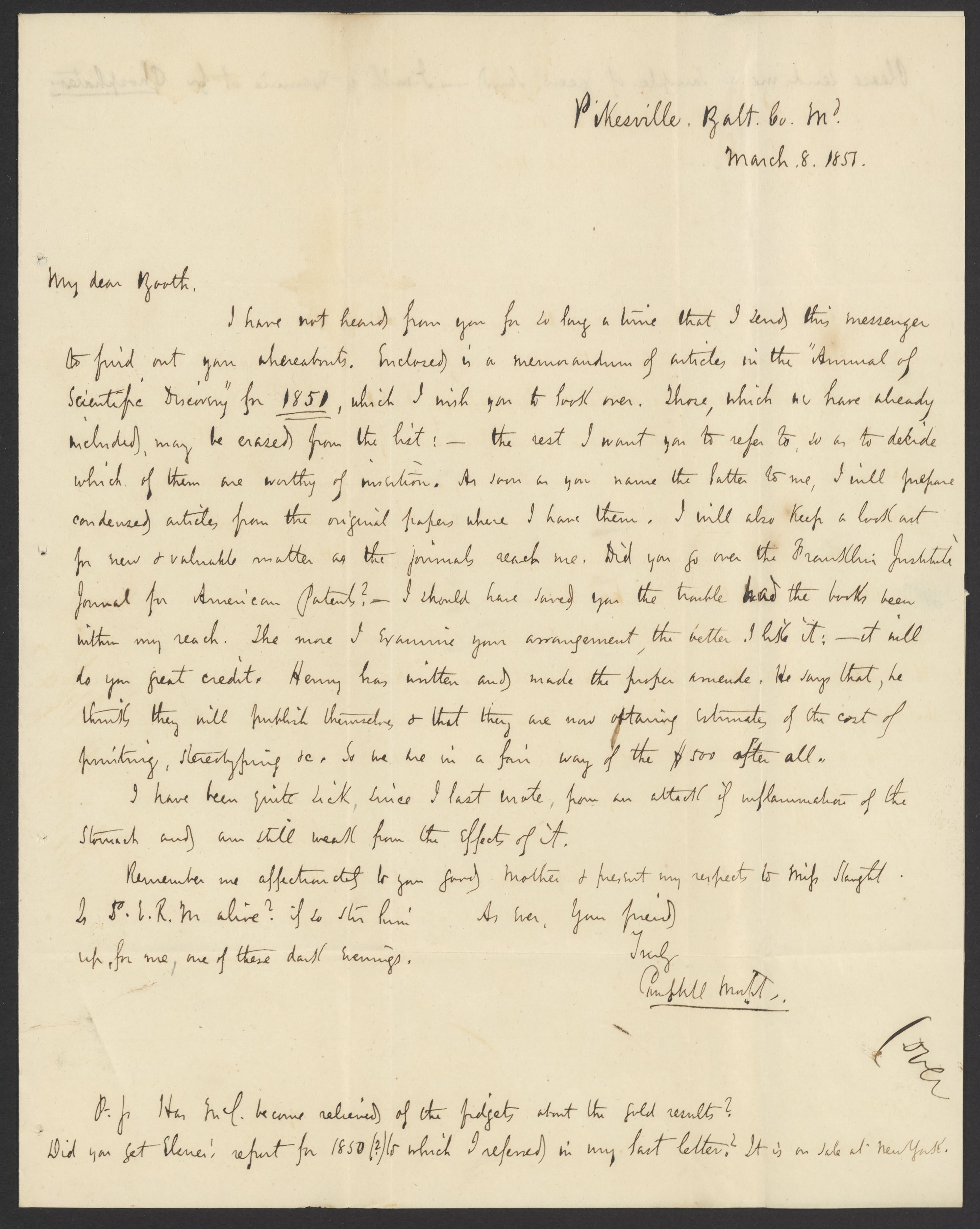 Small JPG1200 x 1505px — 230 KBLarge JPG2880 x 3612px — 910 KBFull-sized JPG3272 x 4104px — 1.1 MBOriginal fileTIFF — 3272 x 4104px — 38.5 MBCampbell Morfit (1820-1897), a distinguished chemist and co-editor with James Curtis Booth (1810-1888) of the Encyclopedia of Chemistry (1850), writes to Booth to request help locating some scientific articles.