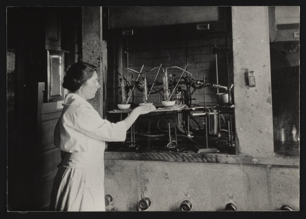 General view of a female employee analyzing unidentified substances in the Bureau of Chemistry's Pharmacognosy Laboratory. Part of the U.S. Department of Agriculture, the Pharmacognosy Laboratory supervised the manufacture and distribution of crude drugs, specifically those obtained from plants or other natural sources, and investigated methods for preventing waste and improving the utilization of such drugs.