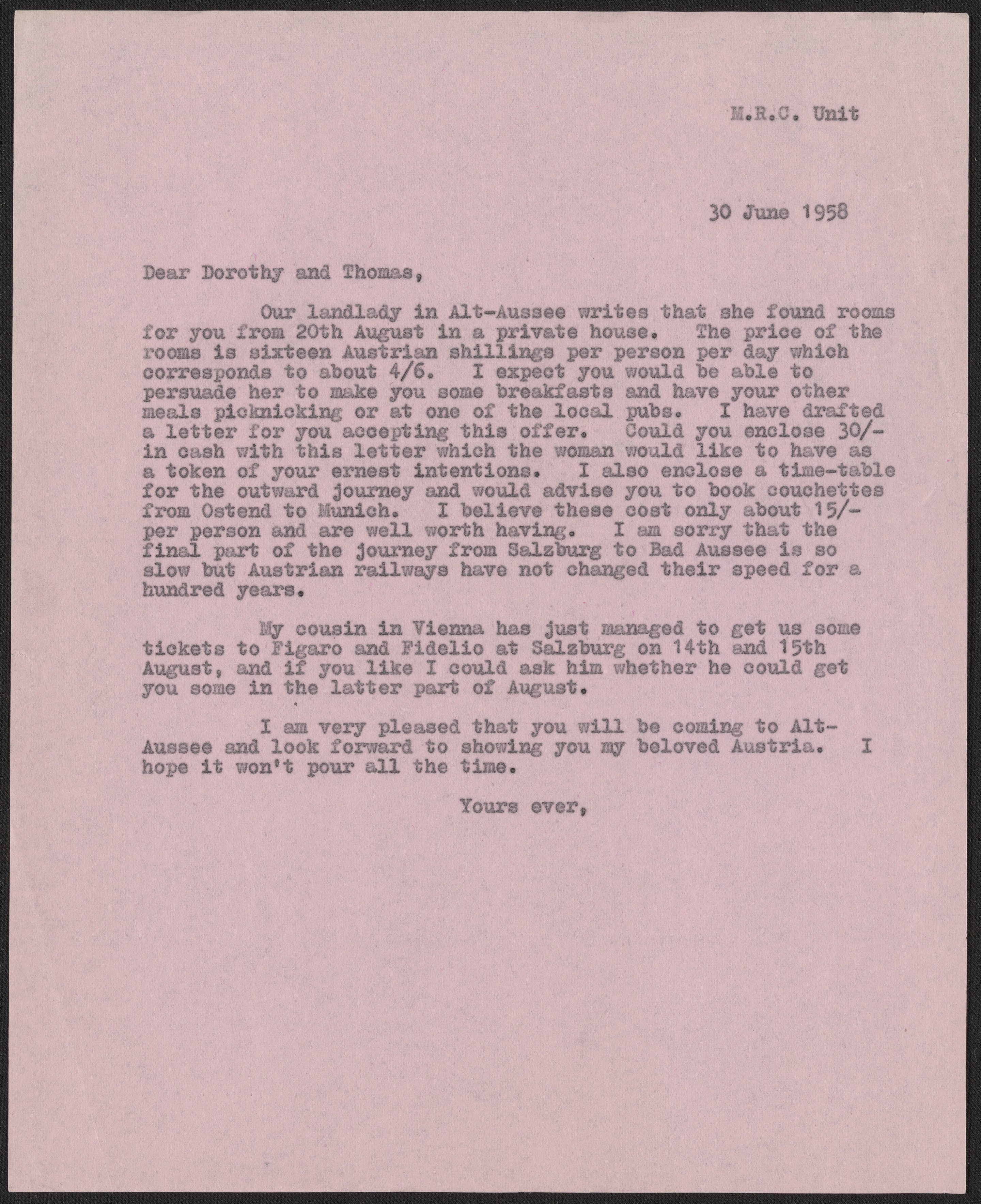 Letter from Max Perutz to Dorothy and Thomas Hodgkin, June 30, 1958