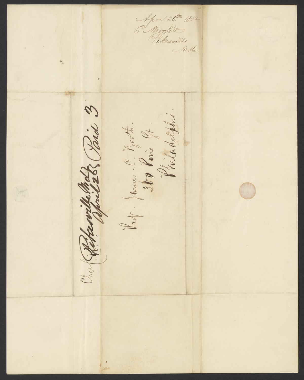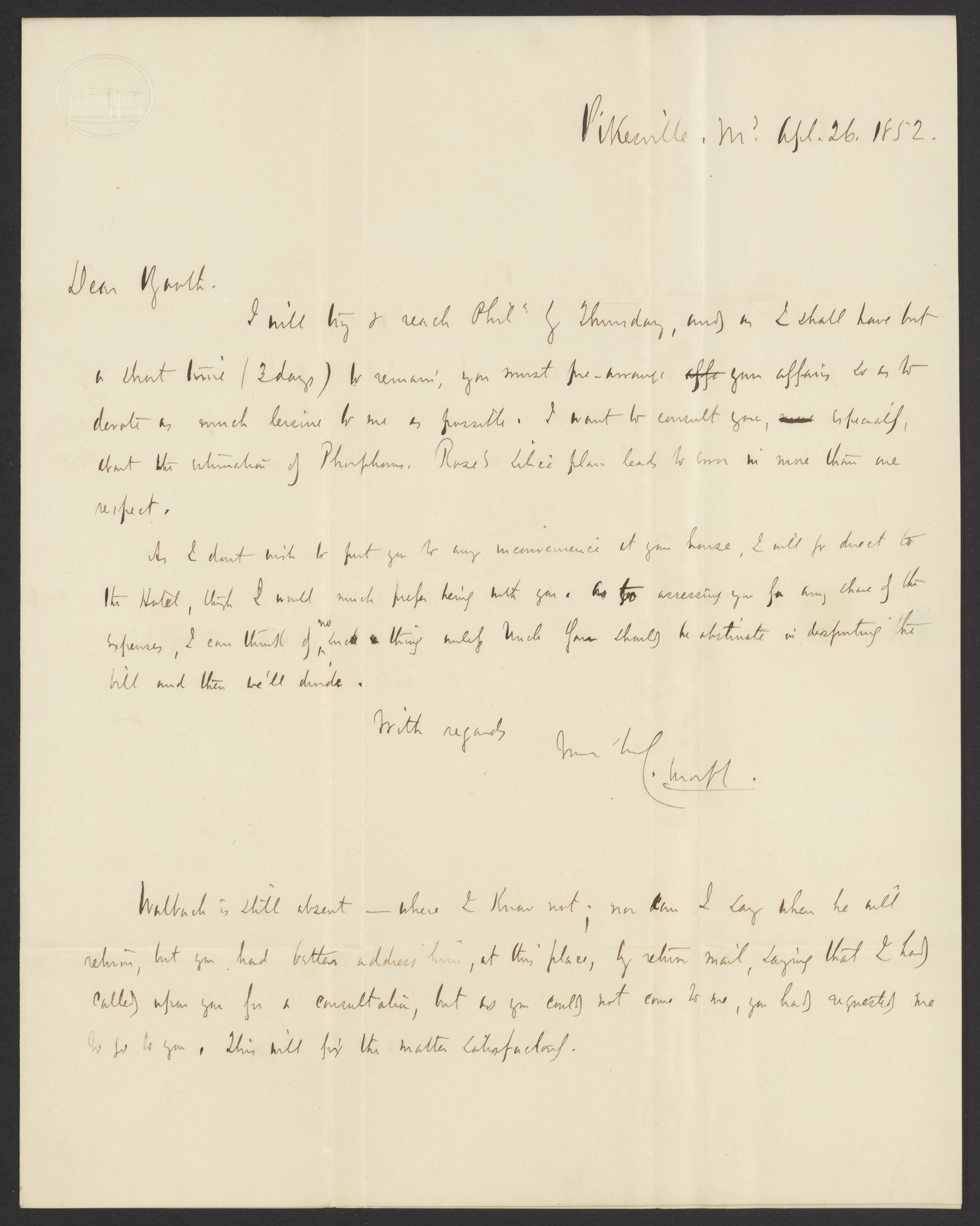 Small JPG1200 x 1502px — 151 KBLarge JPG2880 x 3604px — 674 KBFull-sized JPG3259 x 4078px — 828 KBOriginal fileTIFF — 3259 x 4078px — 38.1 MBCampbell Morfit (1820-1897), a distinguished chemist and co-editor with James Curtis Booth (1810-1888) of the Encyclopedia of Chemistry (1850), writes to Booth to plan a 3-day visit to Philadelphia to consult with Booth about “the estimation of Phosphorous.”