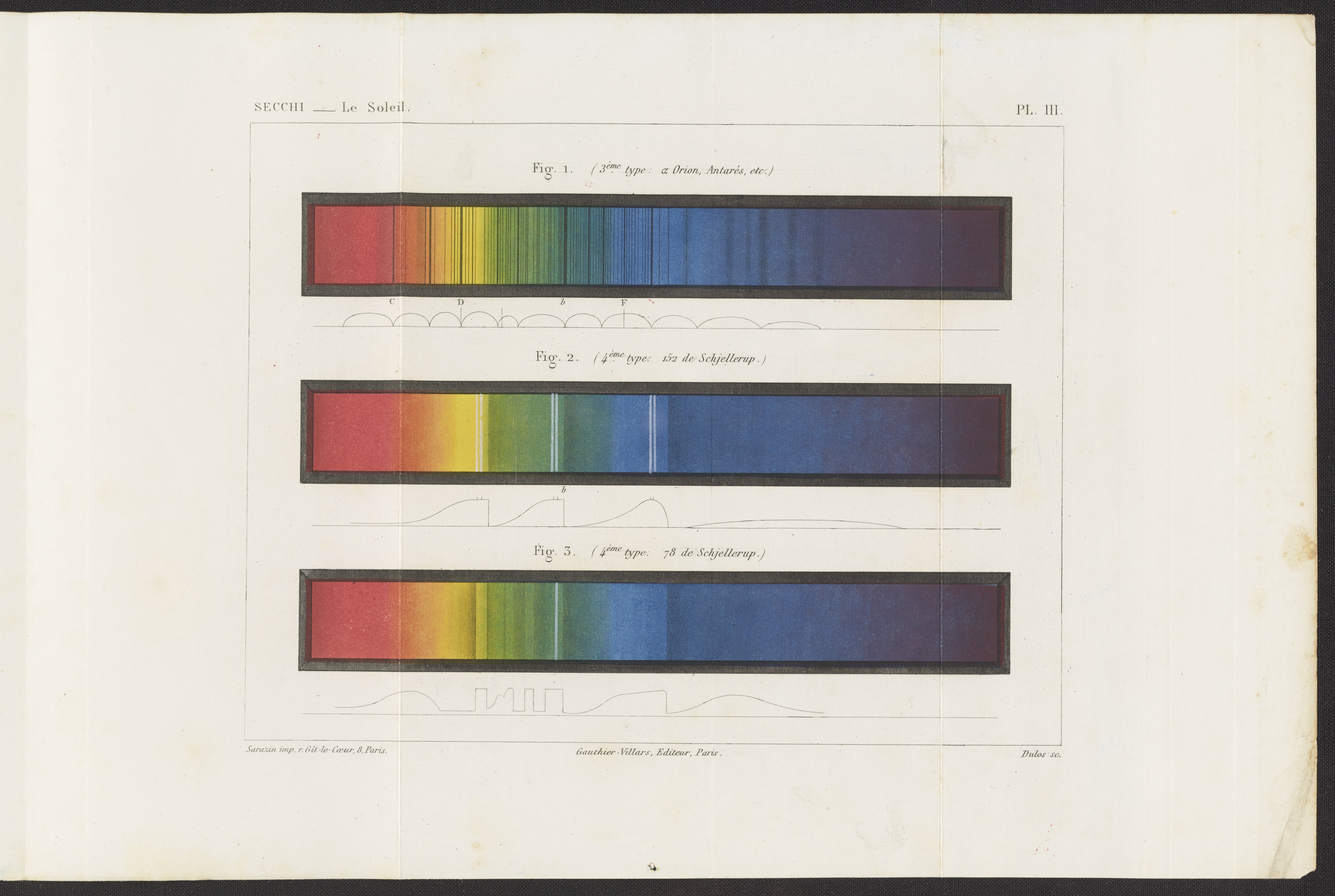 Secchi, Angelo. “Plate 3: Spectra of Secchi Star Classes III–IV.” In Le Soleil: Exposé Des Principales Découvertes Modernes Sur La Structure De Cet Astre, Son Influence Dans l'Univers Et Ses Relations Avec Les Autres Corps Célestes. Paris, France: Gauthier-Villars, 1870. https://digital.sciencehistory.org/works/v979v309v.