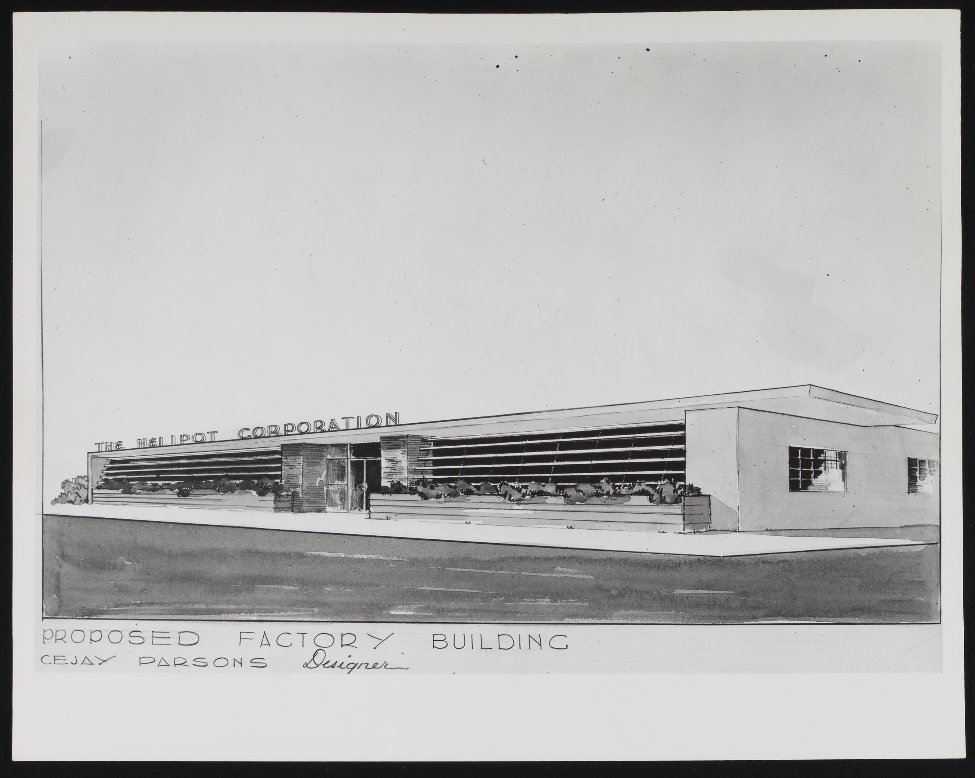 Parsons, Cejay. “Drawing of Proposed Factory Building for Helipot Corporation,” n.d. Beckman Historical Collection, Box 59, Folder 14. Science History Institute. Philadelphia. https://digital.sciencehistory.org/works/v979v323p.