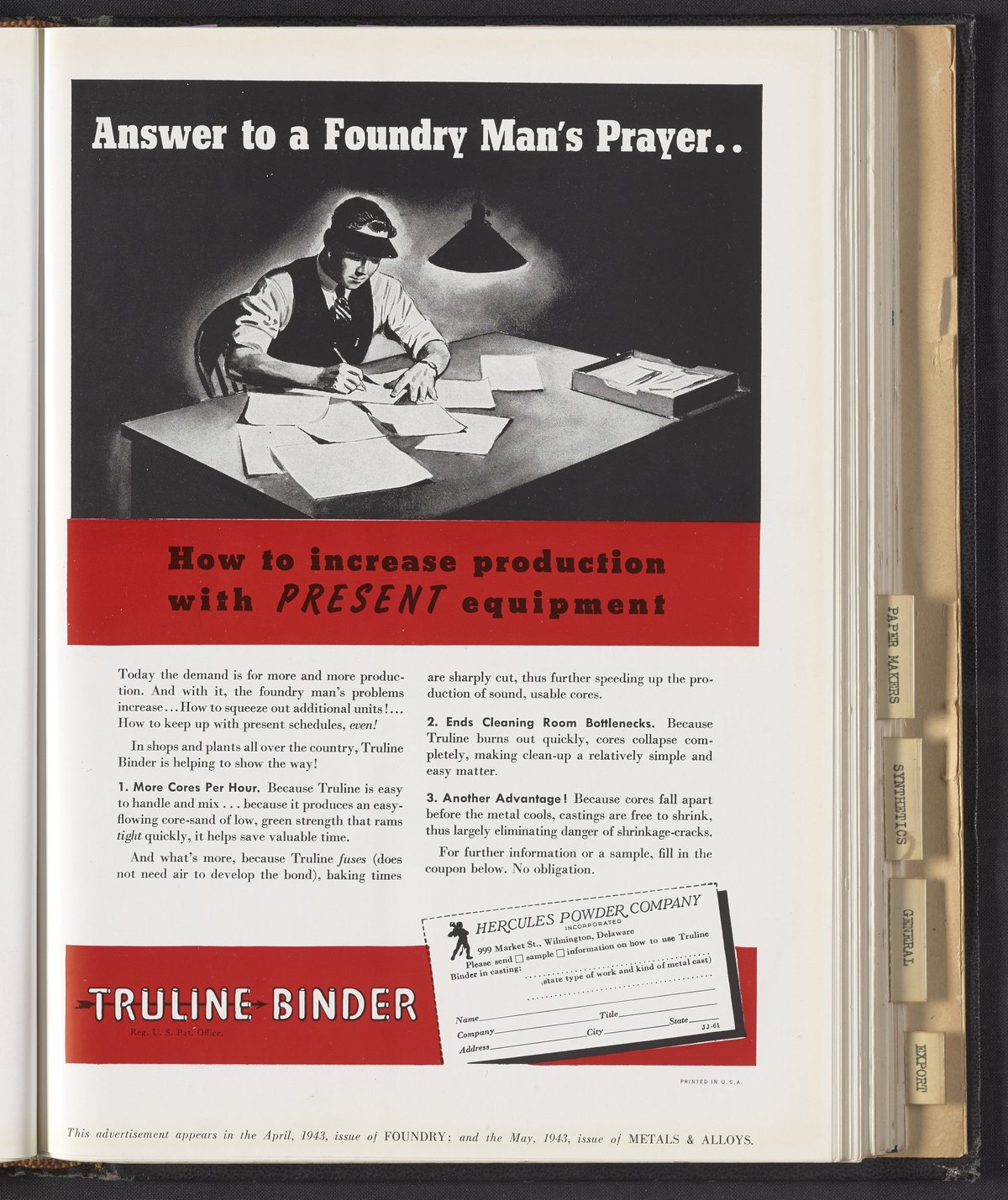 Hercules Incorporated. “Answer to a Foundry Man's Prayer...How to Increase Production with Present Equipment.” 1943 Hercules Advertisements, 1943. Records of Hercules Incorporated, Volume 1943. Science History Institute. Philadelphia. https://digital.sciencehistory.org/works/v979v397g.