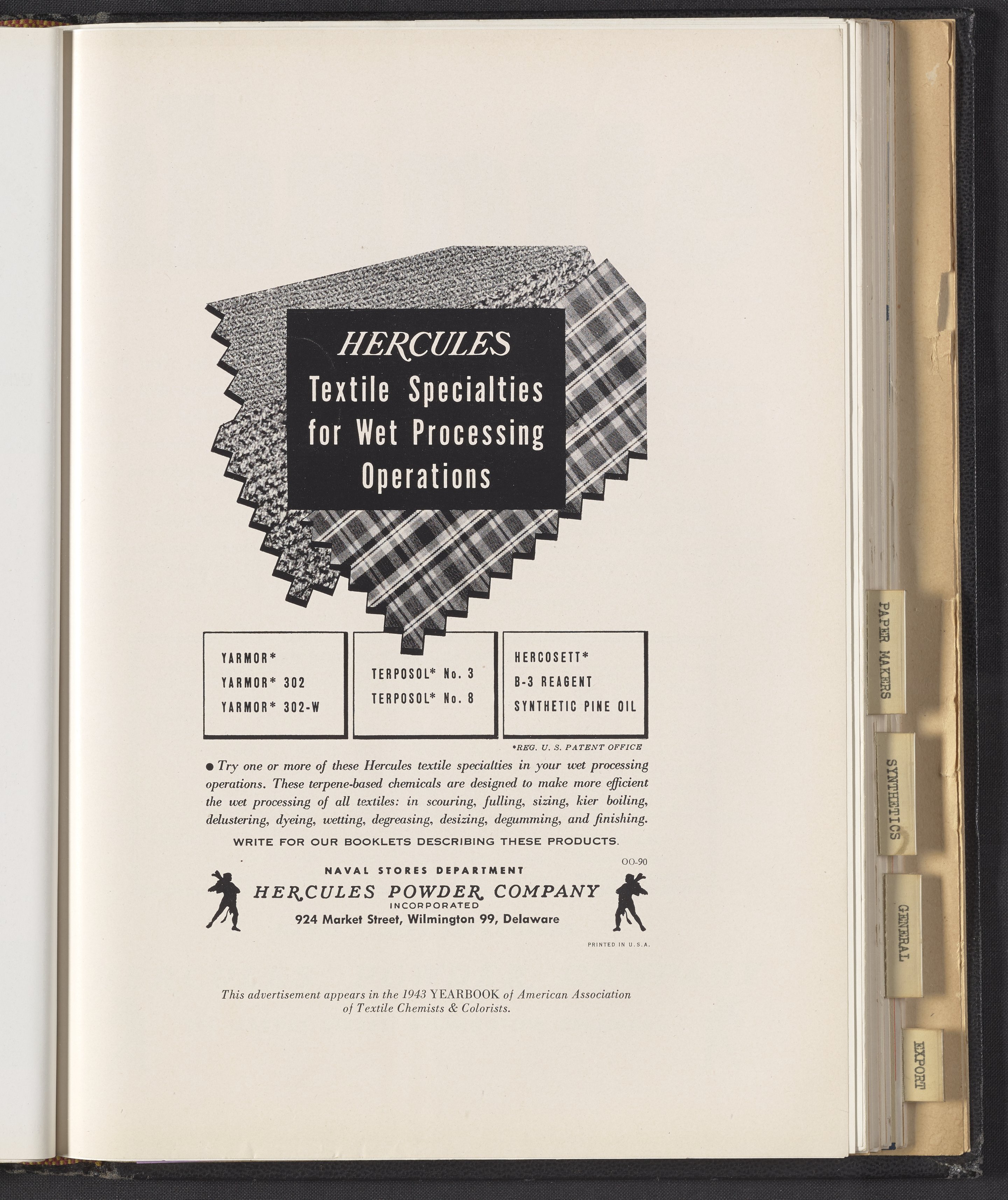 Advertisement for a range of terpene-based chemicals, including Yarmor Pine Oil, manufactured and sold by the Hercules Powder Company for use in the processing and production of textiles. This advertisement appeared in the 1943 Yearbook of the American Association of Textile Chemists & Colorists.