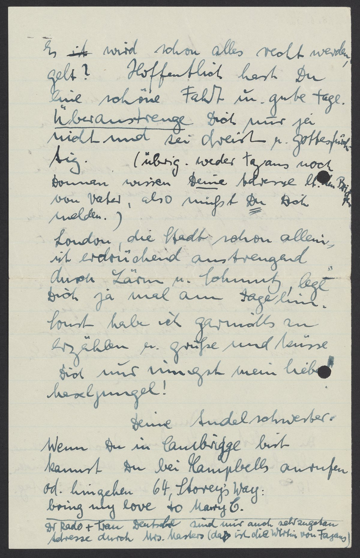 London, die Stadt schon allem, ist erdrückend anstrengend durch Lärm u. Löhnung, lege Dich ja mal am Tage hin. Auch habe ich gewollt zu erzählen u. grüsse und küsse Dich und sei gut mein liebes Herzjungel.