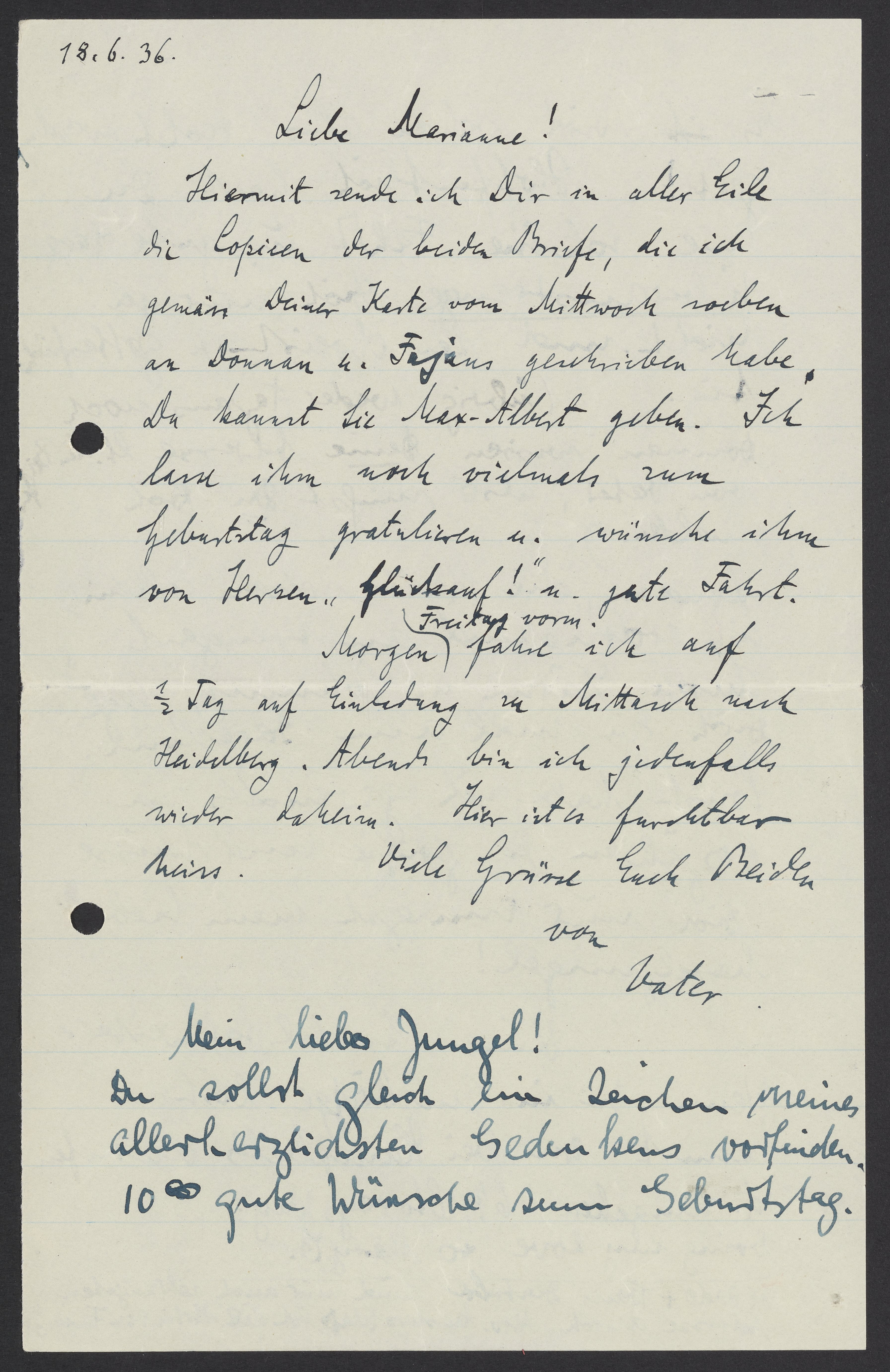 Hiermit sende ich Dir in aller Eile die Copien der beiden Briefe, die ich gemäss Deiner Karte von Mittwoch soeben an Donnan u. Fajans geschrieben habe. Du kannst sie Max-Albert geben. Ich kann ihm noch vielmals zum Geburtstag gratulieren u. wünsche ihm vom Herzen „Glückauf“ u. gute Fahrt.
