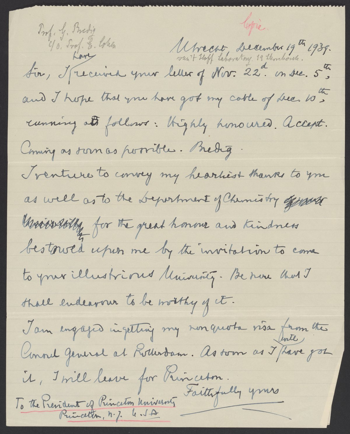 Letter from Georg Bredig (1868-1944) to Harold Willis Dodds (1889-1980), the president of Princeton University. Bredig thanks Dodds for the invitation to be a professor at Princeton and tells him he will be leaving as soon as possible.