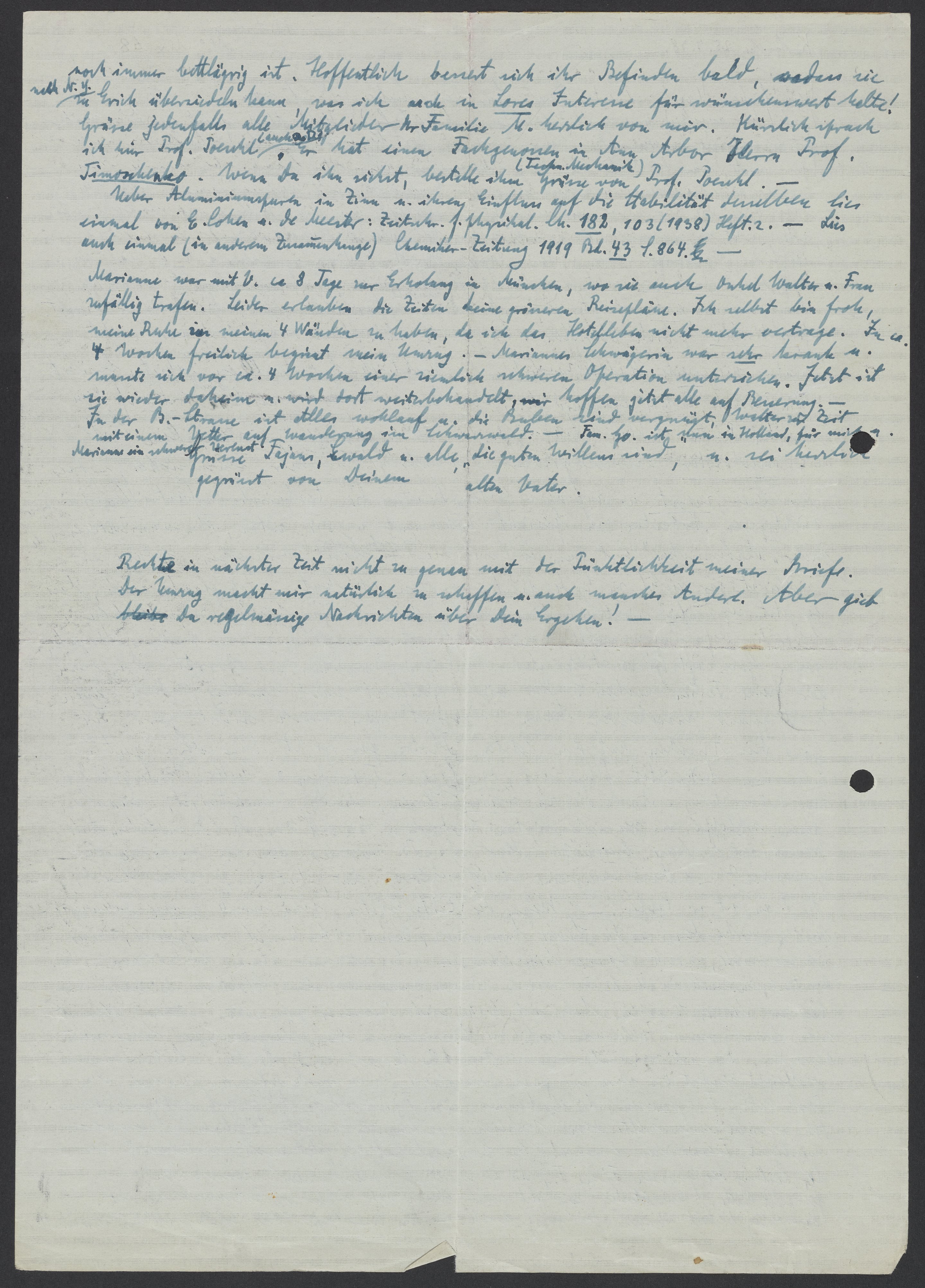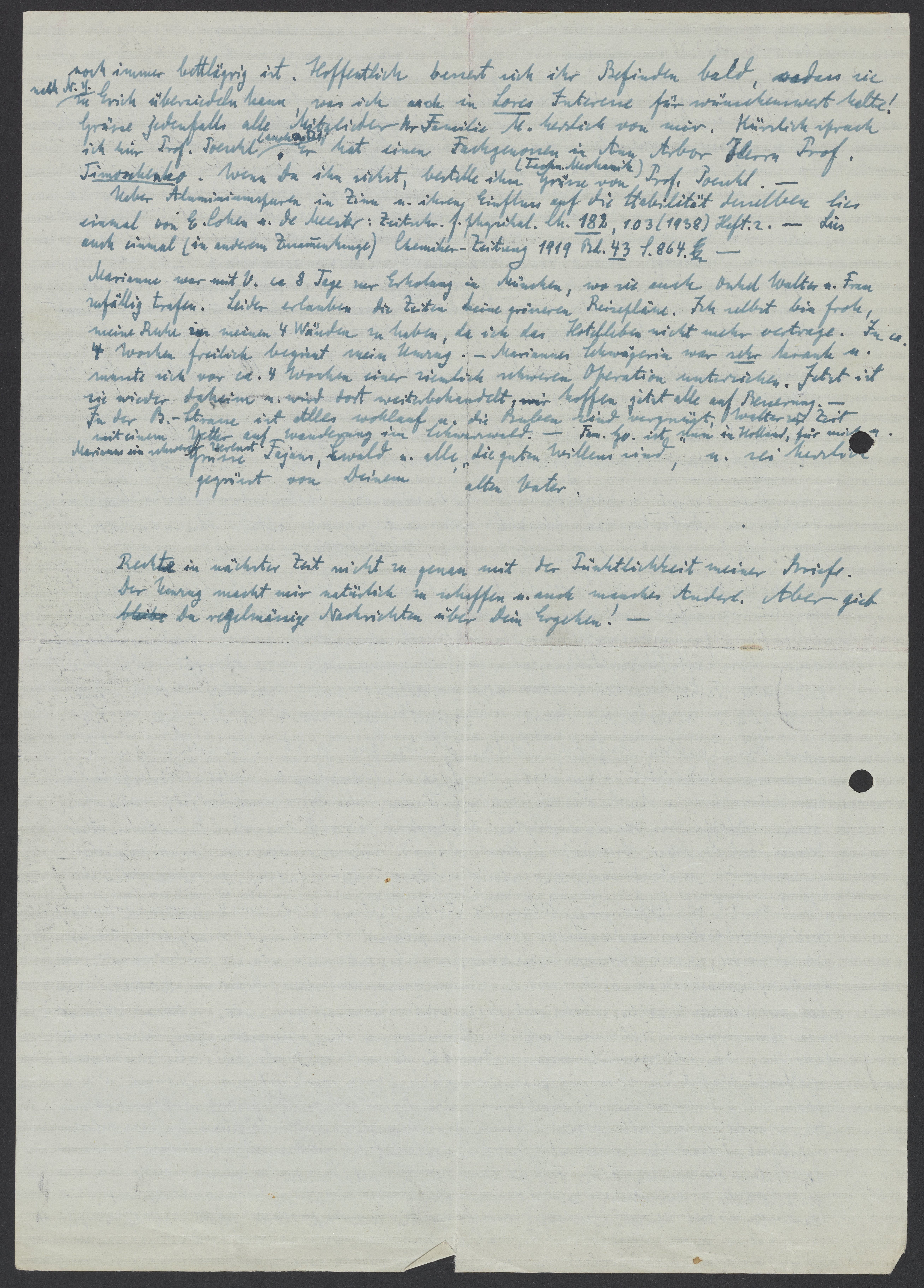 Marianne war mit Viktor ca. 8 Tage zur Erholung in München wo sie auch Onkel Walter u. Frau zufällig trafen. Leider erlauben die Zeiten keine grösseren Reisepläne. Ich selbst bin froh, meine Ruhe in meinen 4 Wänden zu haben, da ich das Hotelleben nicht mehr vertrage. In ca. 4 Wochen freilich beginnt die mein Umzug. – Mariannes Schwägerin war sehr krank u. musste ich vor ca. 4 Wochen einer ziemlich schweren Operation unterziehen. Jetzt ist sie wieder daheim u. wird dort weiterbehandelt. Wir hoffen jetzt alle auf Besserung. – In der. B-Strasse ist Alles wohlauf u. die Buben sind vergnügt, Walter zur Zeit mit einem Vetter auf Wanderung im Schwarzwald. – Familie Go. ist nun in Holland, fuer mich u. Marianne ein schwerer Verlust.