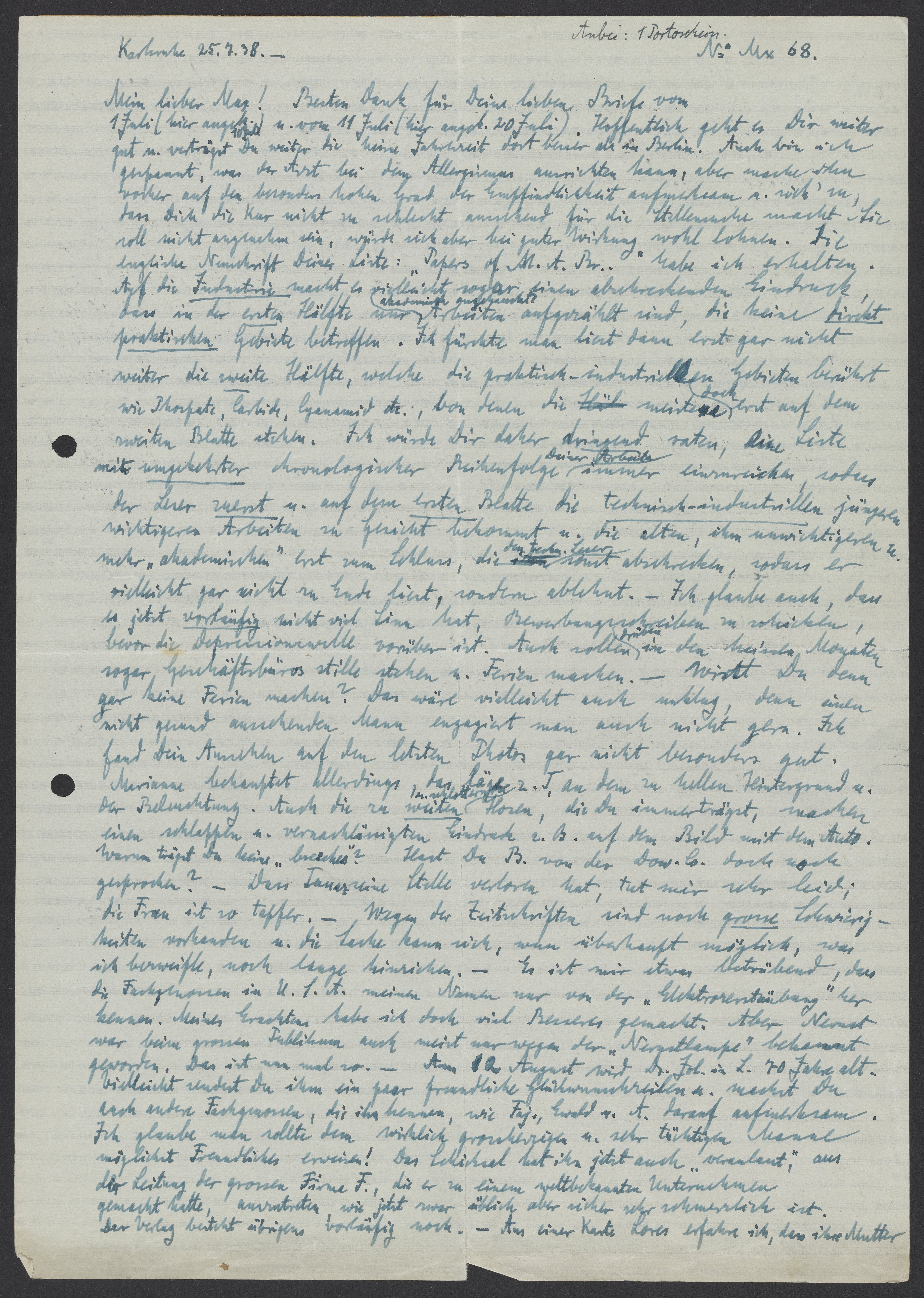 Mein lieber Max! Besten Dank fuer Deine lieben Briefe vom 1 Juli (hier angekommen 10 Juli) u. von 11 Juli (hier angekommen 20 Juli). Hoffentlich geht es Dir weiter gut u. verträgst Du weiter die heisse Jahrzeit dort besser als in Berlin. Auch bin ich gespannt, was der Arzt bei dem Allergismus ausrichten kann, aber mache Dich auf vorher auf den besonders hohen Grad der Empfindlichkeit aufmerksam u. sieh zu, dass Dich die Kur nicht zu schlecht aussehend für die Stellensuche macht. Sie sollte nicht angenehm sein, würde sich aber bei guter Wirkung wohl lohnen. Die englische Neuschrift Deiner Liste: „Papers of M.A.Br.“ habe ich erhalten. Auf die Industrie macht es vielleicht sogar einen abrechenden Eindruck, dass in der ersten Hälfte nur Arbeiten aufgezählt sind, die keine direkt praktischen Gebiete betreffen. Ich fürchte man liest dann erst gar nicht weiter die zweite Hälfte, welche die praktisch-industrielle Gebieten berührt wie Phosphate, Carbide, Cyanamid etc., von denen die meistens doch erst auf dem zweiten Blatt stehen. Ich würde Dir daher dringend raten, eine Liste mit umgekehrter chronologischer Reihenfolge Deiner Arbeiten immer einzureichen, sodass der Leser zuerst u. auf dem ersten Blatte die technisch-industriellen jüngeren wichtigsten Arbeiten zu Gericht bekommt u. die alten, ihm unwichtigeren u. mehr „akademischen“ erst zum Schluss, die den technischen Leser sonst abschrecken, sodass er vielleicht gar nicht zu Ende liest, sondern ablehnt. – Ich glaube auch, dass es jetzt vorläufig nicht viel Sinn hat, Bewerbungsschreiben zu schicken, bevor die Depressionswelle vorüber ist. Auch sollten drüben in den heissen Monaten sogar Geschäftbüros still stehen u. Ferien machen. – Wirst Du denn gar keine Ferien machen? Das wäre vielleicht auch unklug, denn einen nicht gesund aussehenden Mann engagiert man auch nicht gern. Ich fand Dein Aussehen auf den letzten Photos gar nicht besonders gut. Marianne behauptet allerdings, das läge zum Teil an dem zu hellen Hintergrund u. der Beleuchtung. Auch die zu weiten Hosen, die Du immer trägst, machen einen schlappen u. vernachlässigten Eindruck z.B. auf dem Bild mit dem Auto. Warum trägst Du keine „breeches“? Hast Du B. von Dow Company doch noch gesprochen? – Dass Tausz seine Stelle verloren hat, tut mir sehr leid; die Frau ist so tapfer. – Wegen der Zeitschriften sind noch grosse Schwierigkeiten vorhanden u. die Sache kann sich, nun ueberhaupt möglich, was ich bezweifele, nach lange hinziehen. – Es ist mir etwas betrübend, dass die Fachgenossen in U.S.A. meine Namen nur von der „Elektrozerstäubung“ her kennen. Meines Erachtens habe ich doch viel Besseres gemacht. Aber Nernst war beim grossen Publikum auch meist nur wegen der „Nernstlampe“ bekannt geworden.