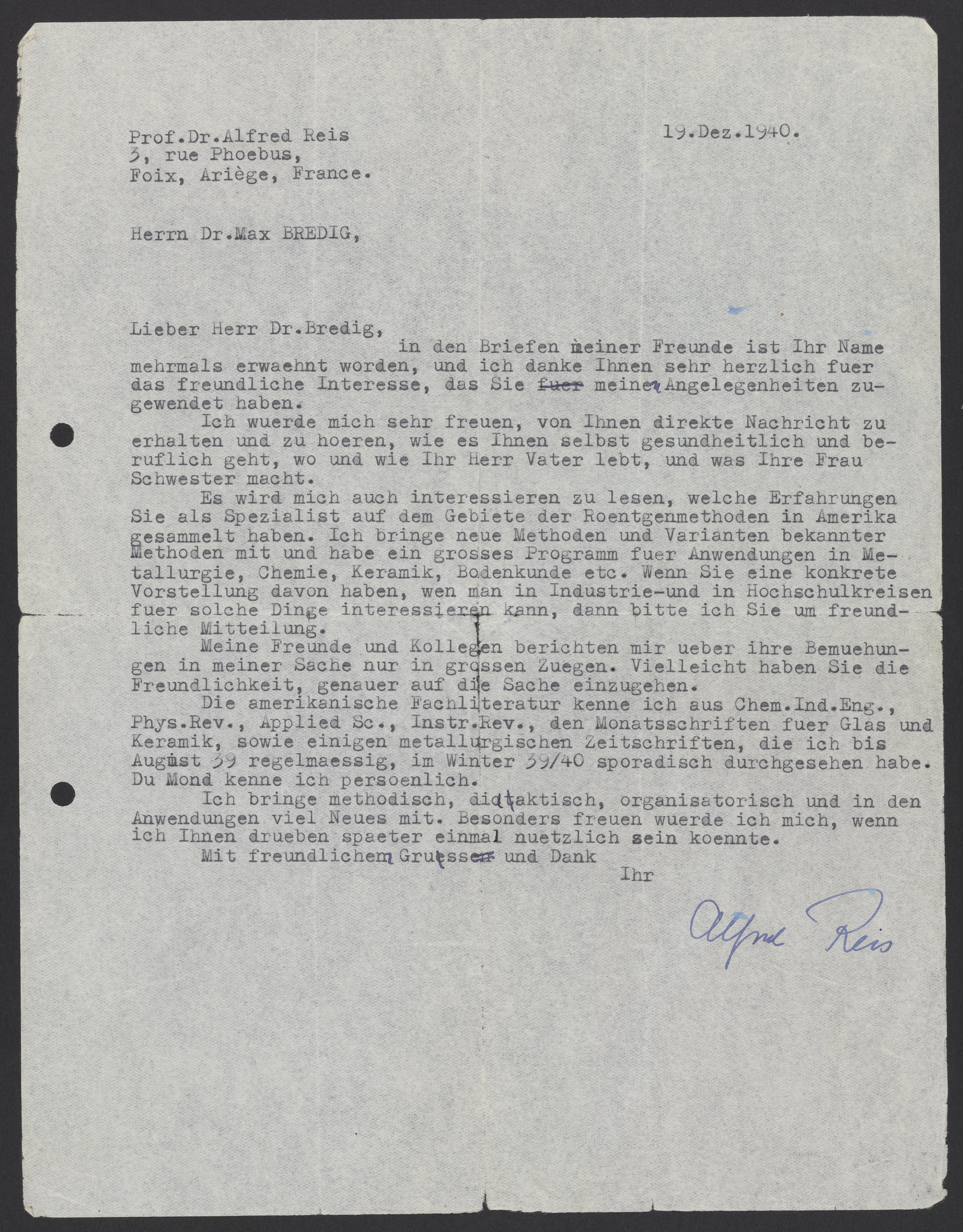 Reis, Alfred J. “Letter from Alfred Reis to Max Bredig, December 19, 1940,” December 19, 1940. Papers of Georg and Max Bredig, Box 9, Folder 5. Science History Institute. Philadelphia. https://digital.sciencehistory.org/works/ve1y645.