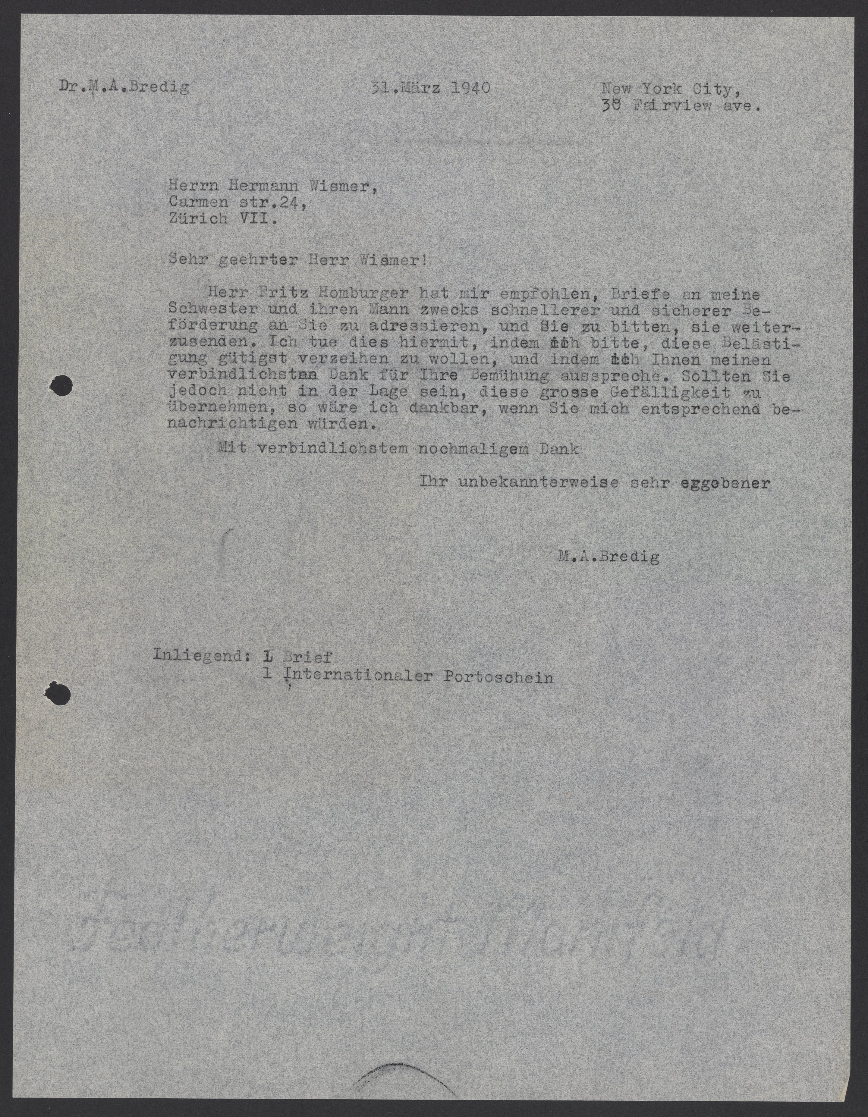Letter from Max Bredig to Hermann Wismer, March 1940