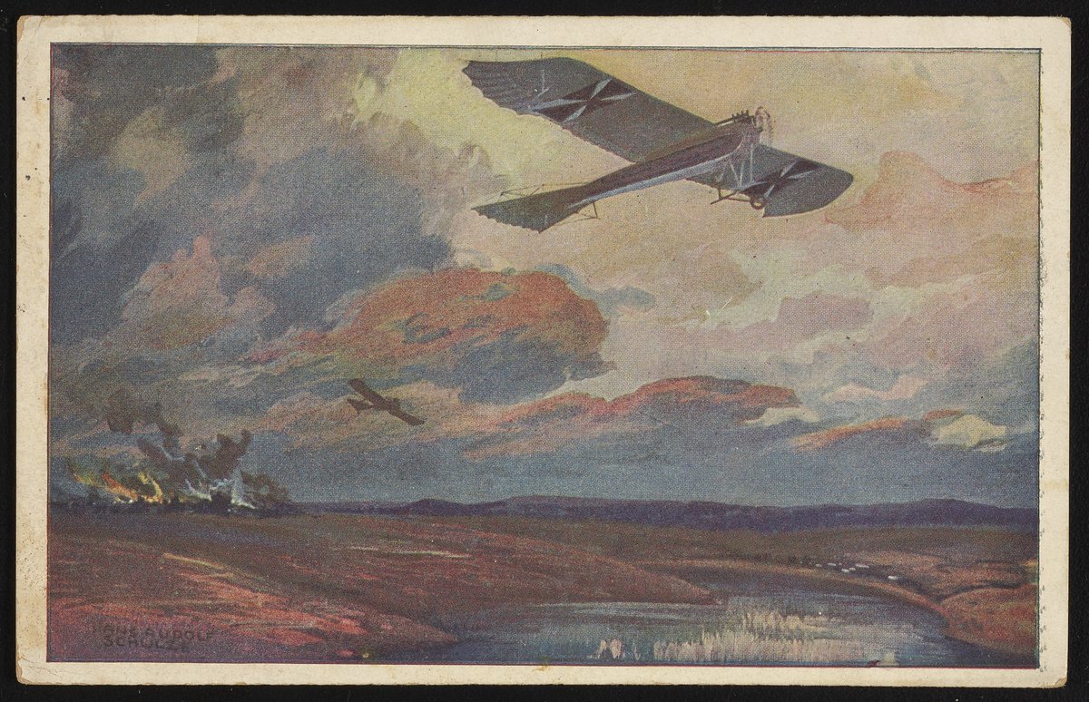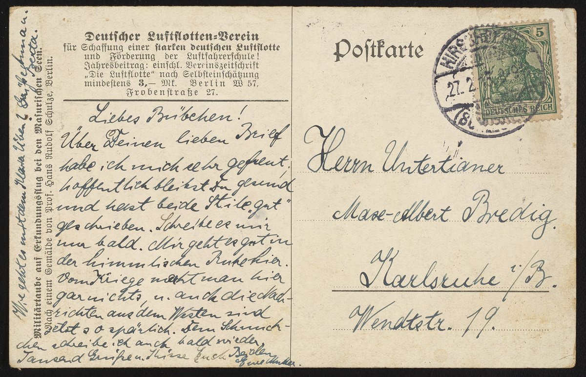 Small JPG1200 x 774px — 253 KBLarge JPG2880 x 1857px — 2.0 MBFull-sized JPG3421 x 2206px — 2.8 MBOriginal fileTIFF — 3421 x 2206px — 21.6 MBPostcard sent to Max Albert Bredig (1902-1977) from his mother, Rosa Bredig (1877-1933). The postcard features a painting titled "Militärtaube auf Erkundungsflug" by Hans Rudolf Schulze. The postcard was issued by the "Deutscher Luftflotten-Verein" (German Air Fleet Association), which aimed to promote a strong German air fleet and aviation schools.
