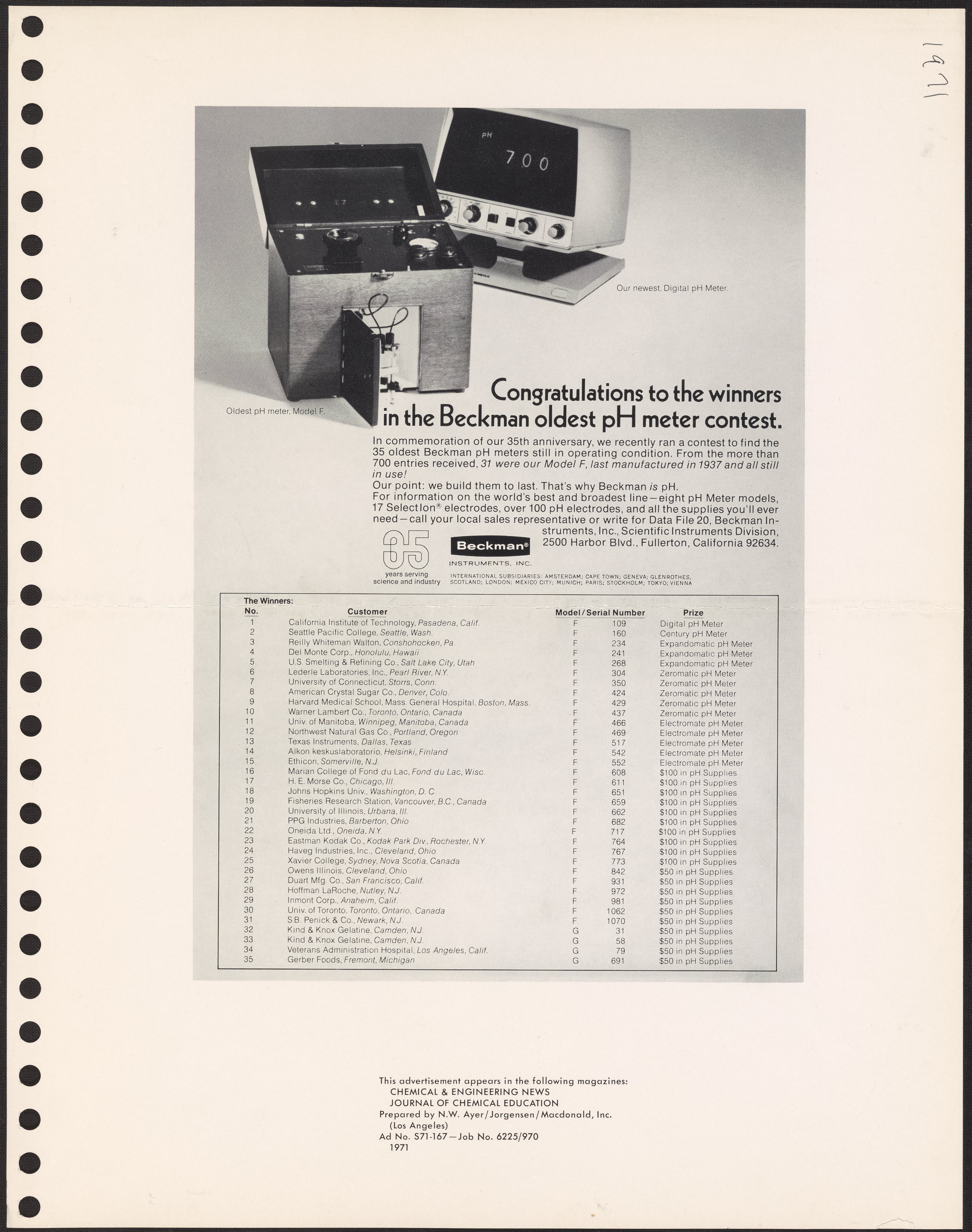 N.W. Ayer & Son, and Inc. Beckman Instruments. “Congratulations to the Winners in the Beckman Oldest PH Meter Contest,” 1971. Beckman Historical Collection, Box 18, Folder 27. Science History Institute. Philadelphia. https://digital.sciencehistory.org/works/vh53wv72q.