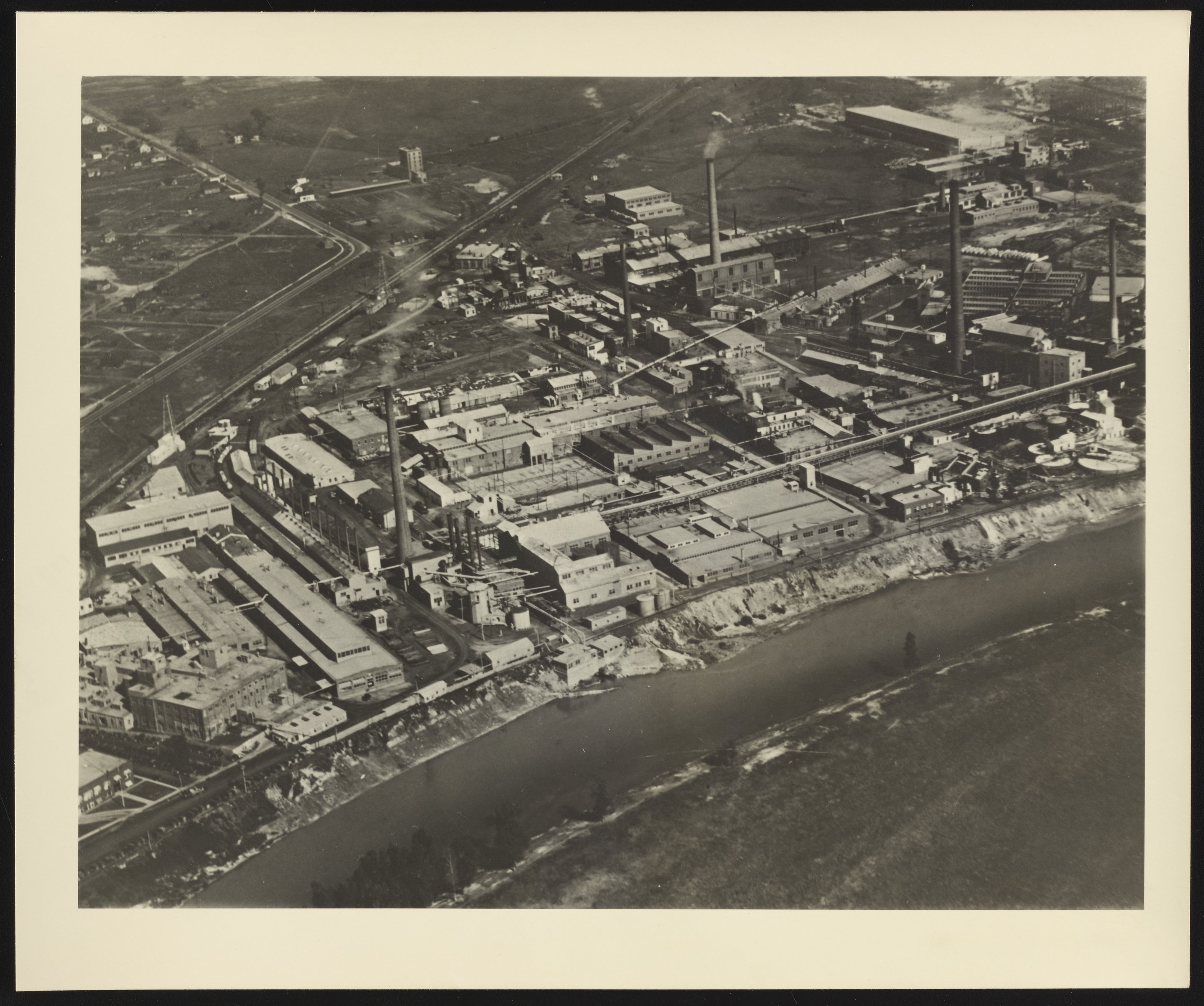 Dow Chemical Company. “Aerial View of Dow Chemical Company Facilities,” 1930–1939. Dow Chemical Company Historical Image Collection, Box Oversized Plants 2. Science History Institute. Philadelphia. https://digital.sciencehistory.org/works/vh53ww13r.